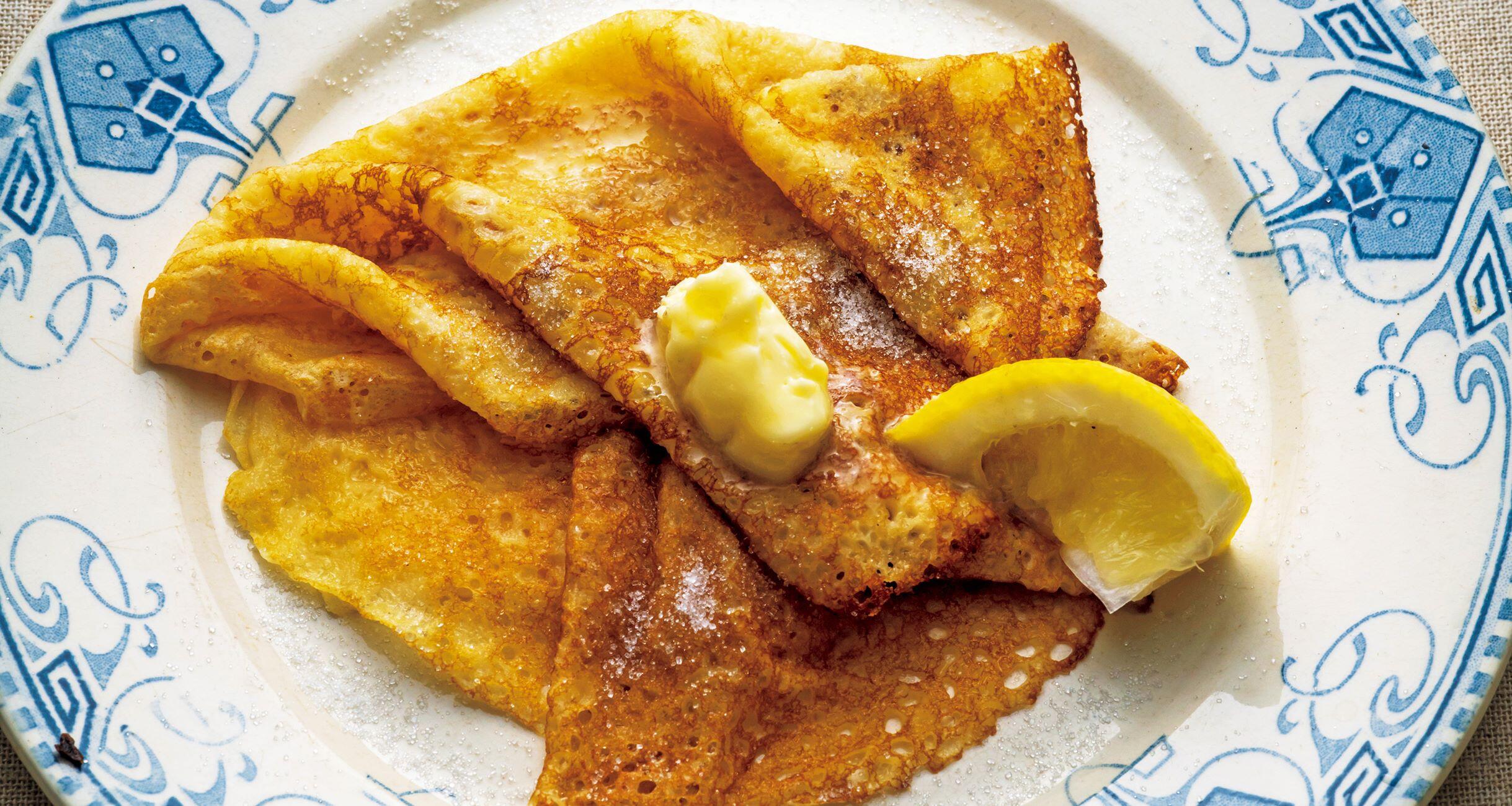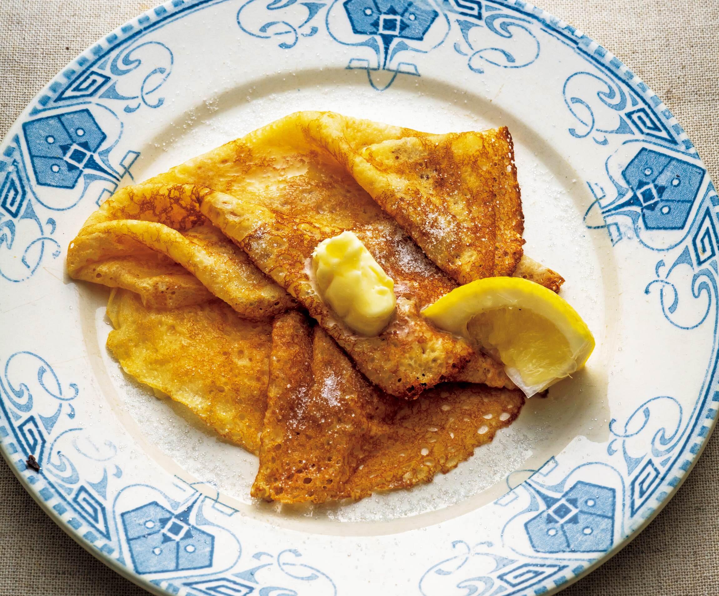 生地がクレープパンの縁から離れ始め、焼き色がついたら裏返し、もう片面もさっと焼く。器に広げて砂糖少々をふり、レモンを搾り、形よくたたんで、バターをのせる。仕上げに砂糖をふる。
