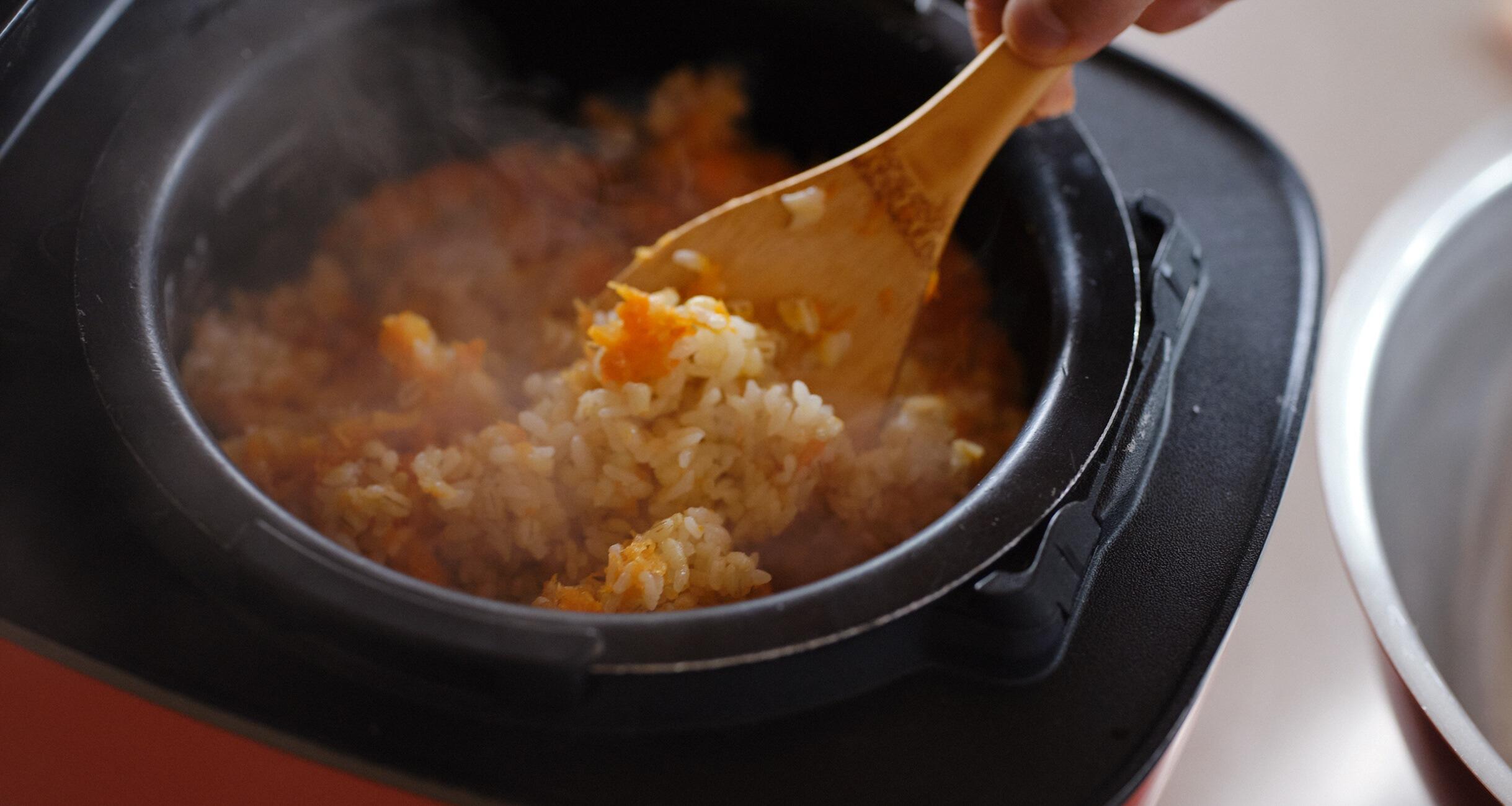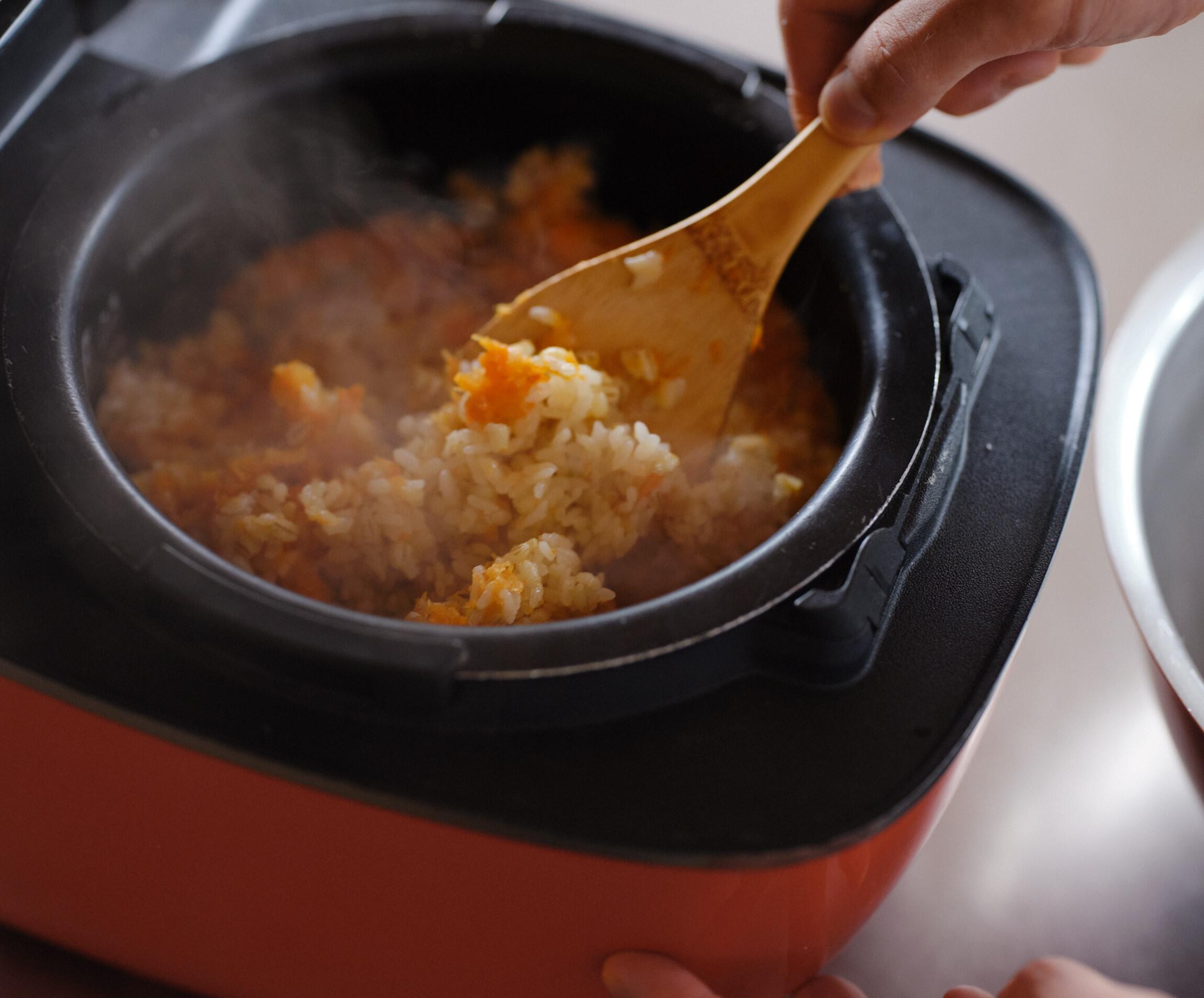 炊飯器に入れて3合の目盛りまで水を入れ、にんじんと油を加えて炊く。
