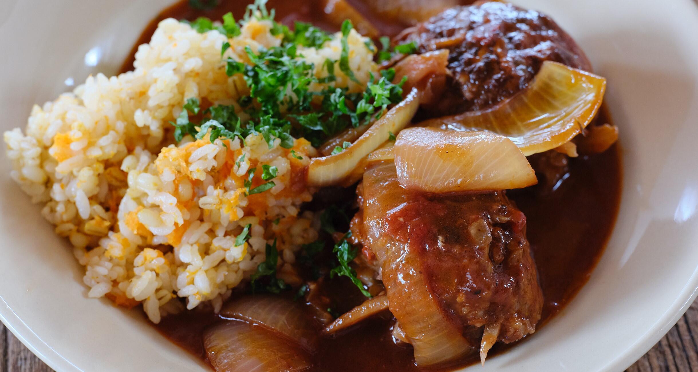 ③のフライパンに残った脂を軽く拭き取り、赤ワインを入れて焦げ目をこそげ取りながら沸かす。別の深さのあるフライパンを強火にかけ、バターを入れて溶かし、玉ねぎを炒める。トマトを加えてさっと炒め、Bと沸かした赤ワイン、③で取り出したハンバーグを加え、20分ほど煮込み、塩小さじ1強を加える。にんじんライスとともに器に盛り、あればパセリのみじん切りをかける。