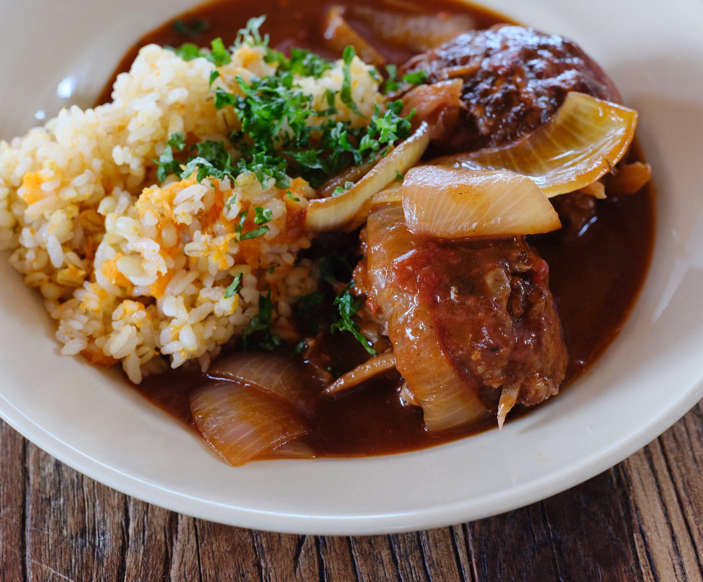 スタッフの賄いとして人気のメニュー。もともとパン・ド・ロデヴに合うと思ってつくったけれど、にんじんライスとマッシュポテトを添えるのも最高です。