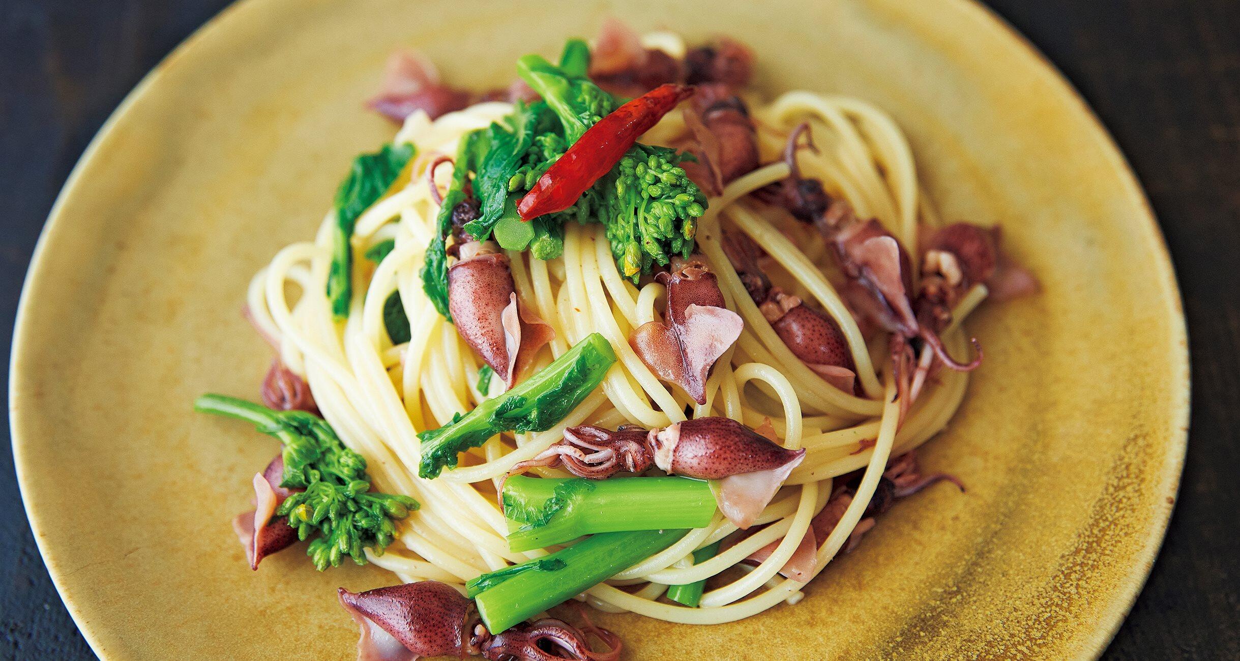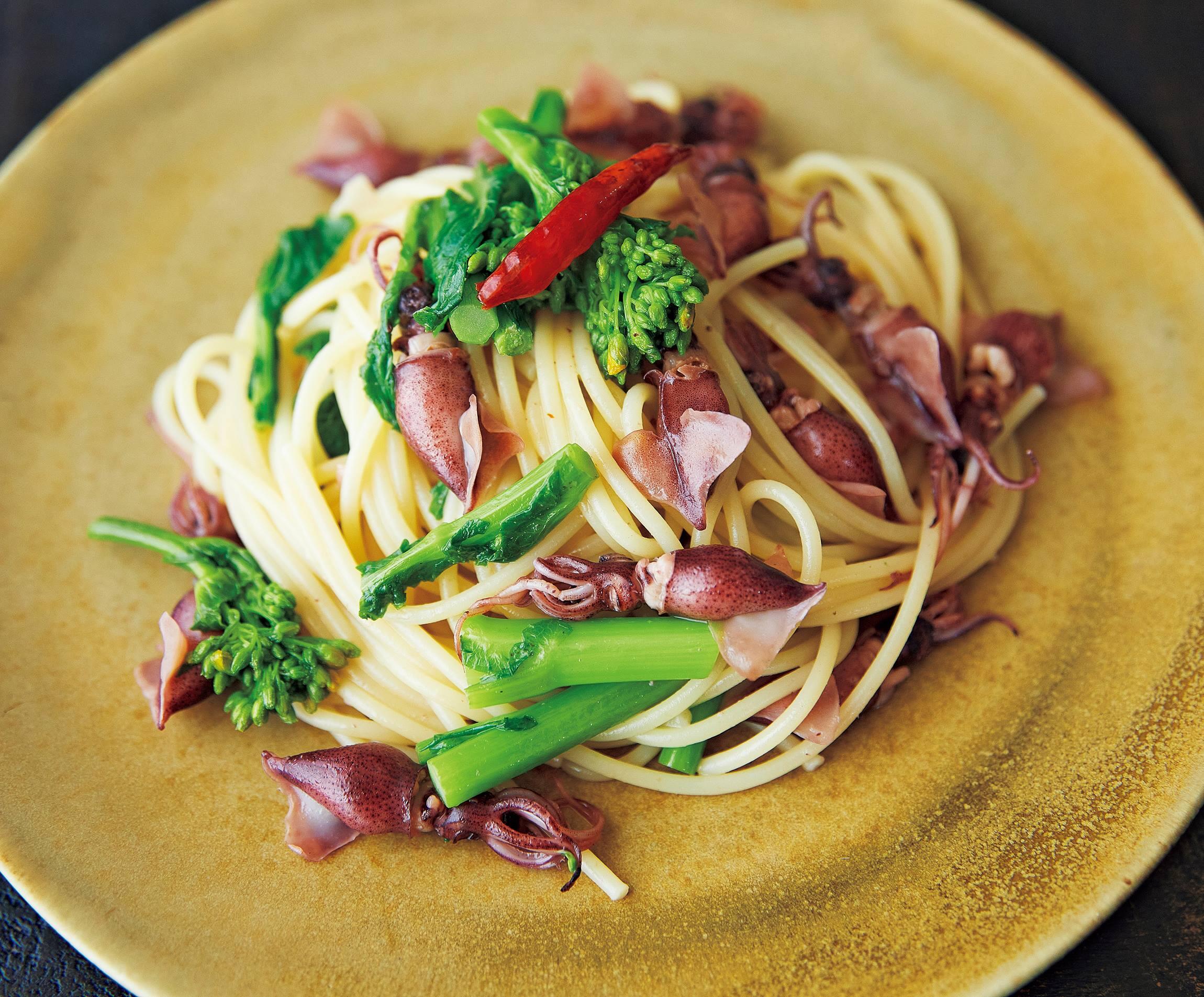 ホタルイカは小さいけれど、旨味の宝庫。一緒に炒めることで、菜の花もイカのおいしさをまといます。酒肴家として有名な料理研究家の稲垣知子さんに、日本酒と相性抜群なパスタレシピを教えてもらいました。