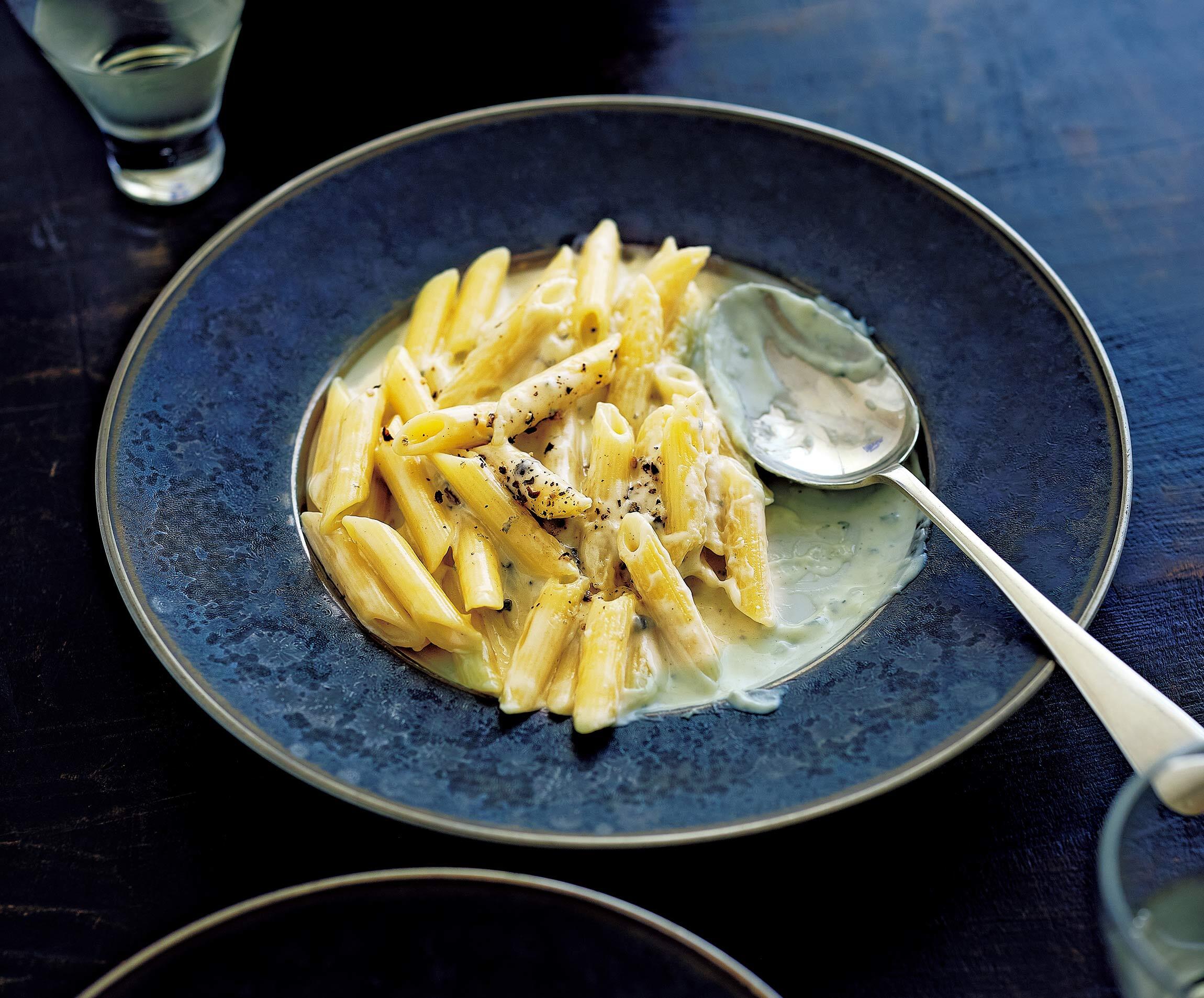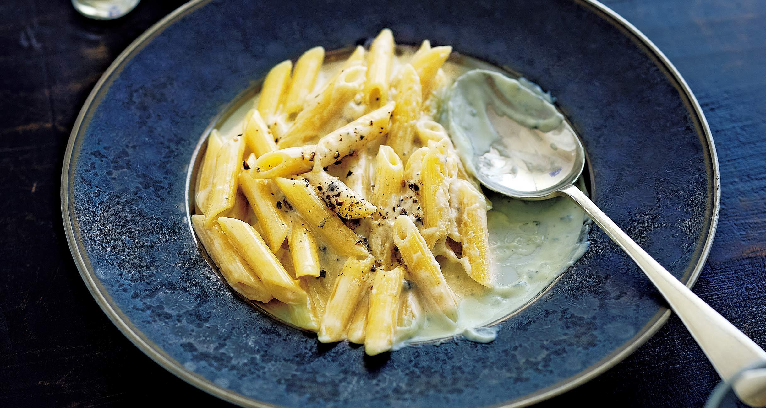 熱々を頬張るのもよいが、少し冷めたソースとぬるく燗した酒が口の中で溶け合うのもまた格別。チーズと生クリームを一体化させて、パスタにからみつくようにとろりと煮詰めるのがコツ。
