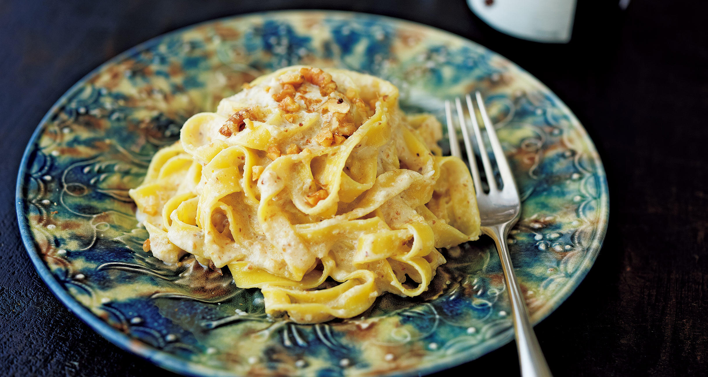 フライパンに③を入れて中火にかけ、ペーストが溶けてとろりとしたら、②のフェットチーネを湯をきらずにフライパンに直接加え、強火にしてしっかり炒め合わせる。味をみて足りないようならゆで汁を大さじ1~2加えて混ぜ、さらに味をみて足りなければ塩でととのえる。器に盛り、①のくるみを砕いて散らす。