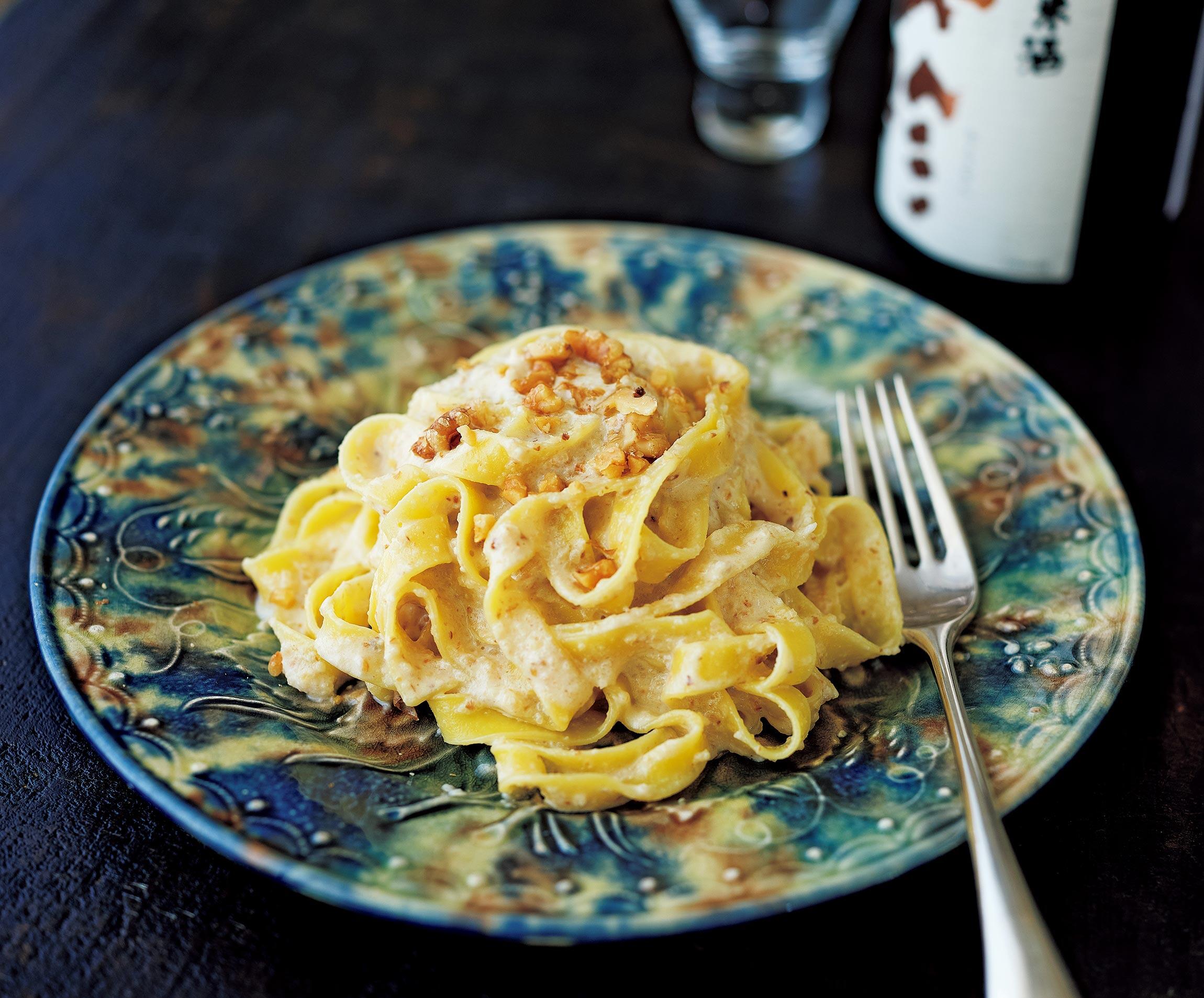 フードプロセッサーで撹拌したくるみソースを、フライパンで加熱するだけでできる濃厚で香り高い一皿です。しっかり骨太な純米酒とよく合います。酒肴家として有名な料理研究家の稲垣知子さんに、日本酒と相性抜群なパスタレシピを教えてもらいました。
