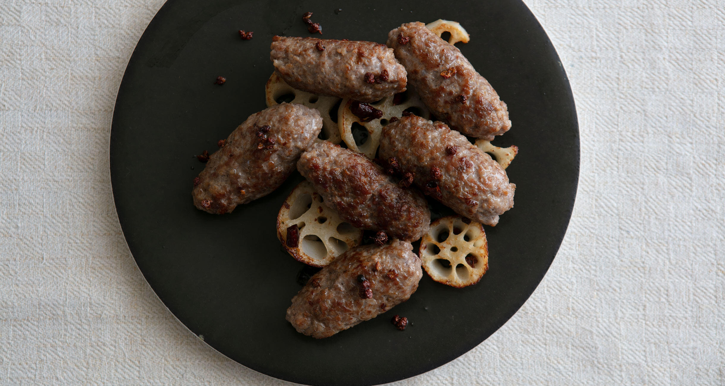 フライパンにオリーブオイル、花椒(ホール)、赤唐辛子を入れて中弱火で香りを出す。そのままの火力で②を転がしながら4~5分、全体にこんがりと焼き色がつくまで蓋をしないで焼く。火を止めて1分おき、余熱で火を通す。一緒に、つけ合わせのれんこんも焼いて盛りつける。
