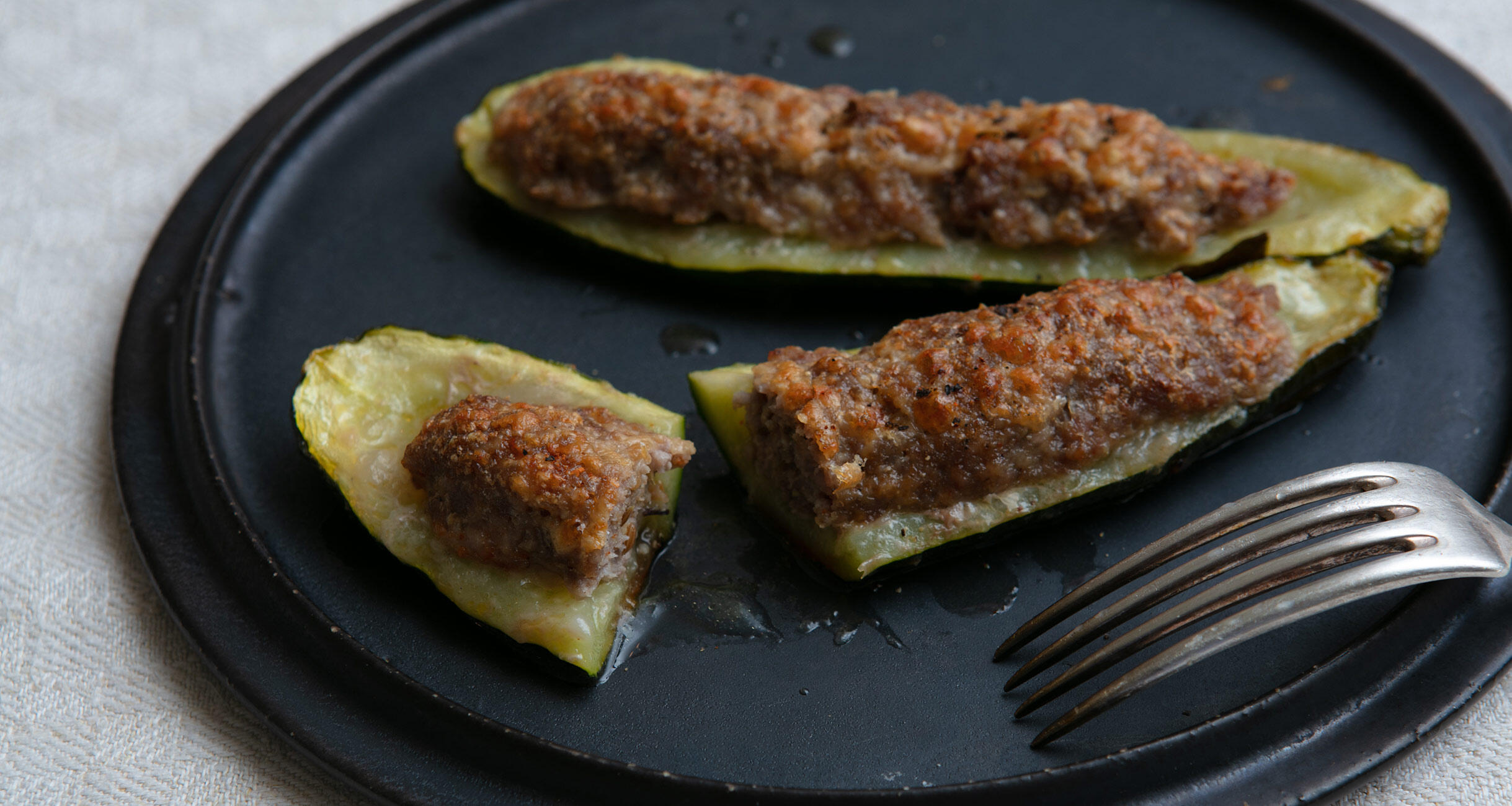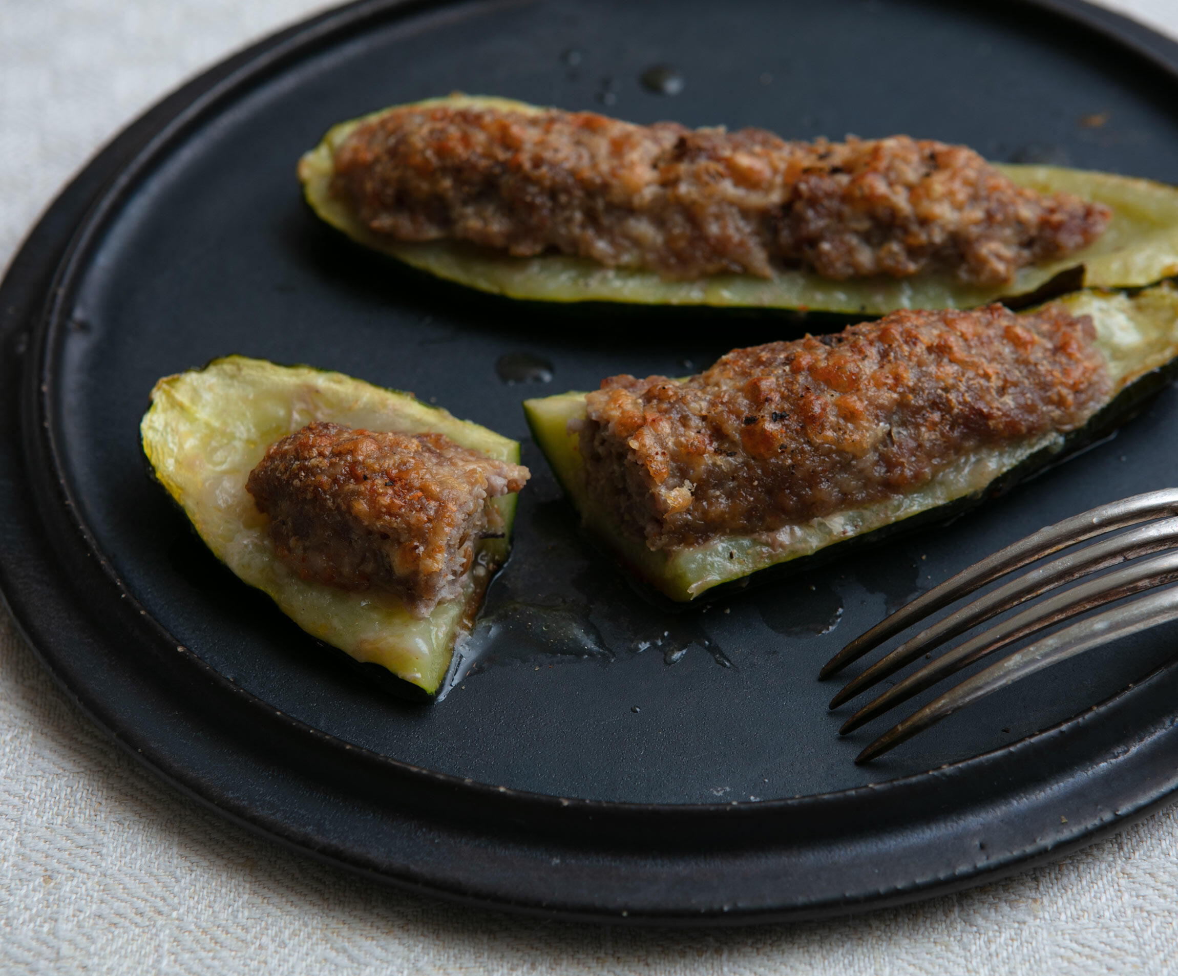 肉だねを詰めるだけで、スパイスがきいた挽き肉料理に。ズッキーニから旨味たっぷりの肉汁があふれ出す。熱々でも冷めてもおいしいのがうれしい。