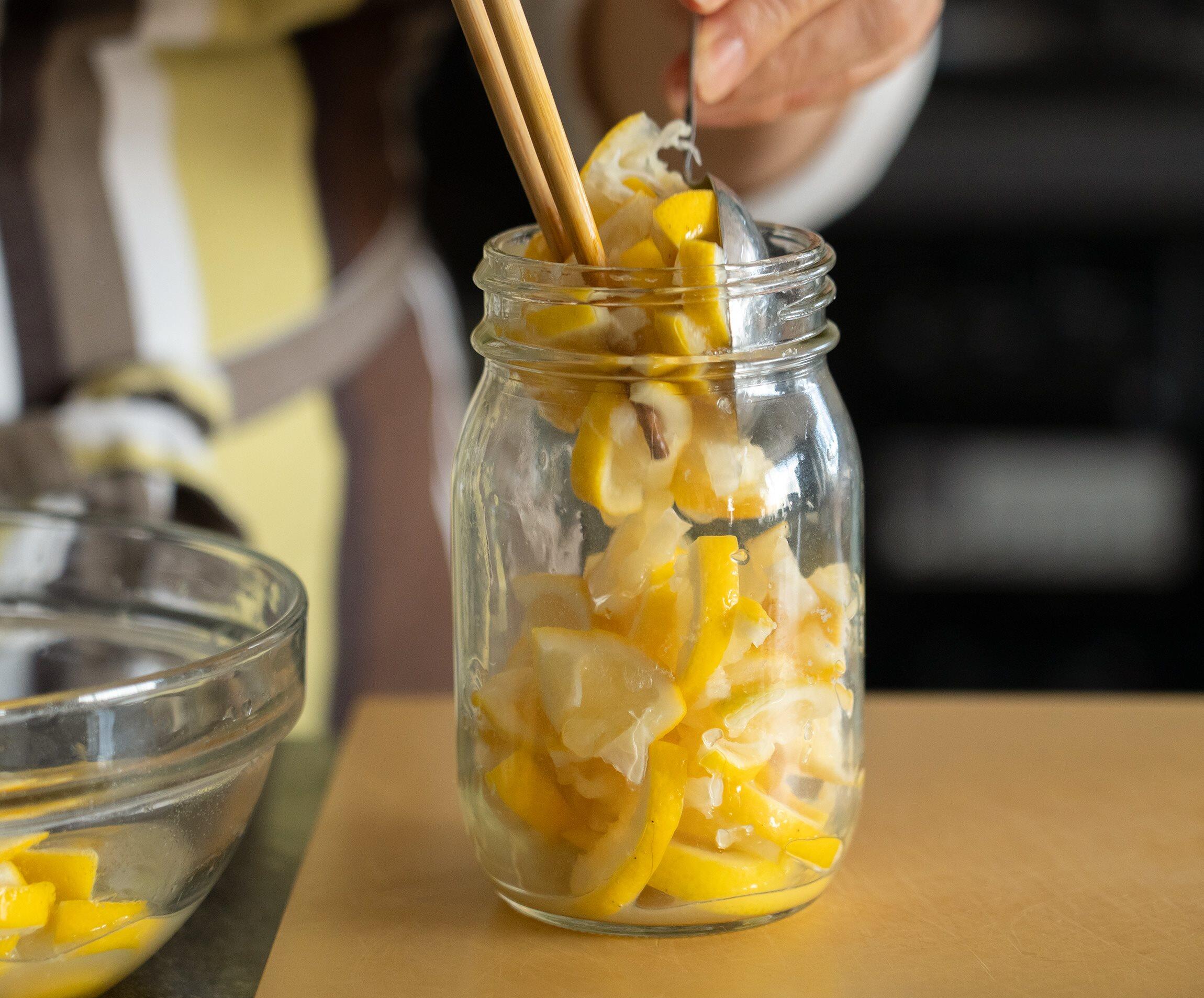 モロッコのレモンは、日本のものよりも皮が薄く、酸味が穏やか。丸のまま切り込みを入れ、たっぷりの塩で漬け込みますが、私は日本のレモンで普段使いしやすくアレンジしています。レモンをくし形に切るやり方も多いけれど、このいちょう切りが断然お薦め。水分も上がりやすいから数日で仕上がるし、ほんの少量だけ使いたいときにも便利なんですよ。今回は、定番の鶏肉のタジンをはじめ、タイ料理やパスタなどへの応用レシピもあるので、ぜひお試しを。