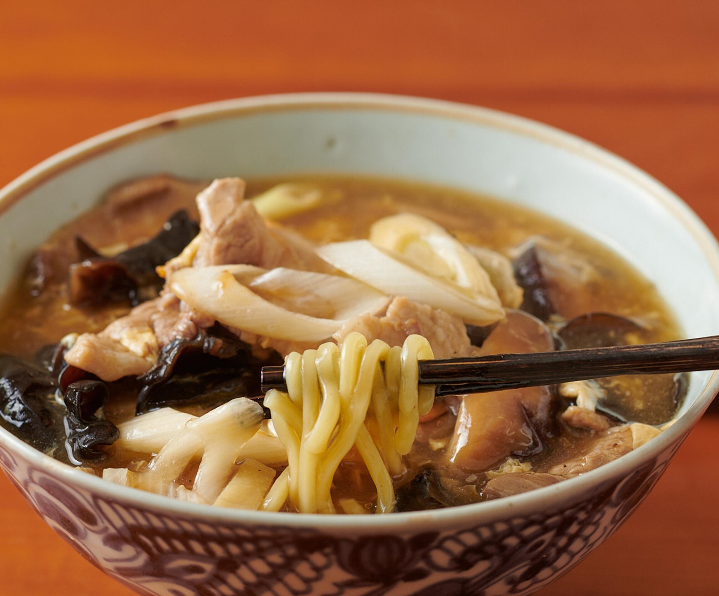 胡椒を加えて味を調え、ねぎを入れる。水溶き片栗粉でとろみをつけ、溶き卵を流し入れる。ひと呼吸おいてから玉じゃくしで静かに混ぜ、仕上げに花椒油大さじ1と1/2を回しかけ、火を止める。麺の入った器にあんかけをよそう。