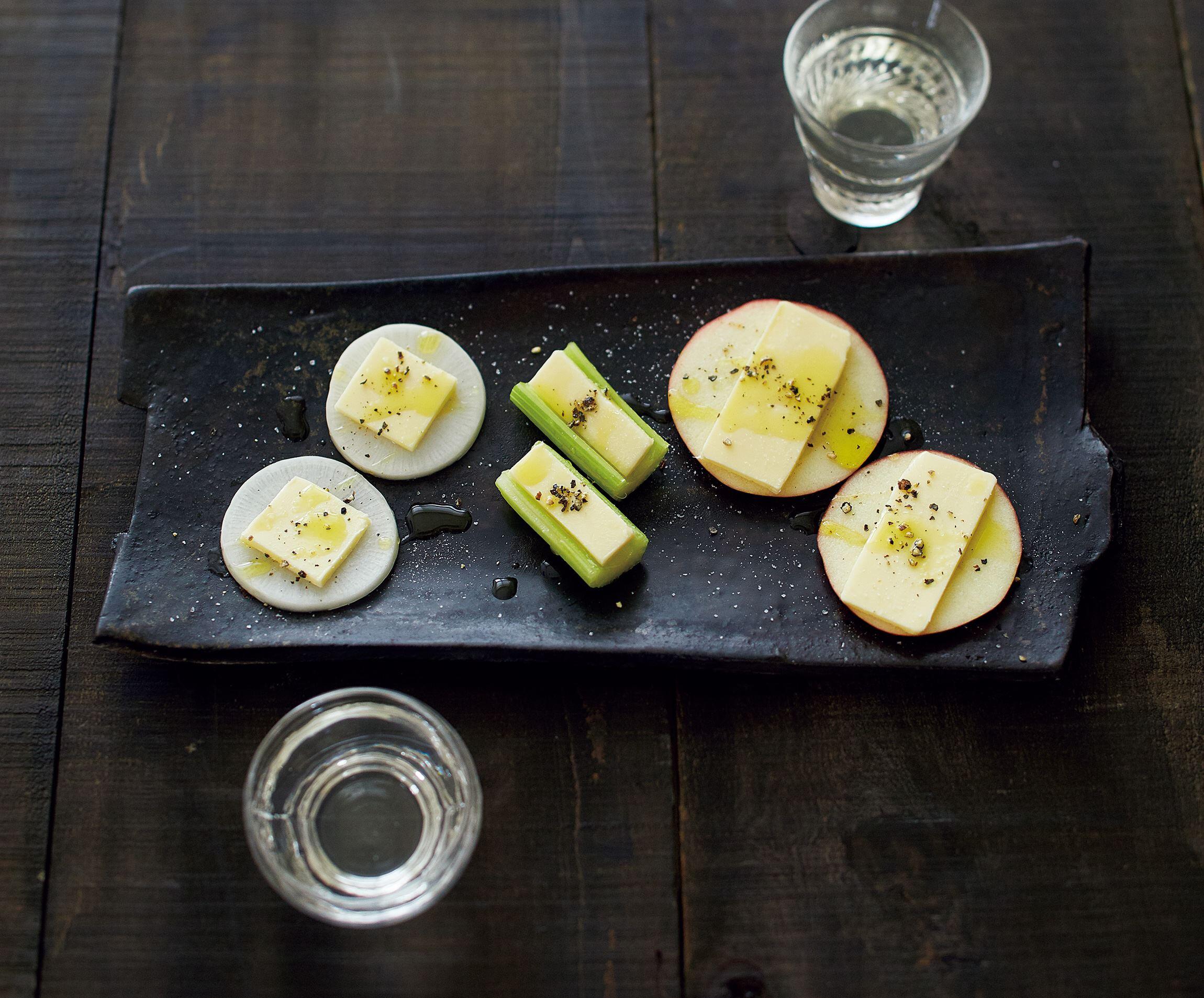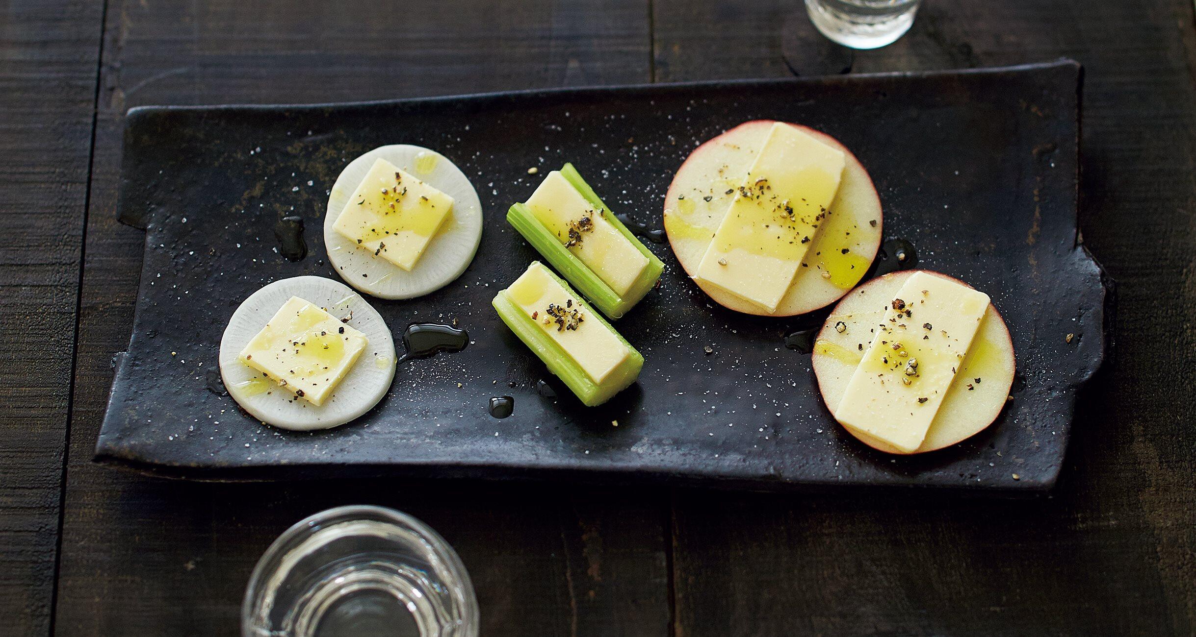 バターをごく薄切りにしてセロリ、大根、りんごにのせる。