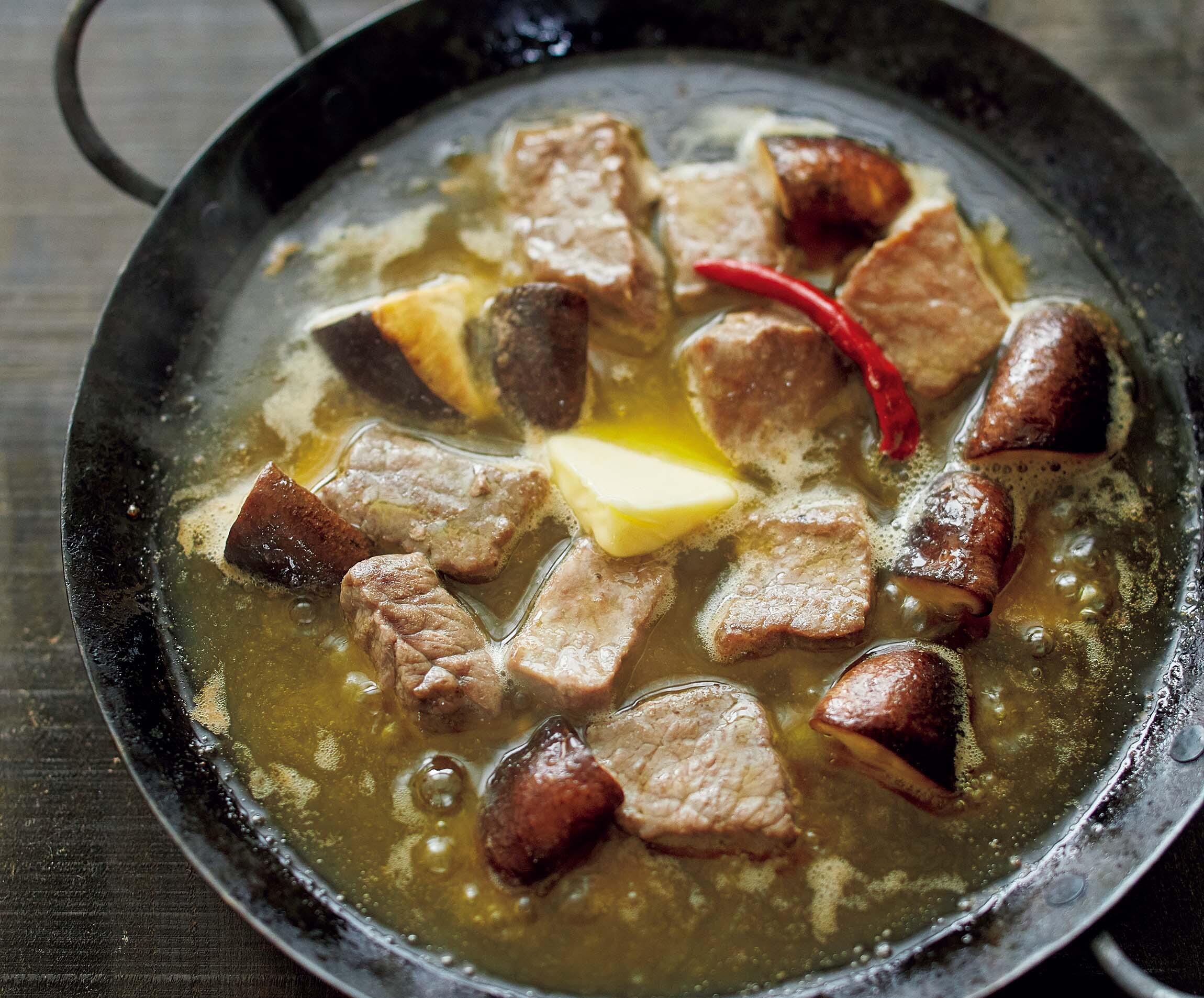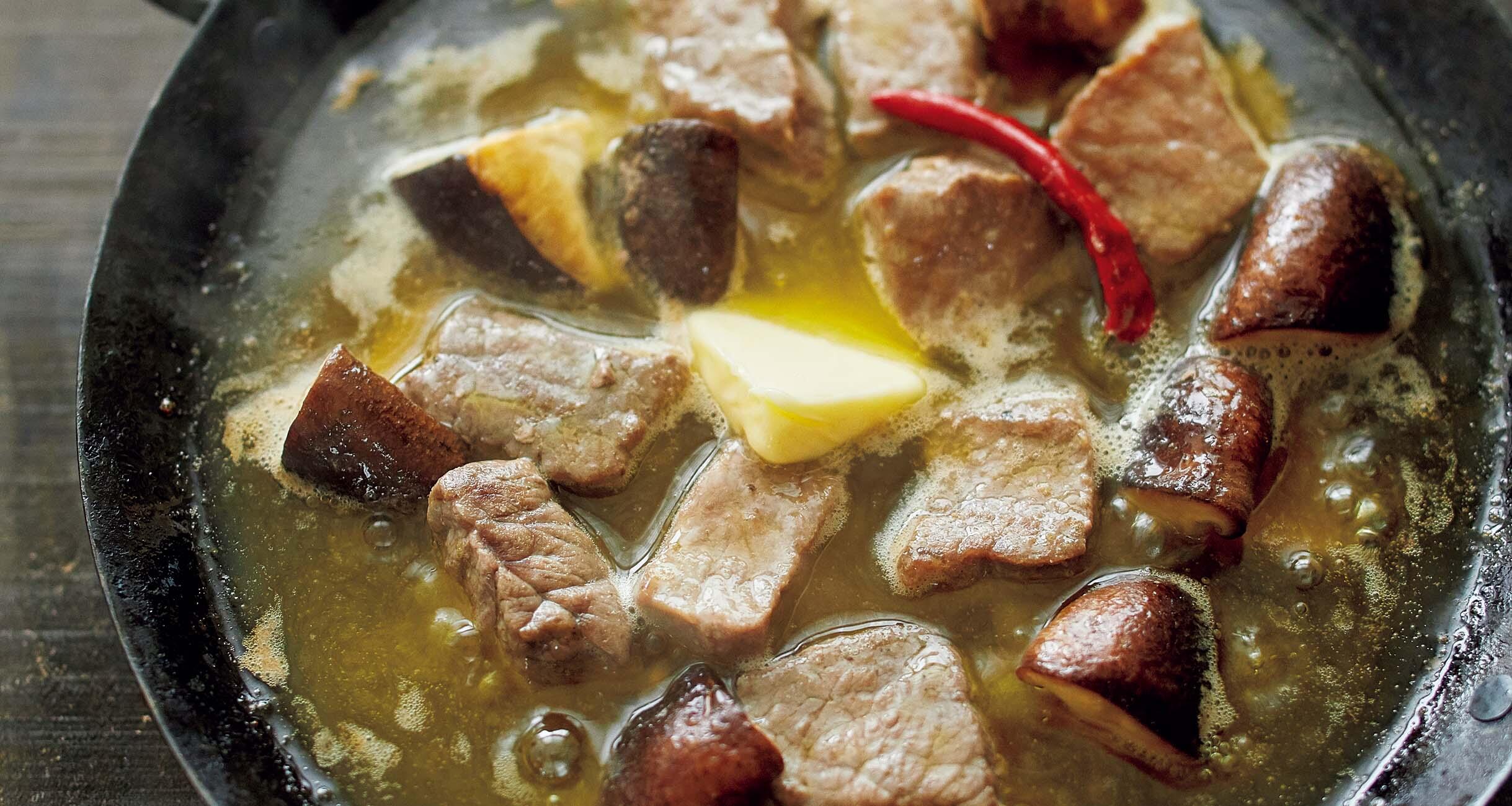 小鍋に①を入れて醤油と塩ひとつまみを加えてよく混ぜ、具が重ならないように平らにする。オリーブオイルをひたひたに注ぎ、バター半量、唐辛子を入れて弱火にかける。オイルがふつふつして牛肉が色づいてきたら肉、椎茸の上下を返し、さらに2~3分煮る。
