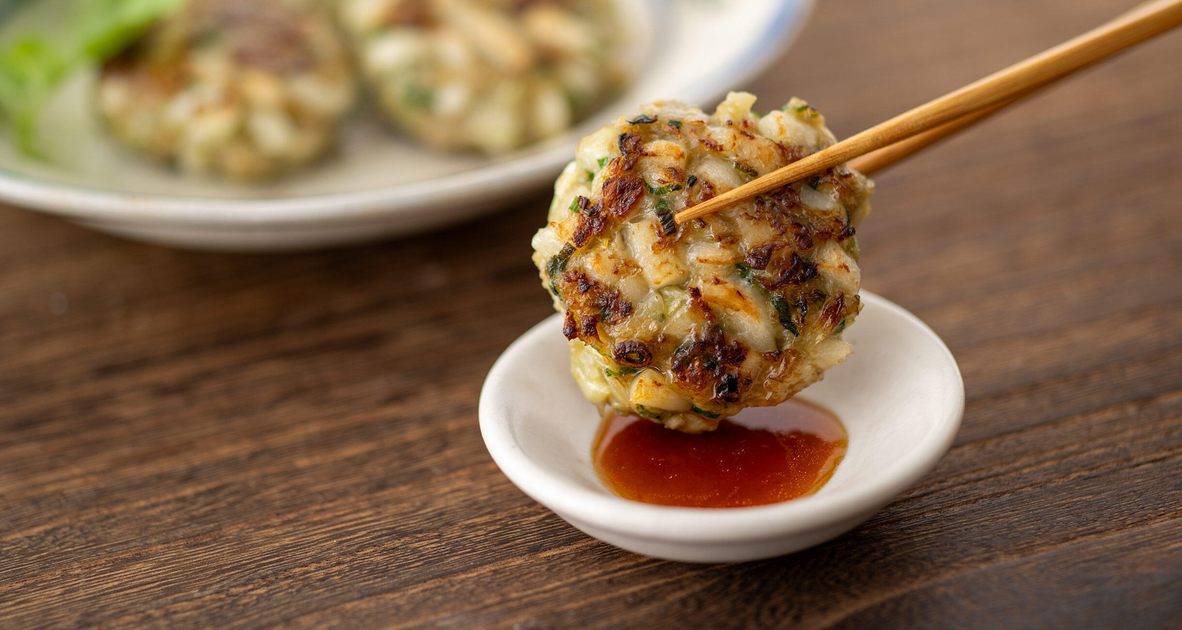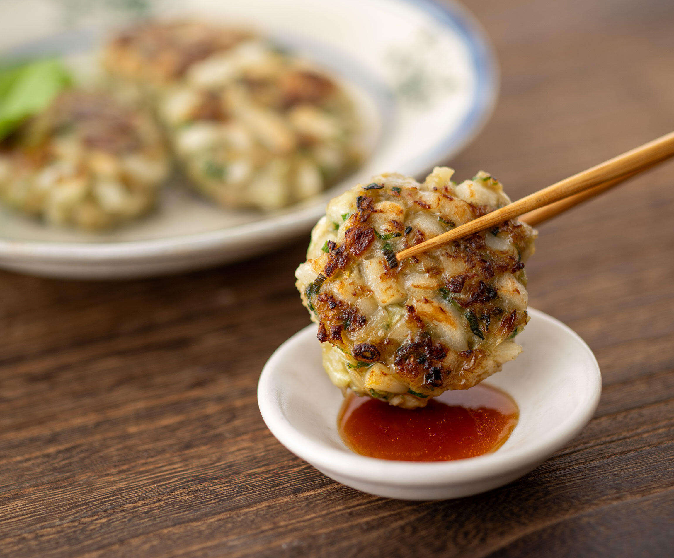 フライパンに胡麻油をひいて弱めの中火にかけ、丸めたあんを並べて焼く。焼き色がついたら返し、蓋をして3分ほど蒸し焼きにする。もう一方の面も焼き色がついたら出来上がり。タレの調味料を好みの割合で合わせて添え、つけて食べる。