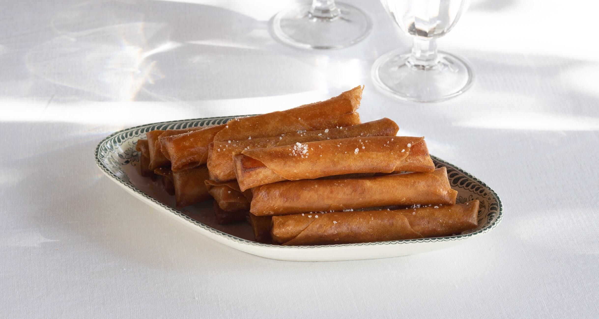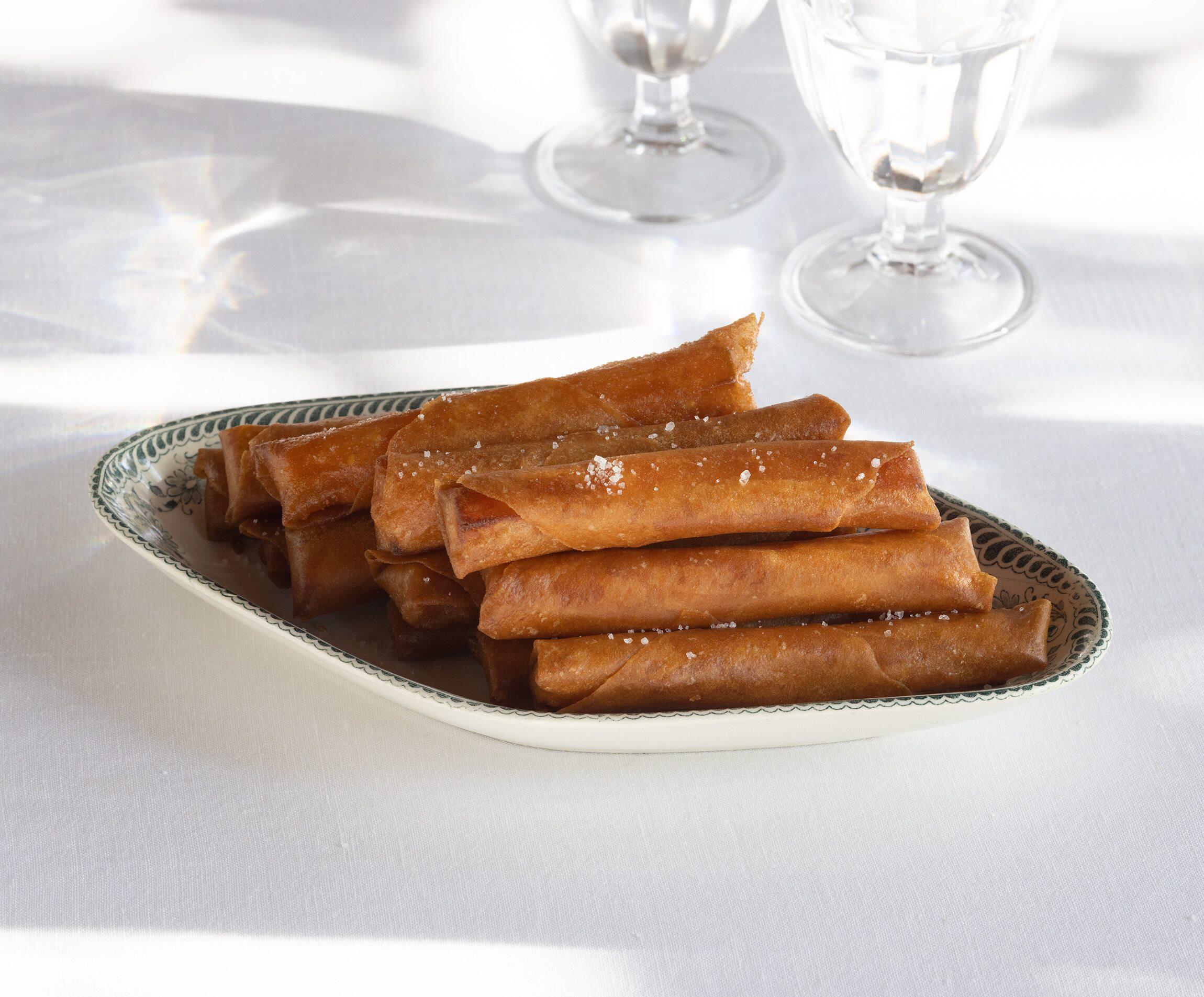 春巻きの皮を三角形の底辺を手前に置き、手前に②を1本のせ、胡麻ひとつまみと松の実3〜4粒をのせる。なるべく隙間がないように包み、小麦粉を水で溶いたもの(分量外)で留める。