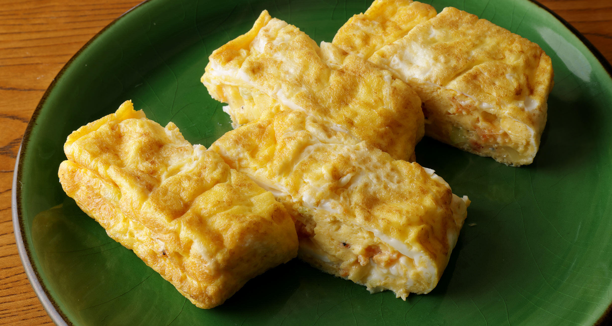 卵液の1/3量を流し入れて大きくゆっくりかき混ぜ、半熟になったら奥に寄せる。油少々(分量外)を塗って卵液の半量を流し入れ、奥に寄せた卵を軸にして手前に巻く。残りの卵液も同様に巻き、食べやすい幅に切る。