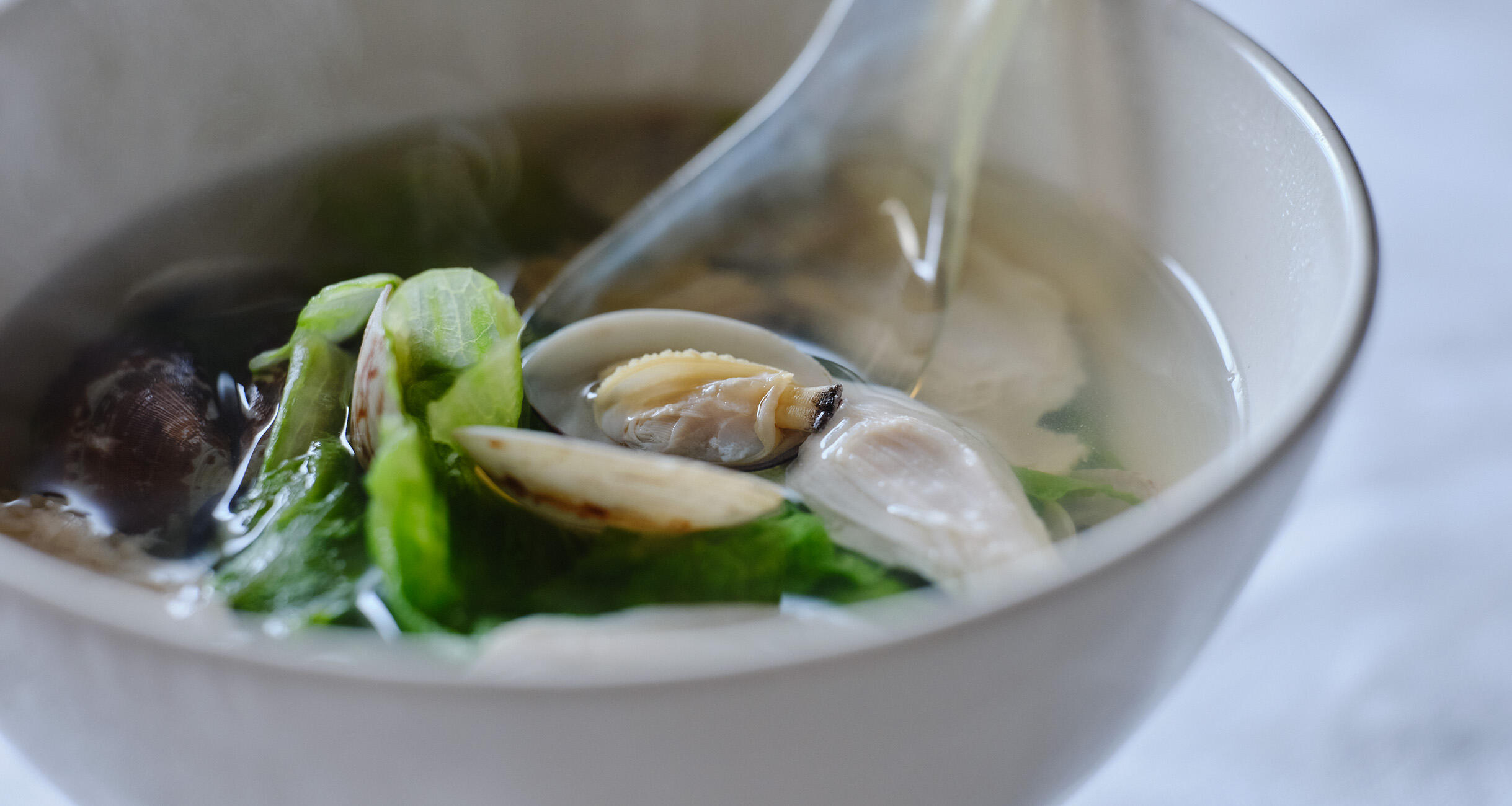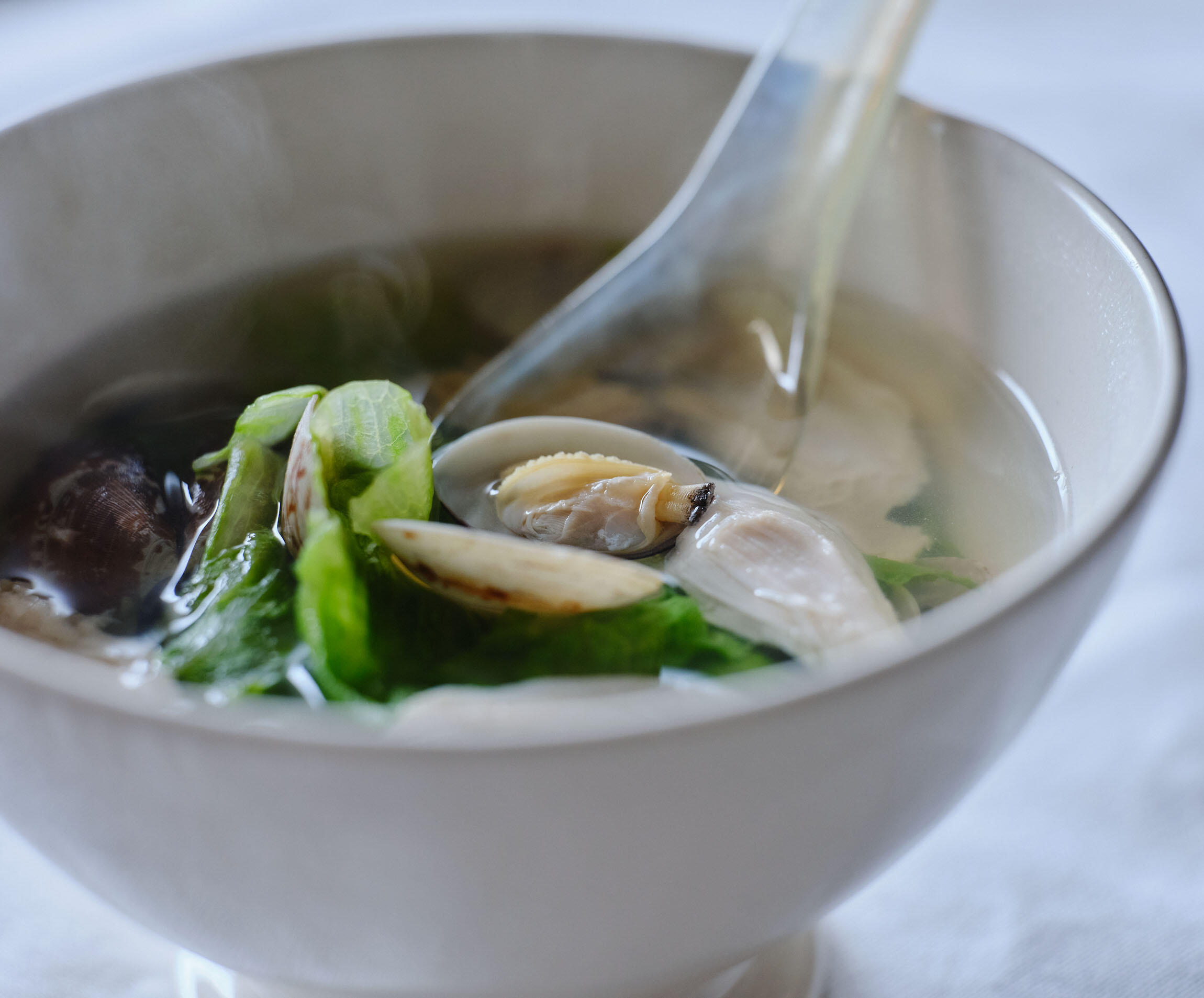 鍋にあさりと水300mlを入れて火にかけ、あさりの口が開いたら酒とささみのゆで汁を加える。