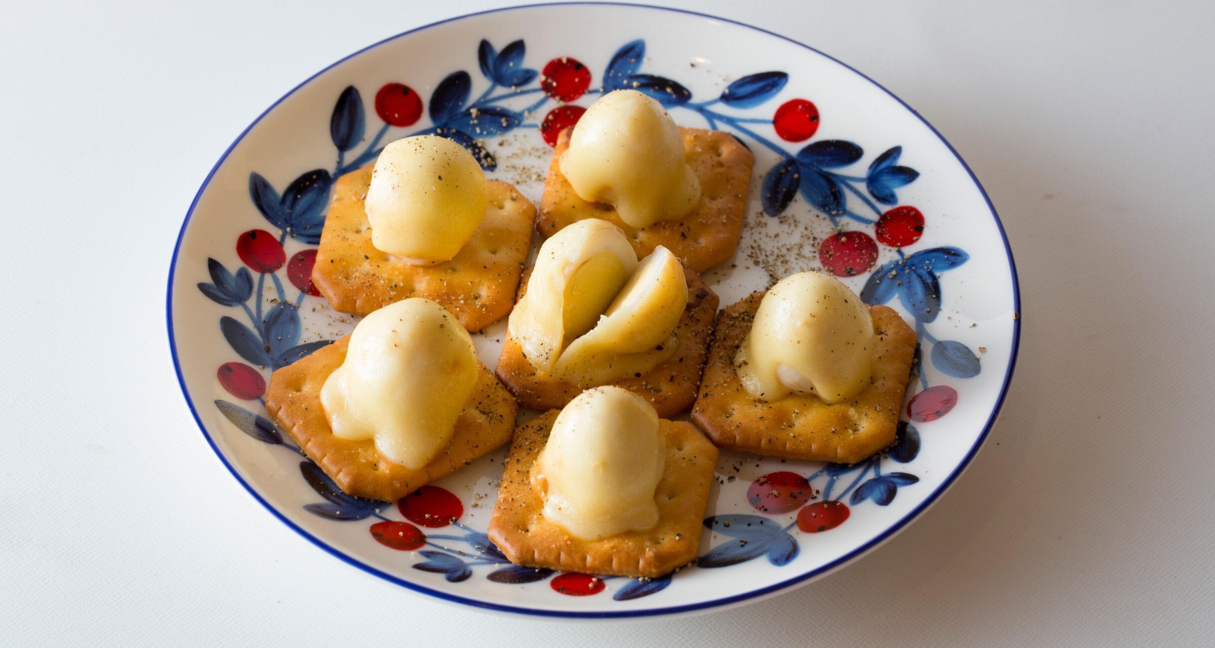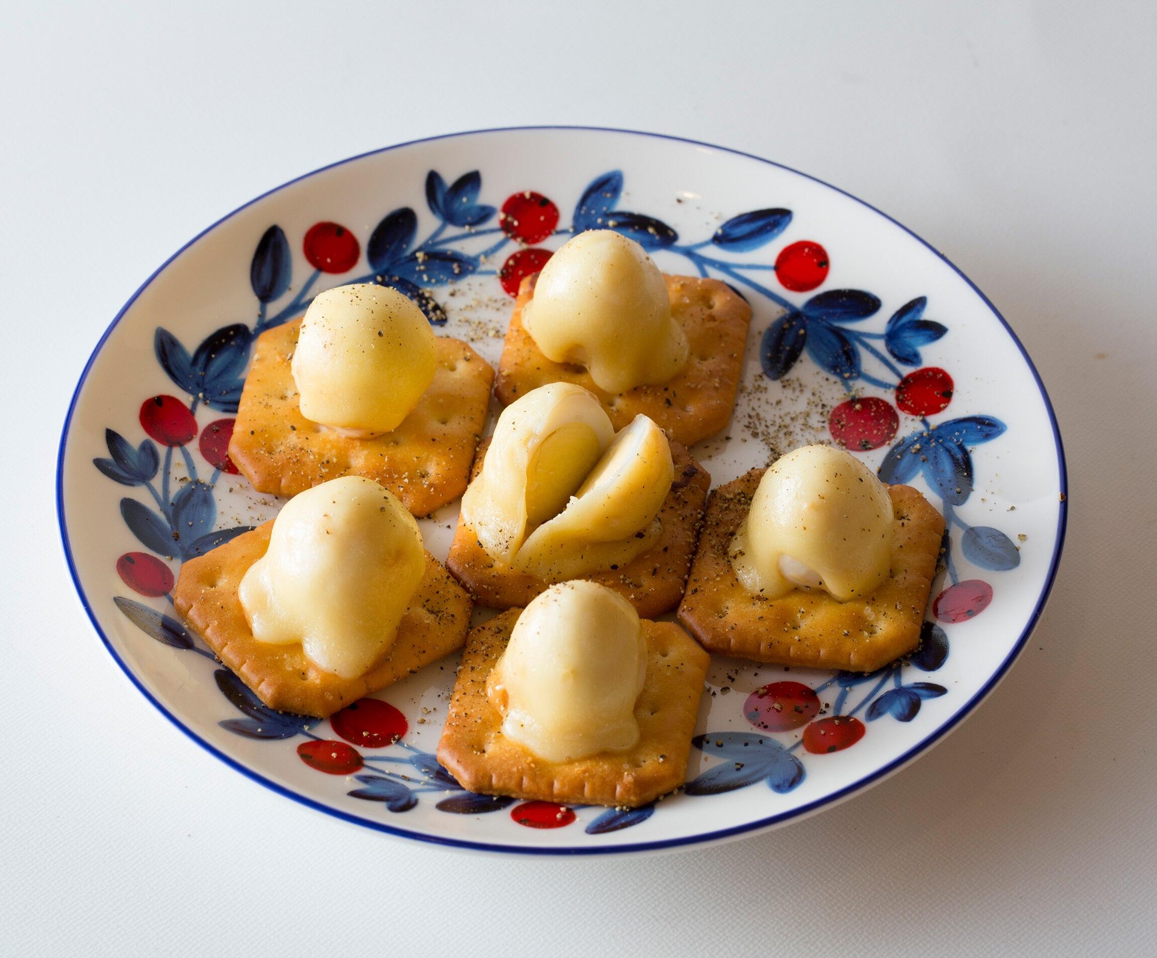 とろけるチーズをちぎってうずら卵にのせ、オーブントースターで2~3分焼いて胡椒をふる。