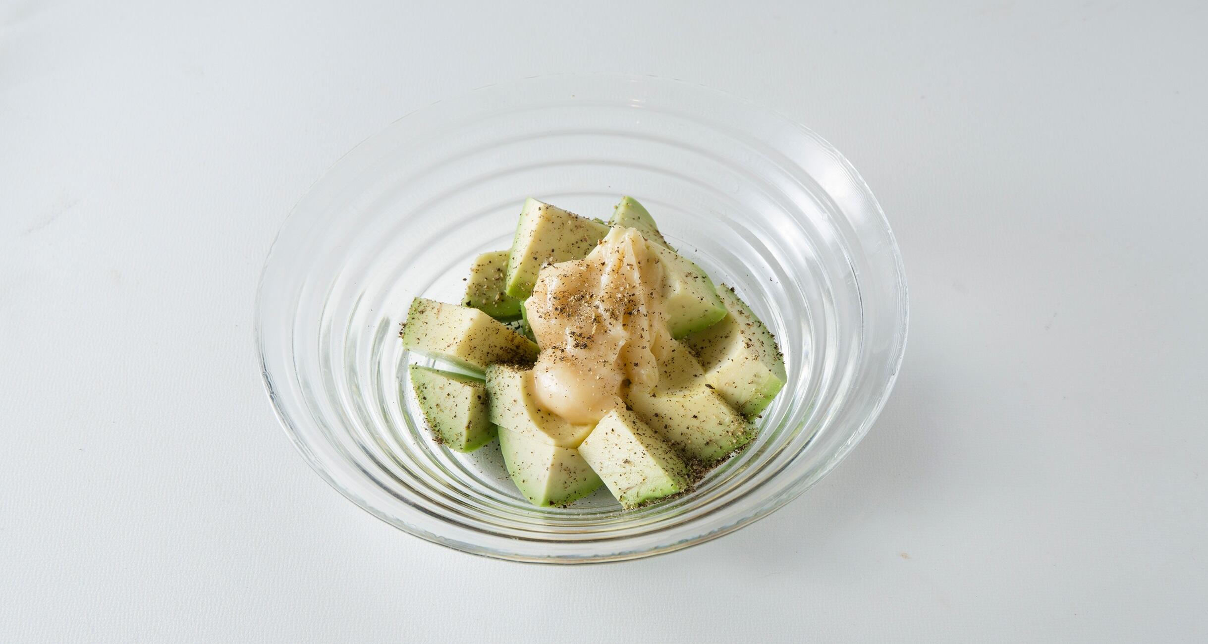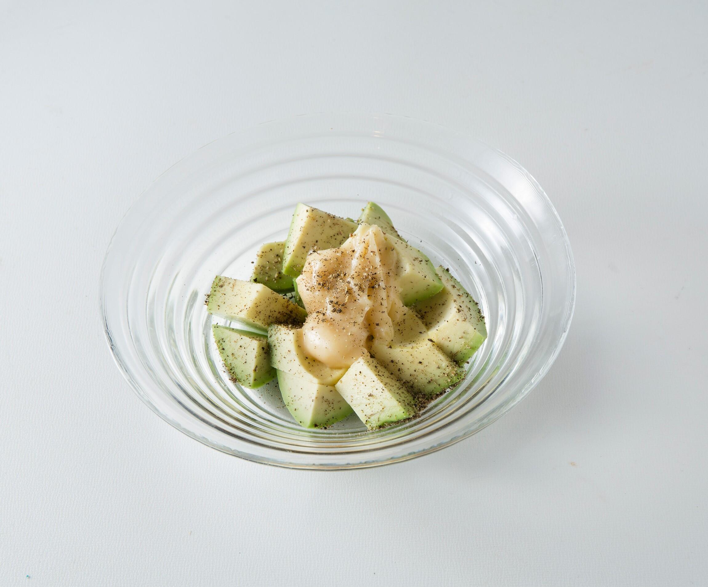 マヨネーズと白味噌を混ぜ合わせ、アボカドにかけて胡椒をふる。