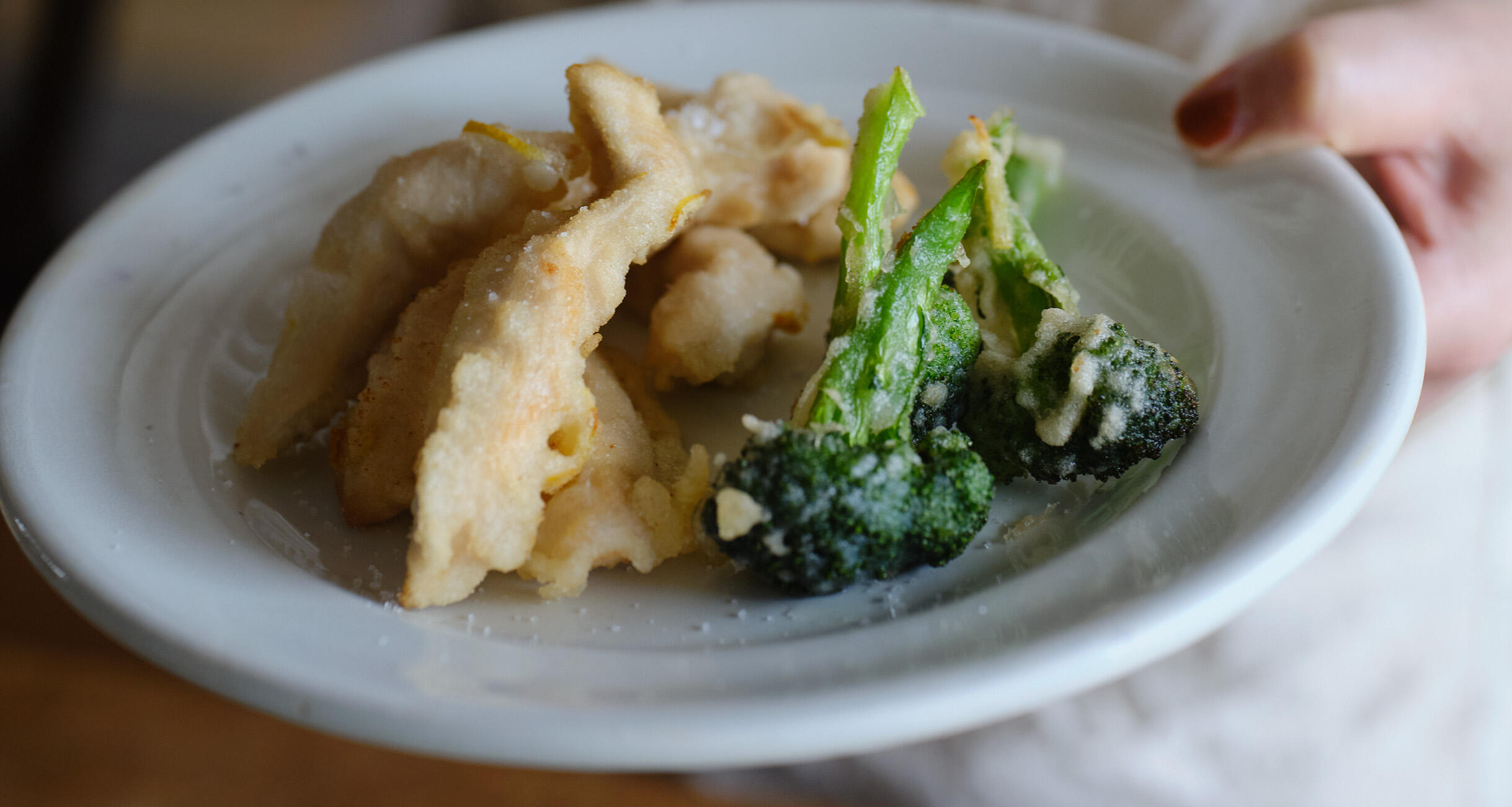 ささみとブロッコリーを②の衣にくぐらせ、180℃の油で揚げる。ささみは2分ほどで火が通るので揚げすぎないこと。熱いうちに塩(分量外)をふり、好みでレモンを搾りかける。