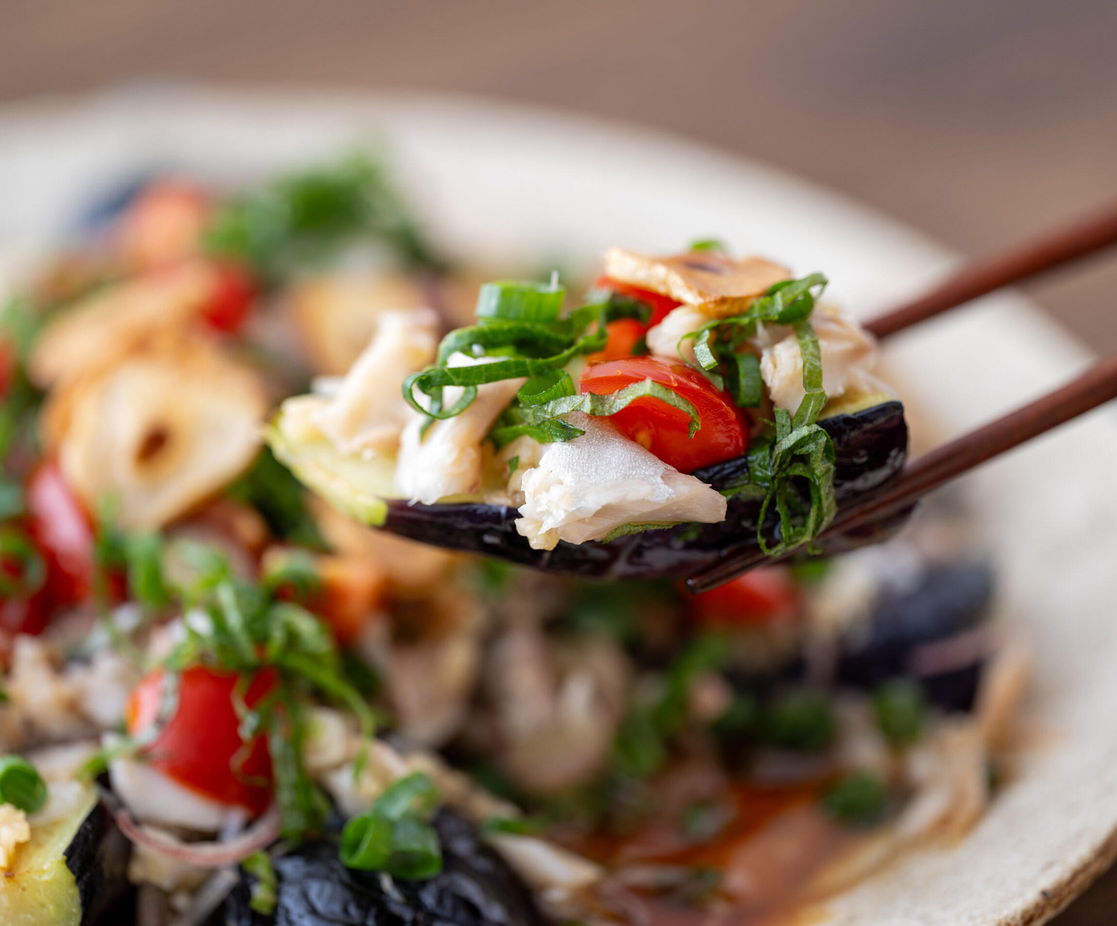 という尾身さんの言葉と共に、食卓に運ばれてきた“なすのタタキ”。なすの紺碧の皮がツヤツヤと光り、ふっくら蒸し焼きにしたアジの干物がたっぷり。薬味の彩りも美しく、これは映える!