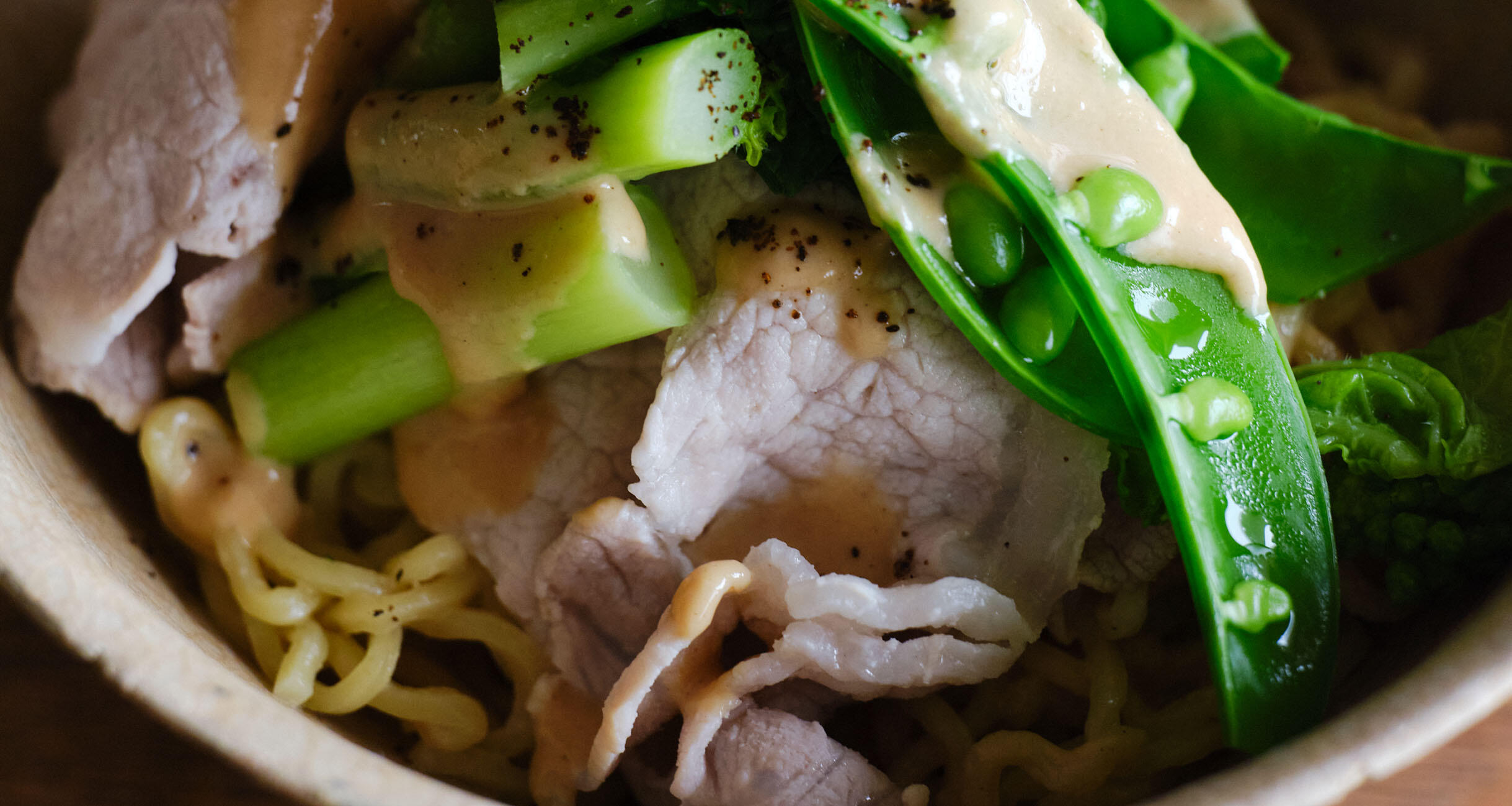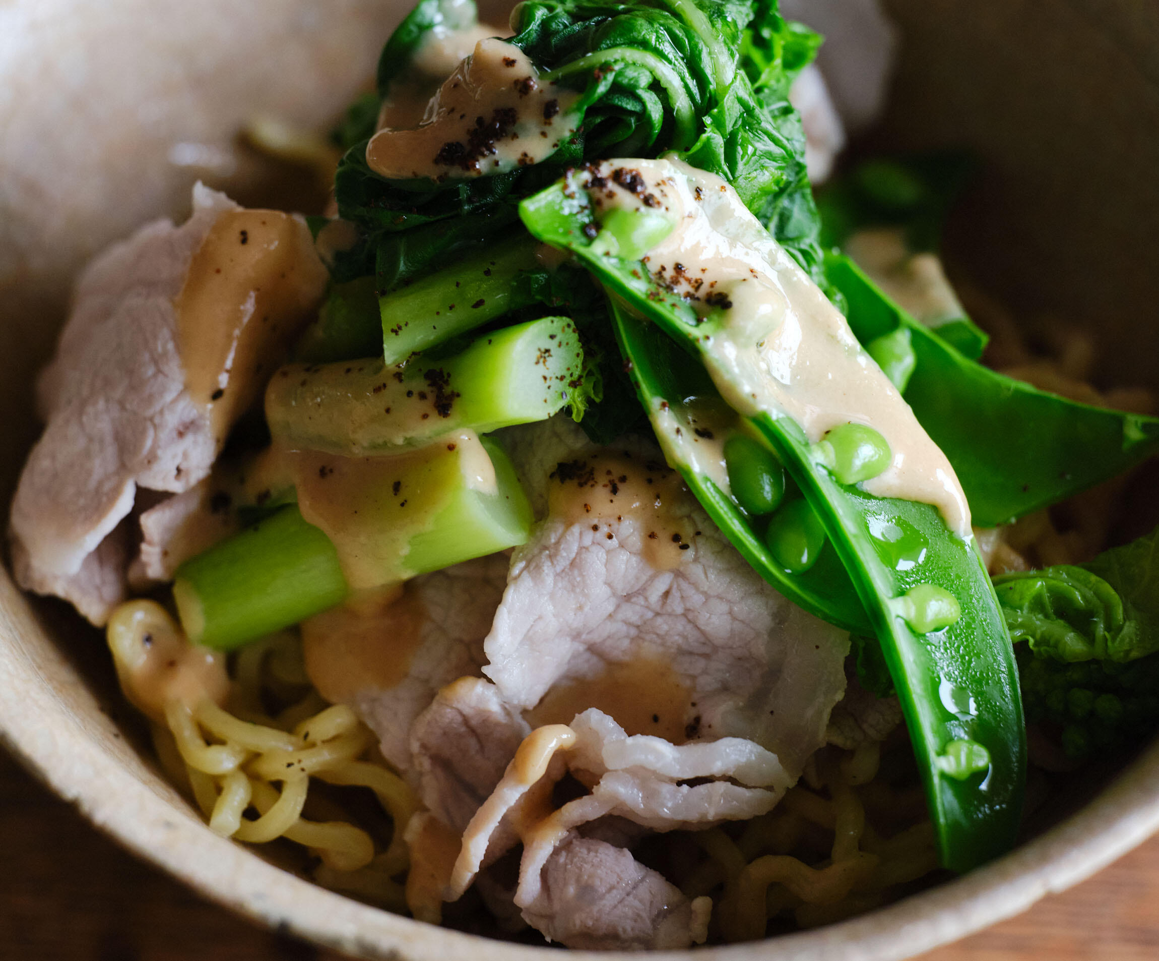 器に麺を盛り、胡麻酢ダレの半量を加えて和える。食べやすい大きさに切った豚肉と菜の花、スナップえんどうをのせ、残りの胡麻酢ダレをかける。あれば黒七味やラー油をかけても。