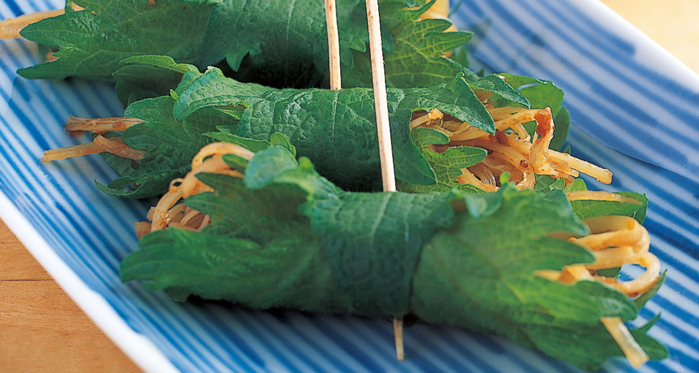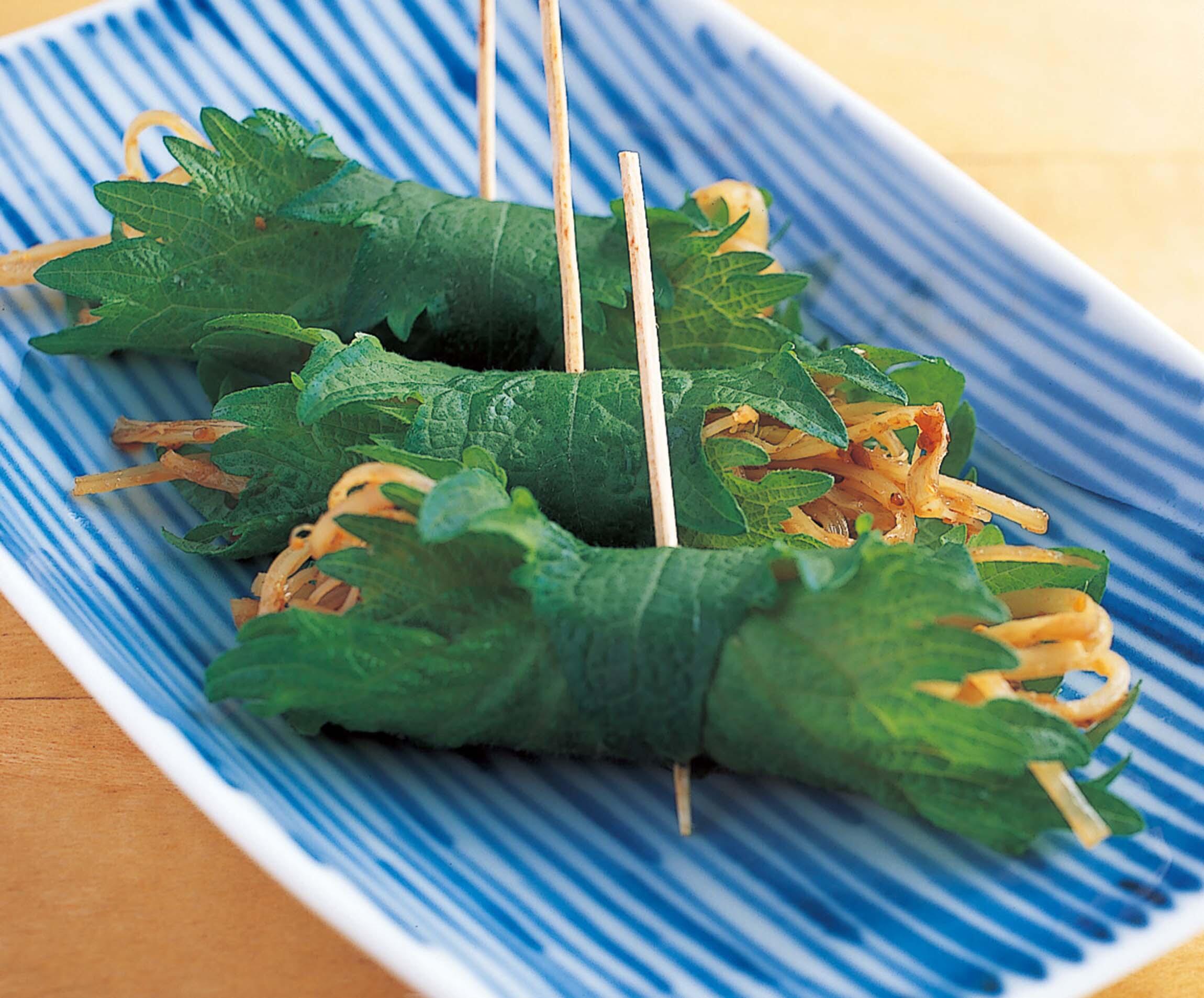 青じそにのせて巻き、つまようじで留める。