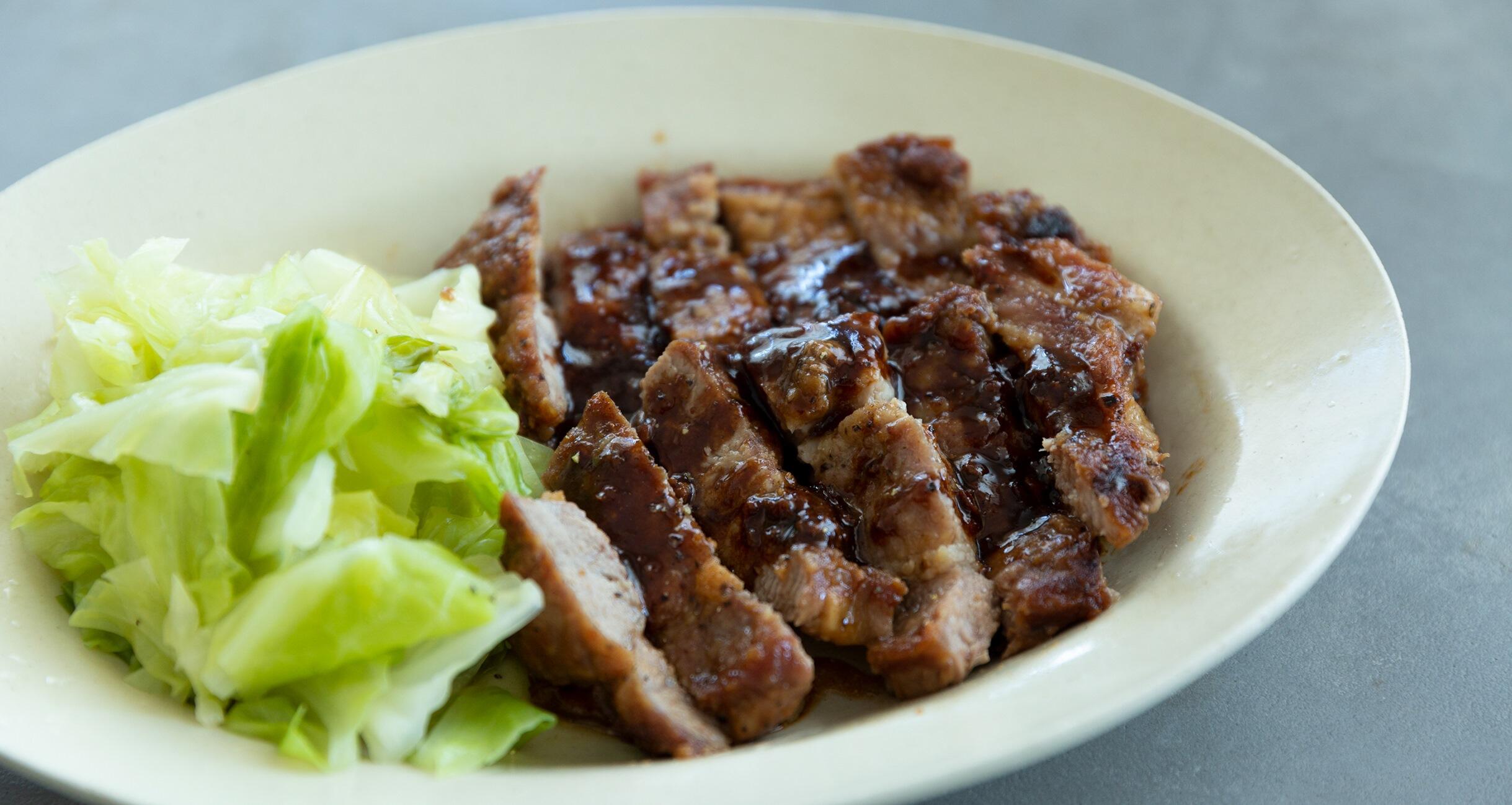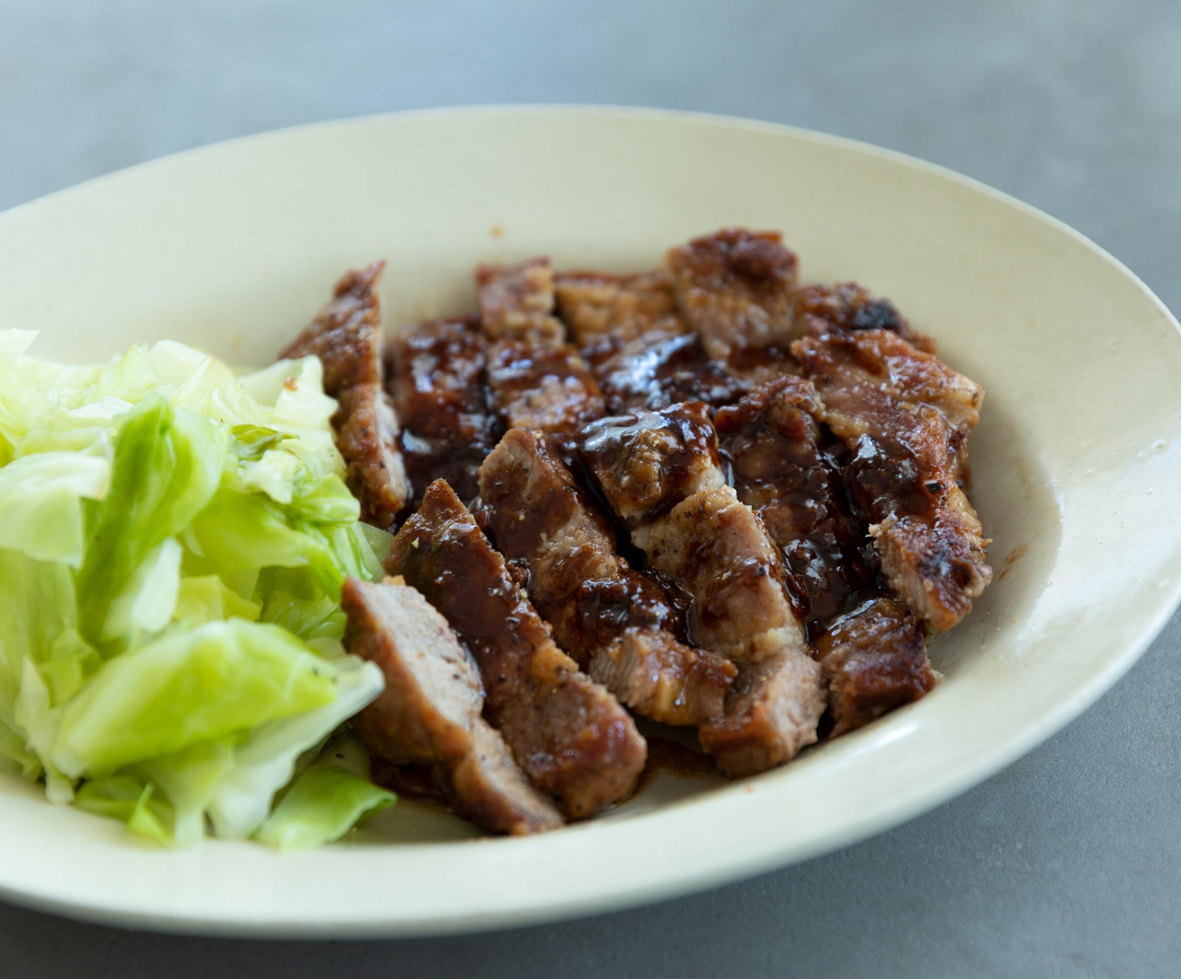 ③の肉を食べやすく切って器に盛り、フライパンに残ったソースをかける。好みで蒸しキャベツを添える。