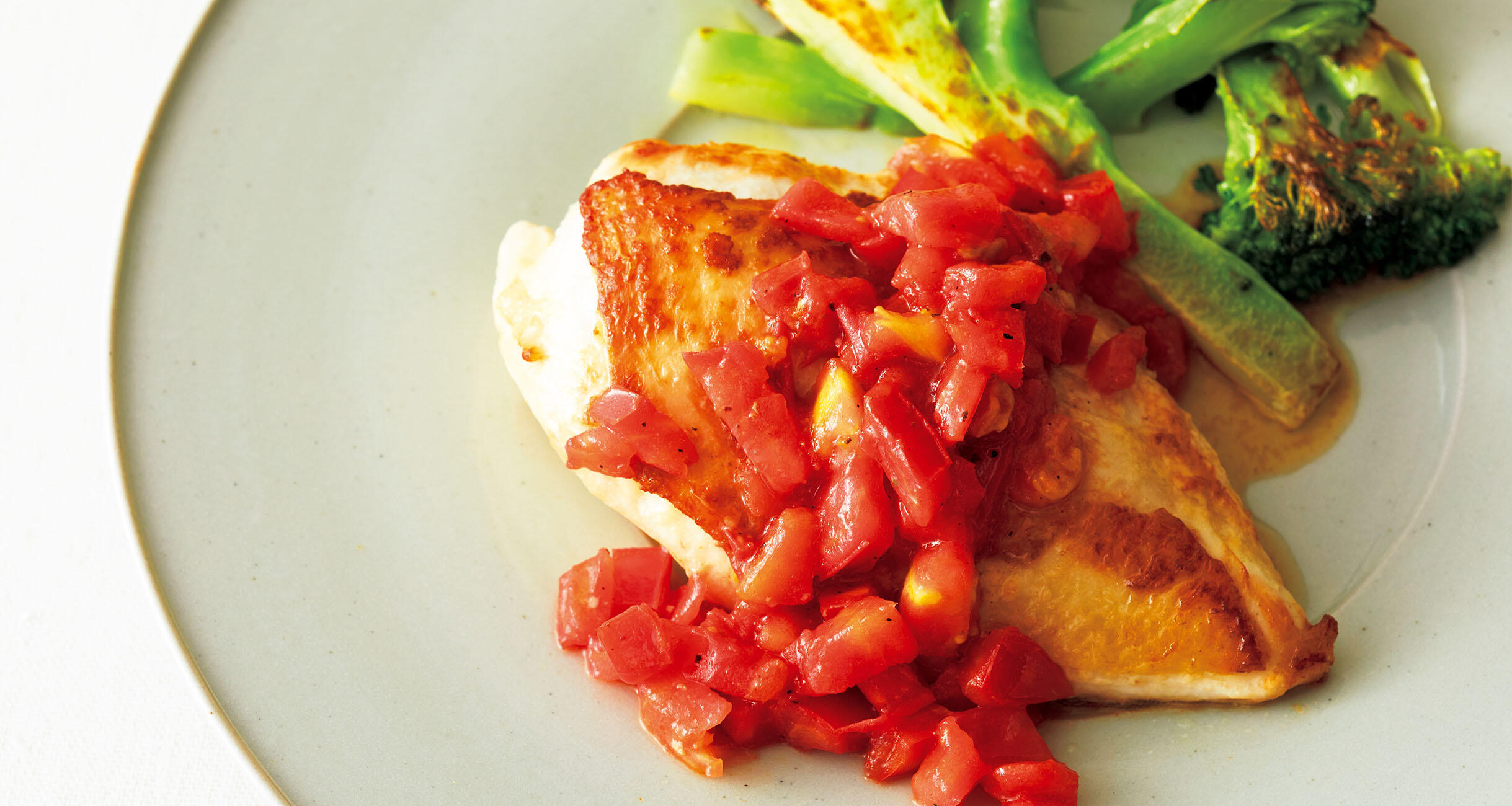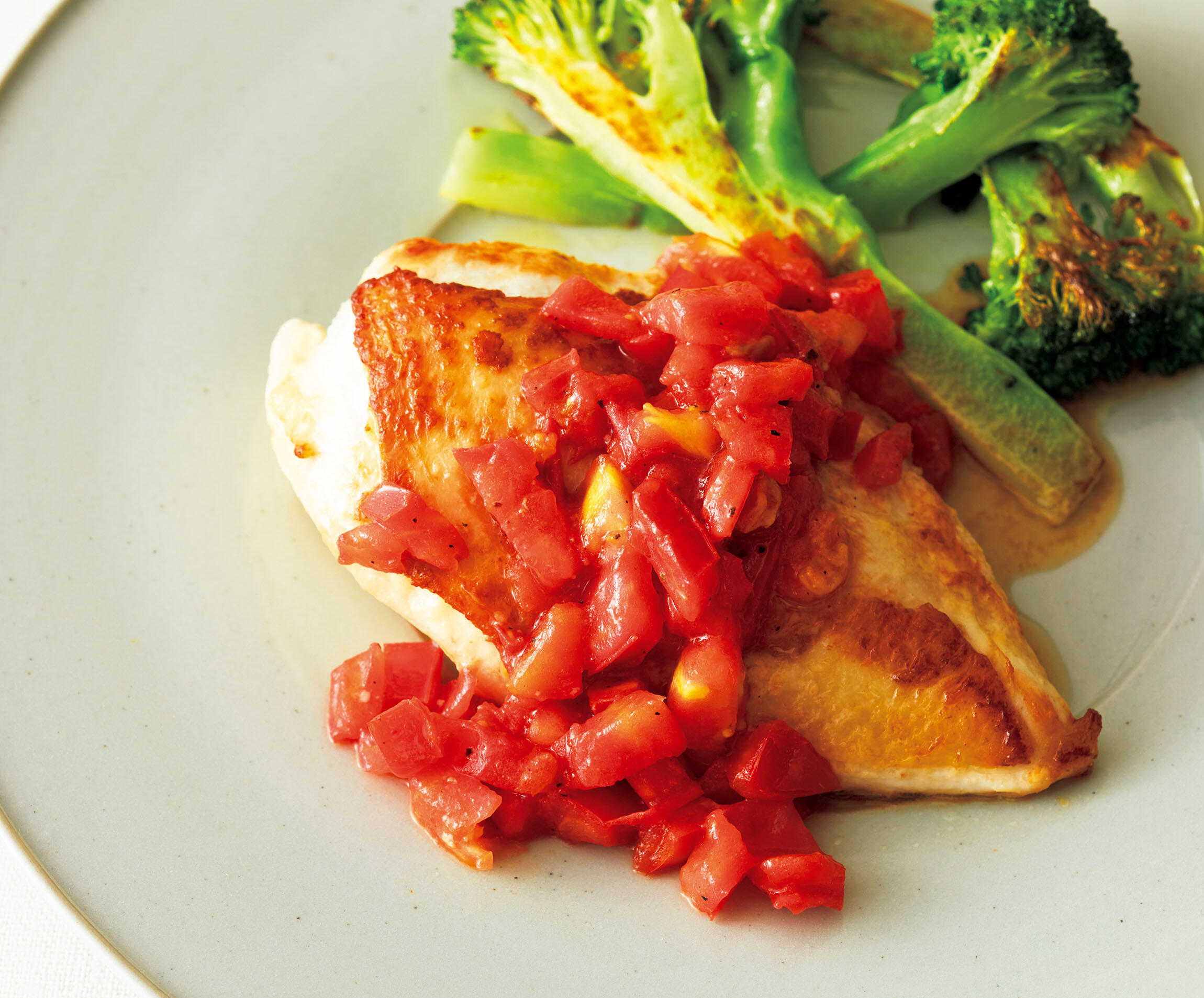 トマトソースで鮮やかに。鶏肉を焼いた後、フライパンに残った脂を利用してフレッシュトマトでささっとつくります。