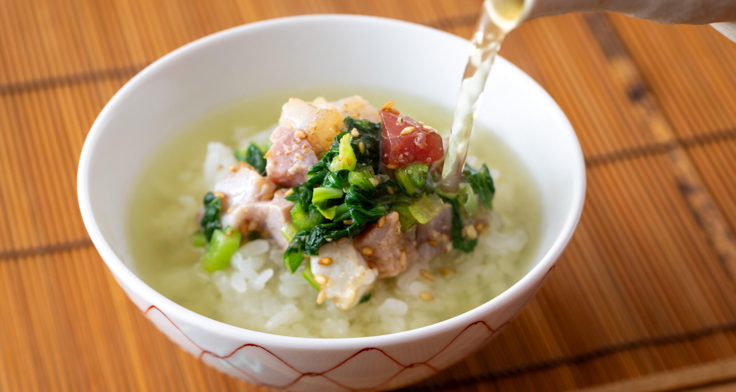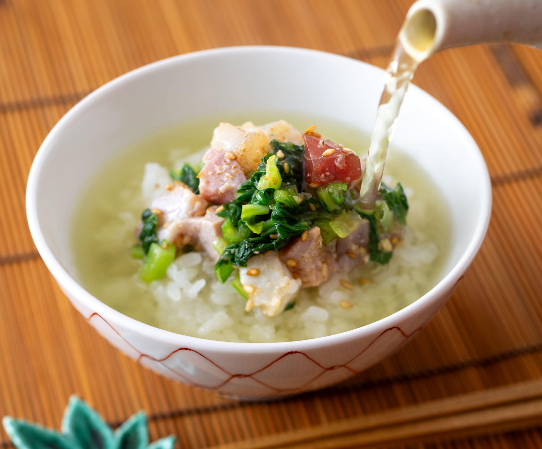 さらに、「ご飯にのせて、タイ茶漬けみたいにしてもおいしいのよ」と、尾身さん。すすめられるがままに、熱い緑茶をまわしかける。ああ、すり胡麻が香ばしくて、サラサラと食べてしまう……!そのままで、ご飯にのせて、お茶をかけて。三度おいしい“小松菜和え”、これはもう刺身を余らせるしかない!