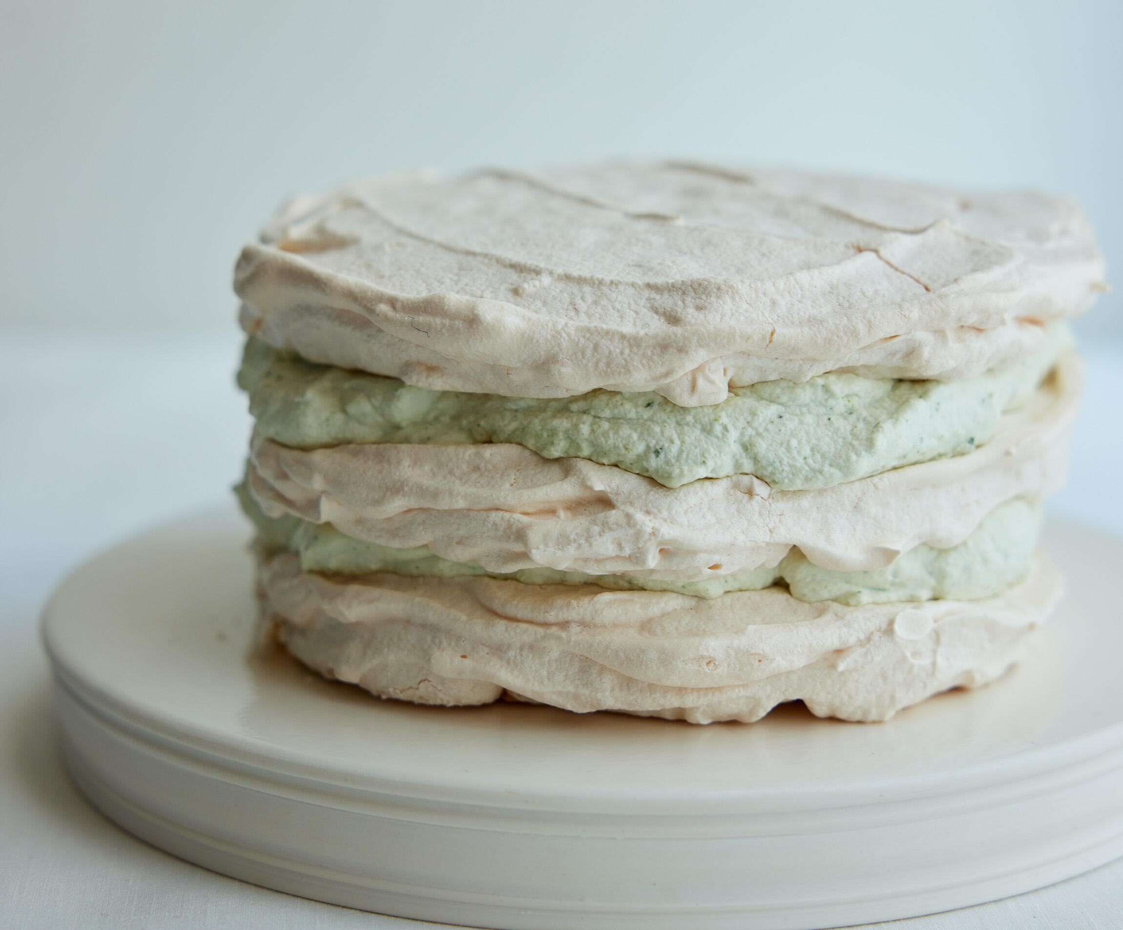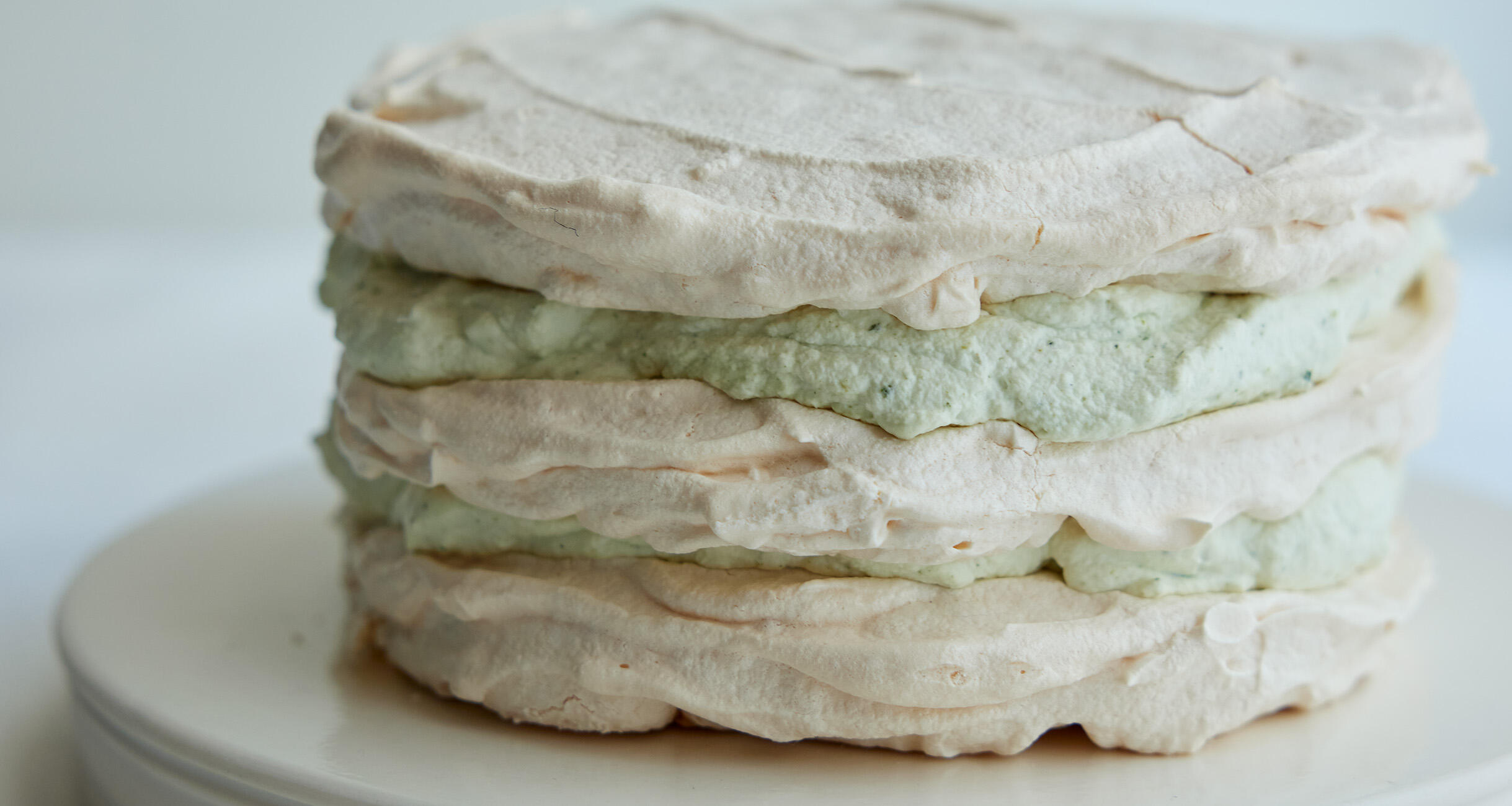 メレンゲ1枚に⑦の半量を塗り広げ、メレンゲ1枚をのせる。残りの煎茶クリーム、残りのメレンゲの順に重ね、冷蔵庫で1時間休ませる。