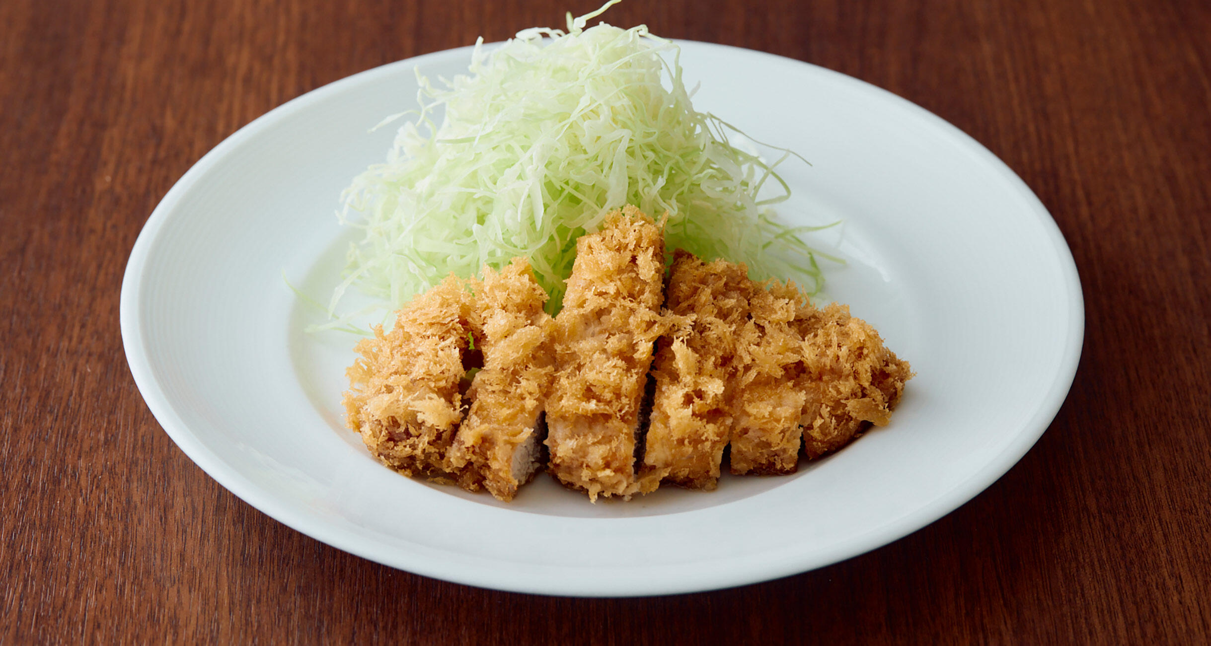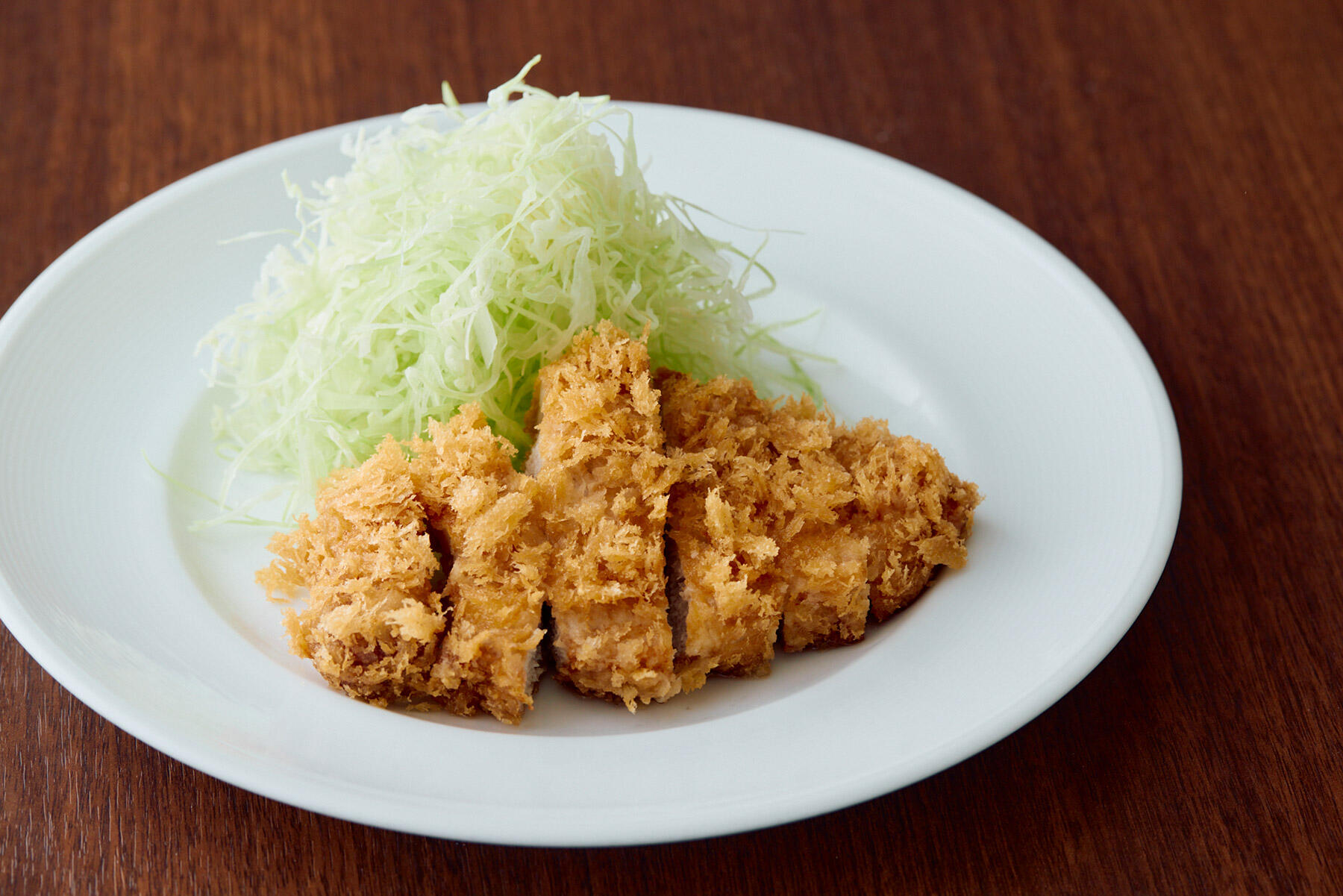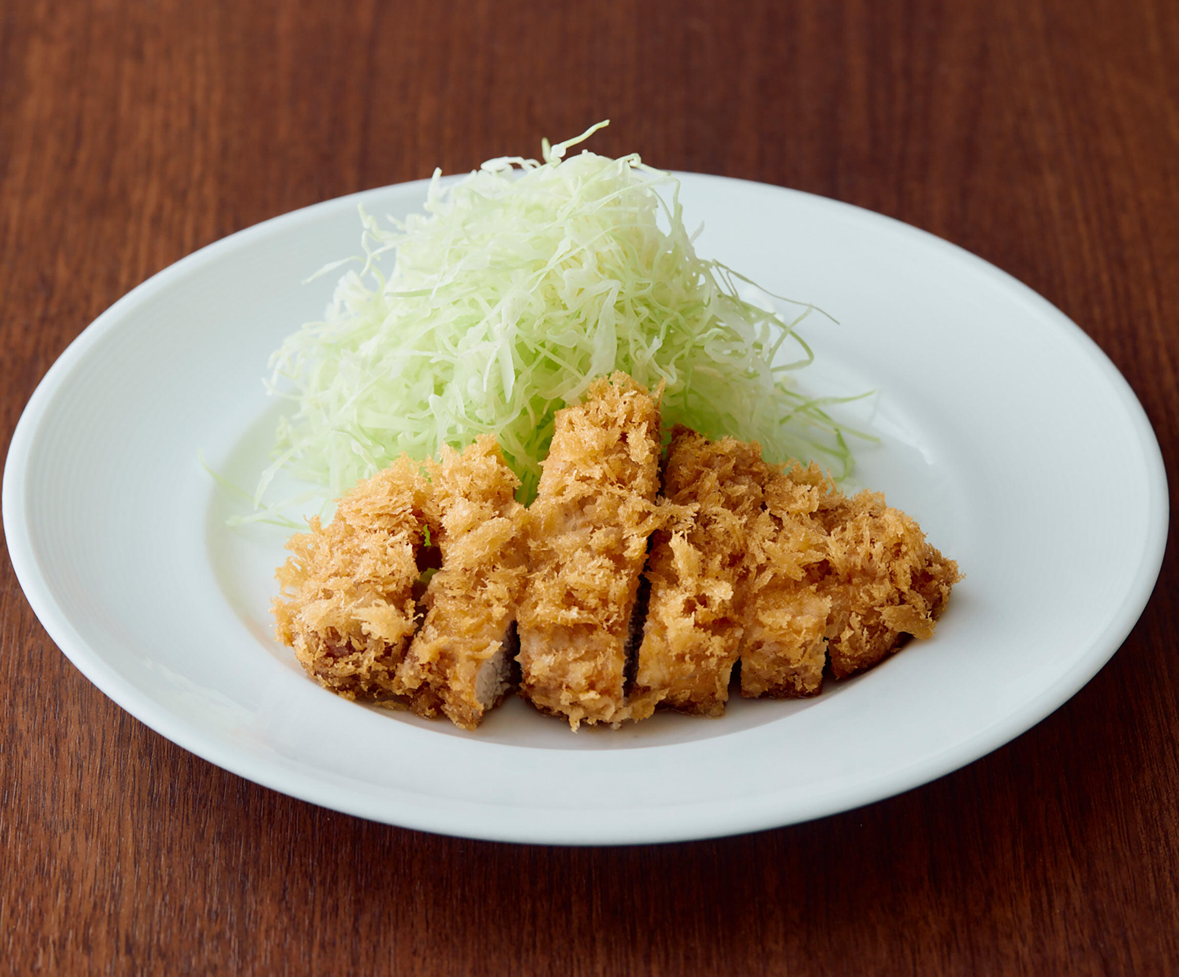 油を170℃に熱し、盛りつける面が上になるよう、ゆっくり寝かせるようにして入れる。肉を入れると温度が下がるので、徐々に170℃に上げていきながら、7分半ほど揚げる。時間が来たら取り出して、網の上に立てて置く。ひと呼吸置いたらキッチンペーパーにのせ、さらに油をきる。2分ほど休ませて余熱で火を通してからキャベツと共に器に盛りつける。