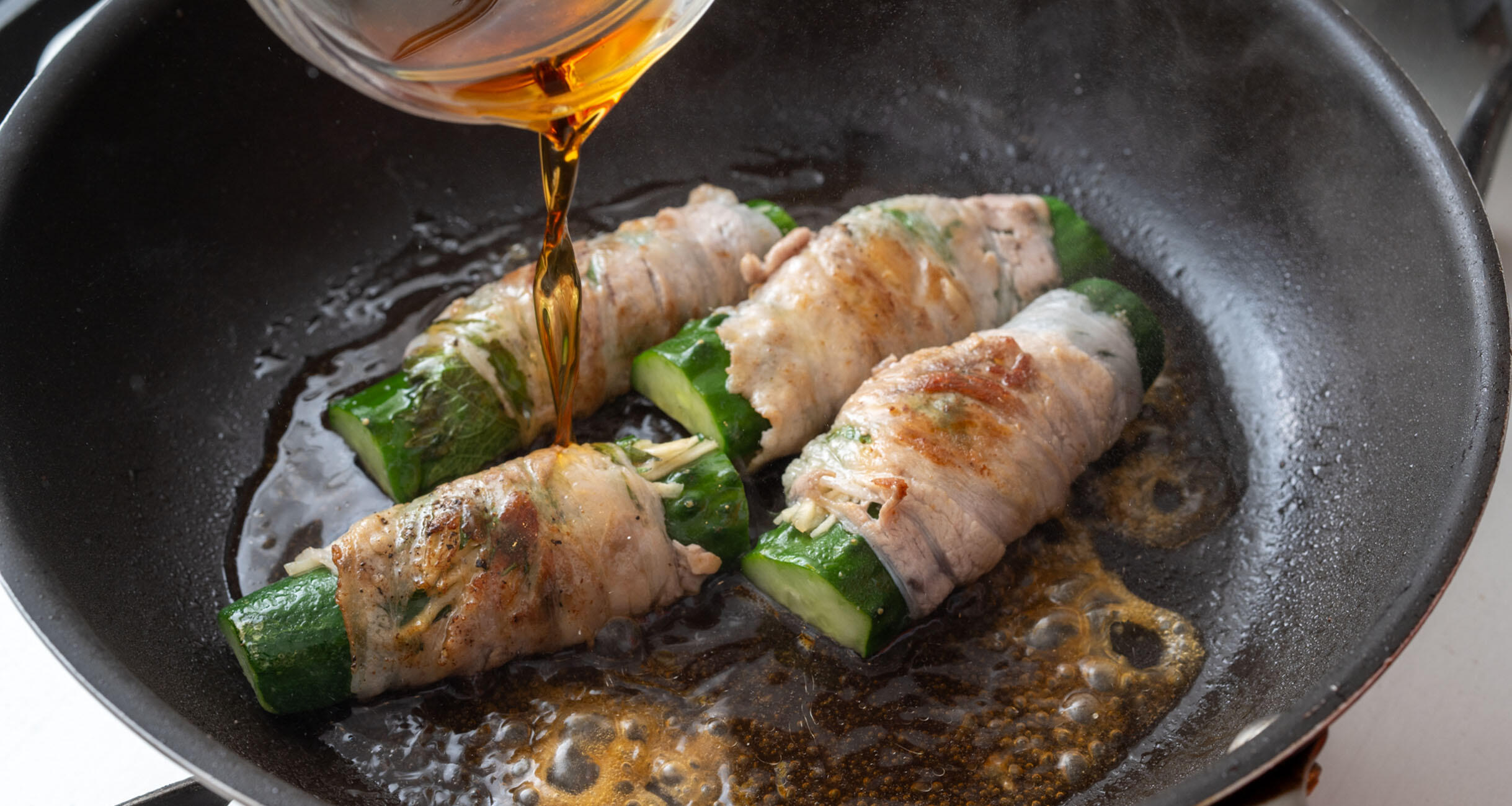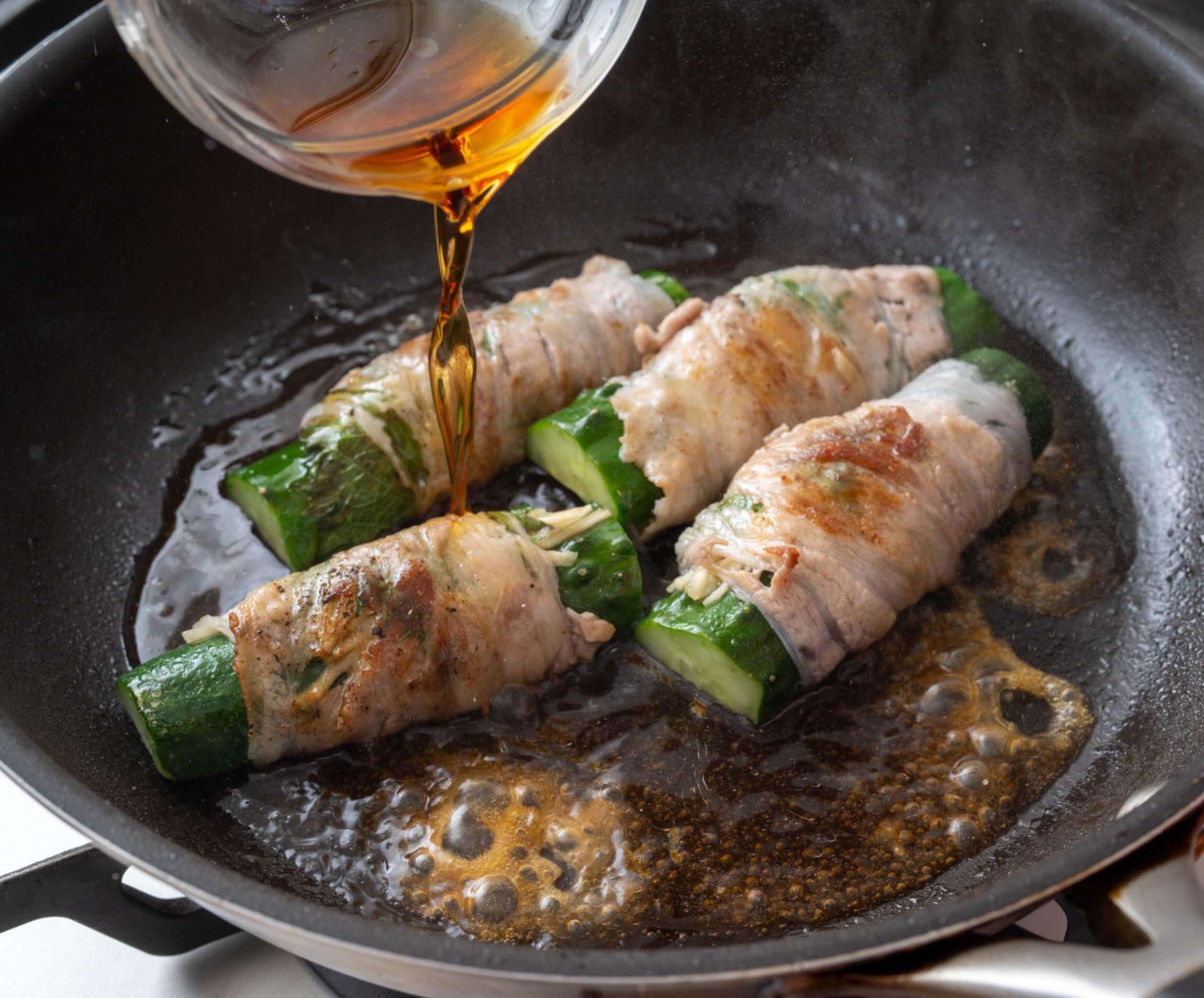 合わせ調味料を加えて、煮詰めながらきゅうりの肉巻きにからめる。