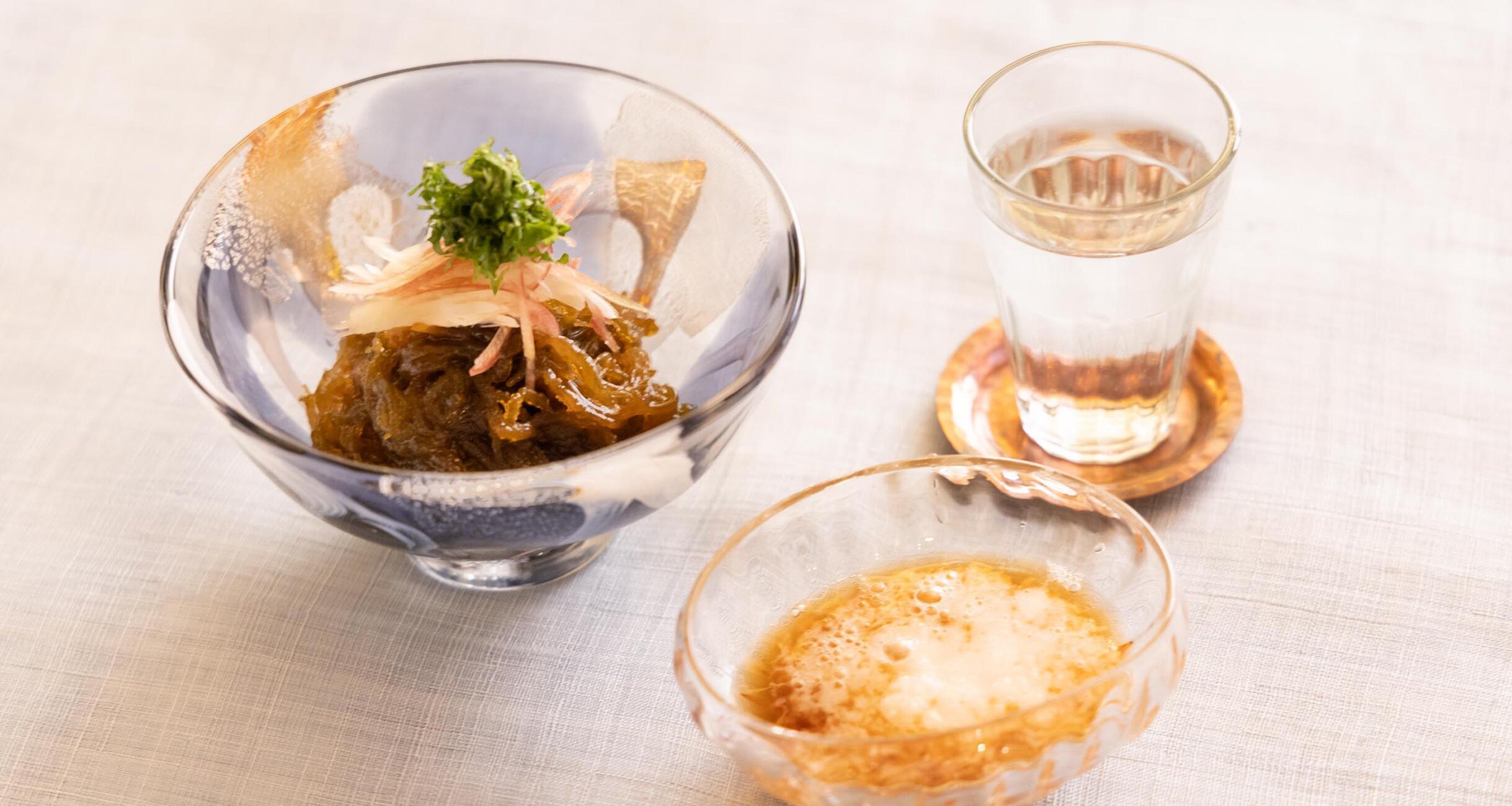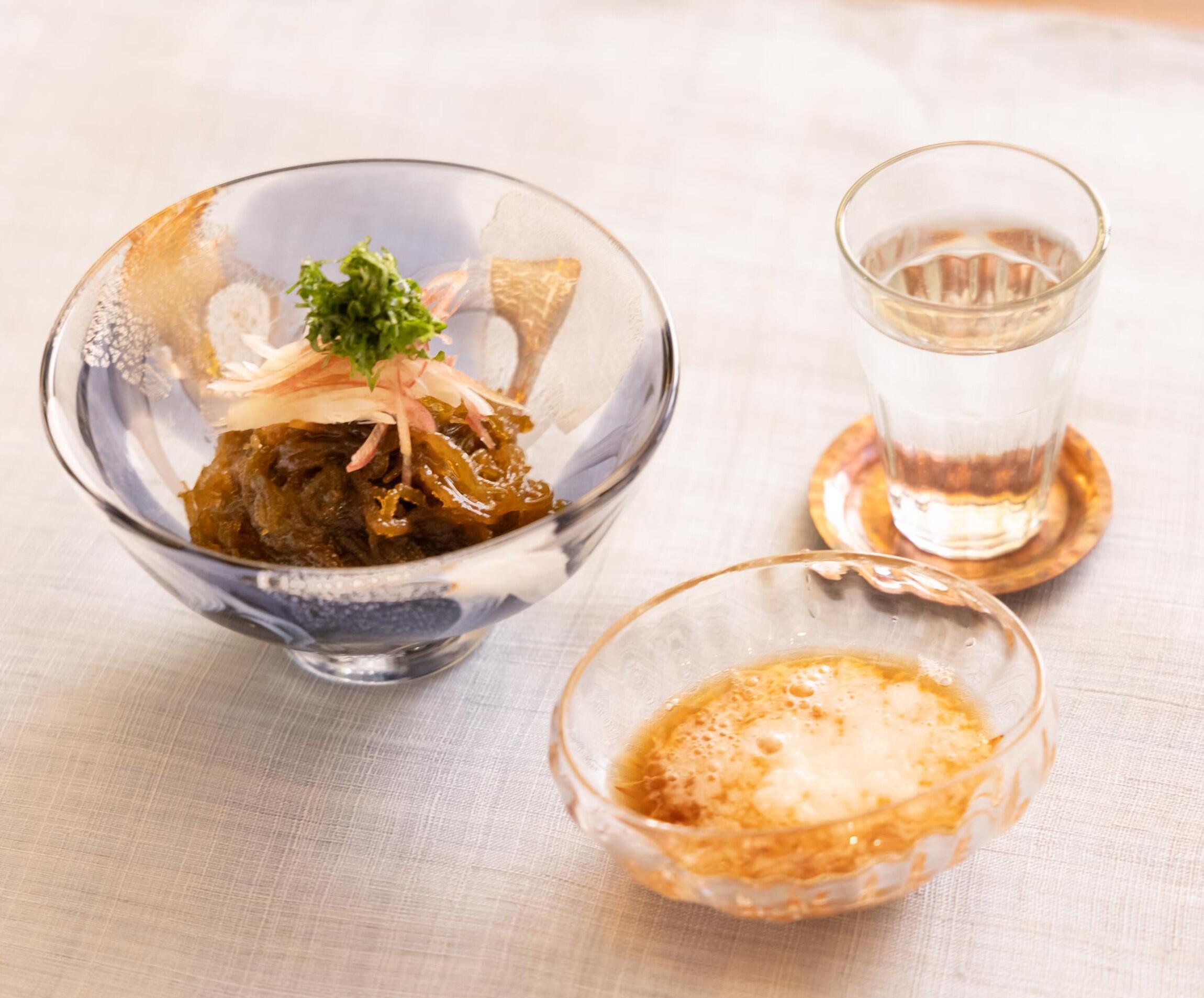 もずくは4月から6月が旬で、とろみと口あたりの良さが特徴です。この料理は、相性のいいとろろのつゆにつけながら、そうめんのようにスルッと食べてもらう仕立て。酸っぱいのがちょっと苦手、という方も食べやすいと思います。