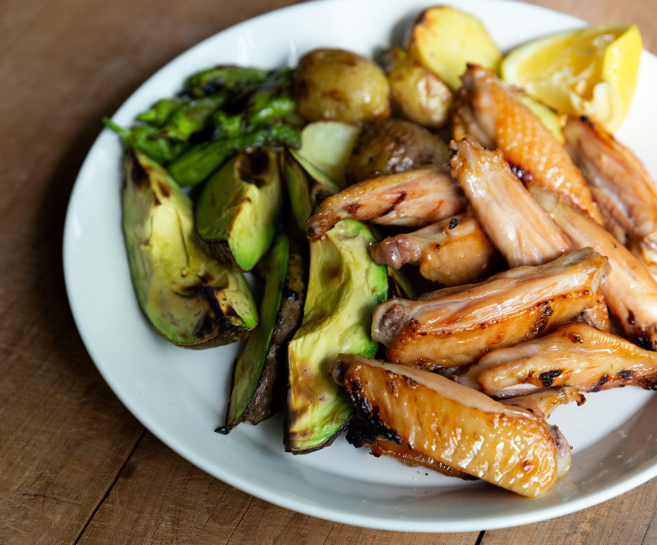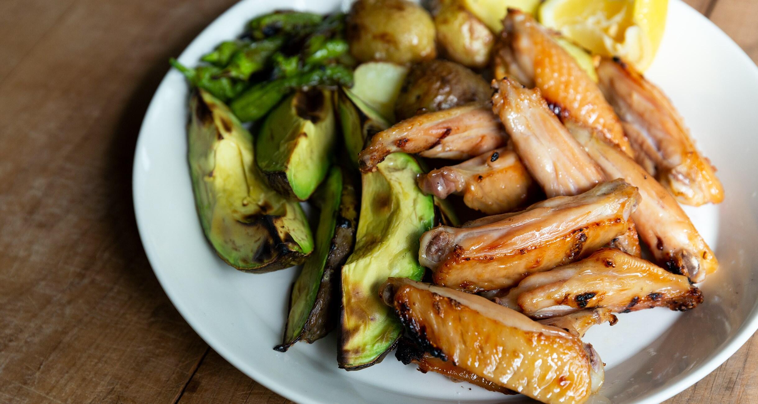 じゃがいもとししとうはBをからめ、アボカドは塩をふる。魚焼きグリルに並べ、焼き色がつくまで焼く。