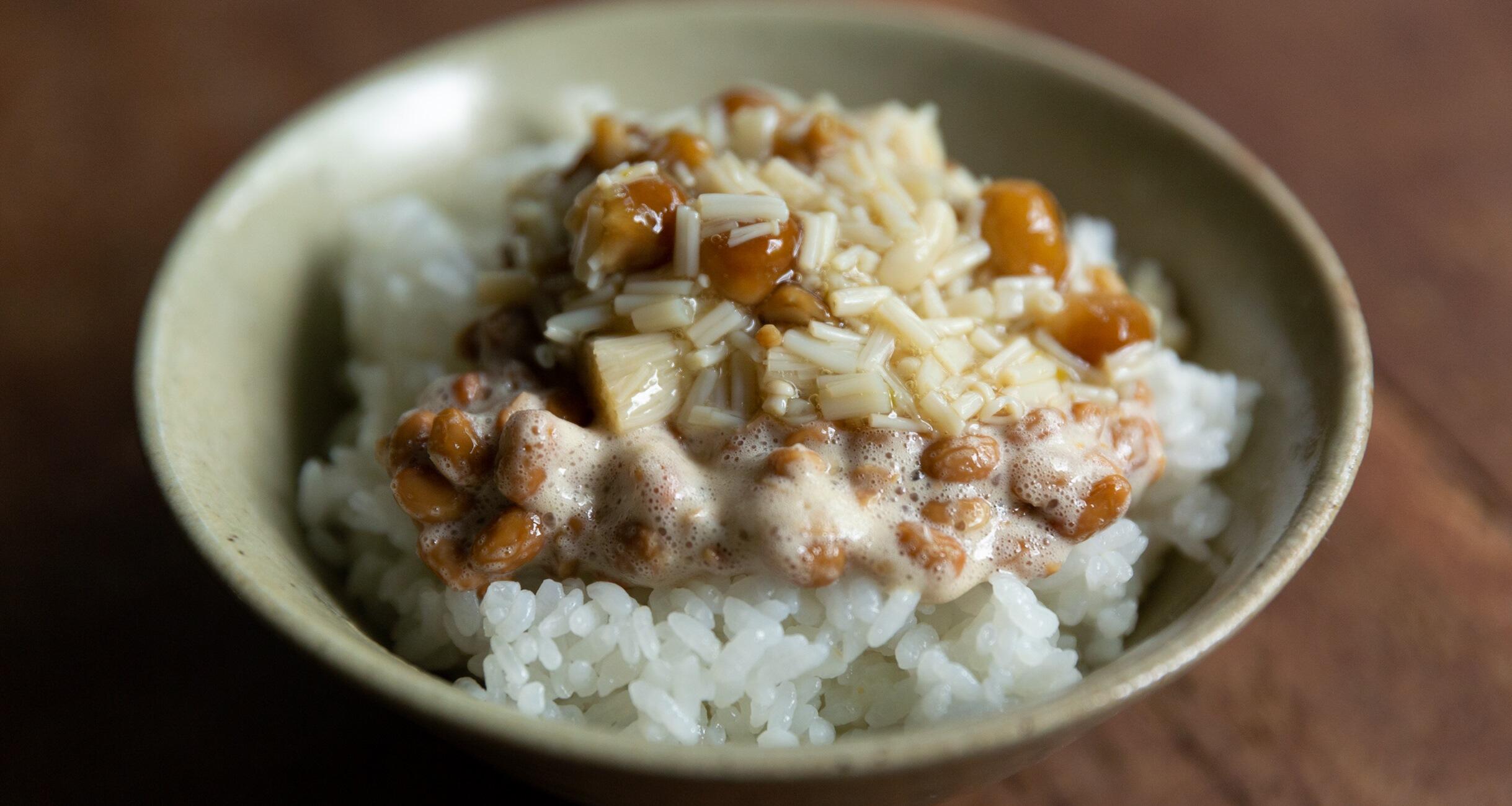 ご飯に③の酢納豆をかけ、なめ茸をのせる。