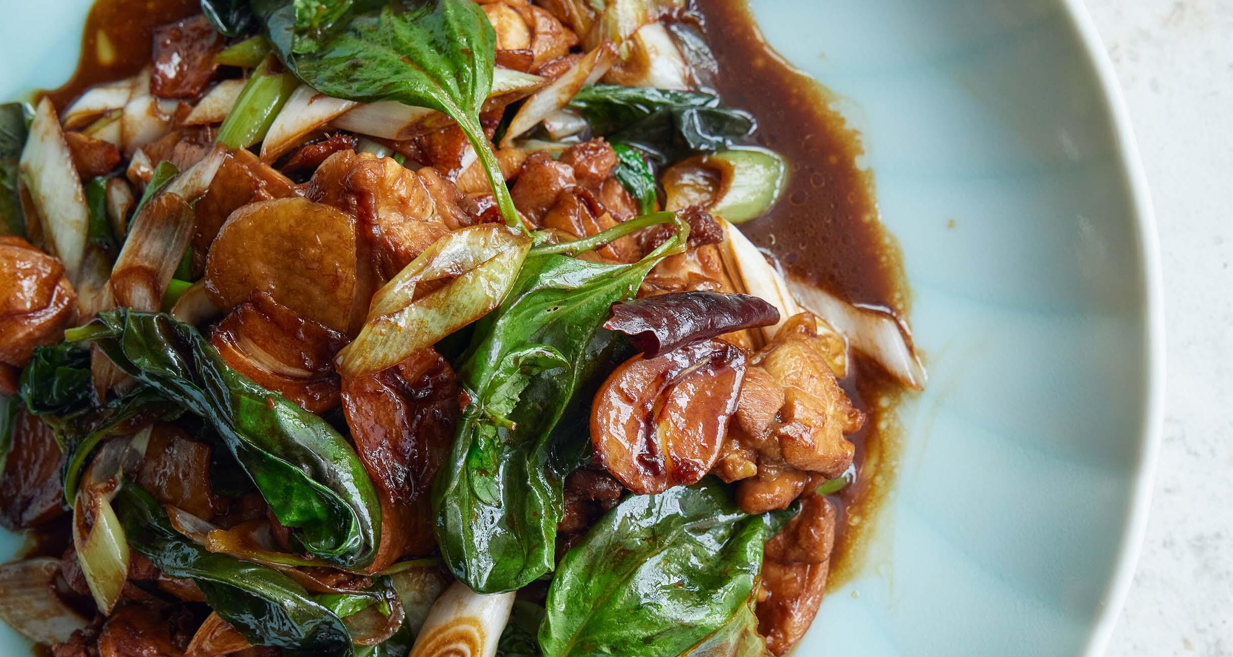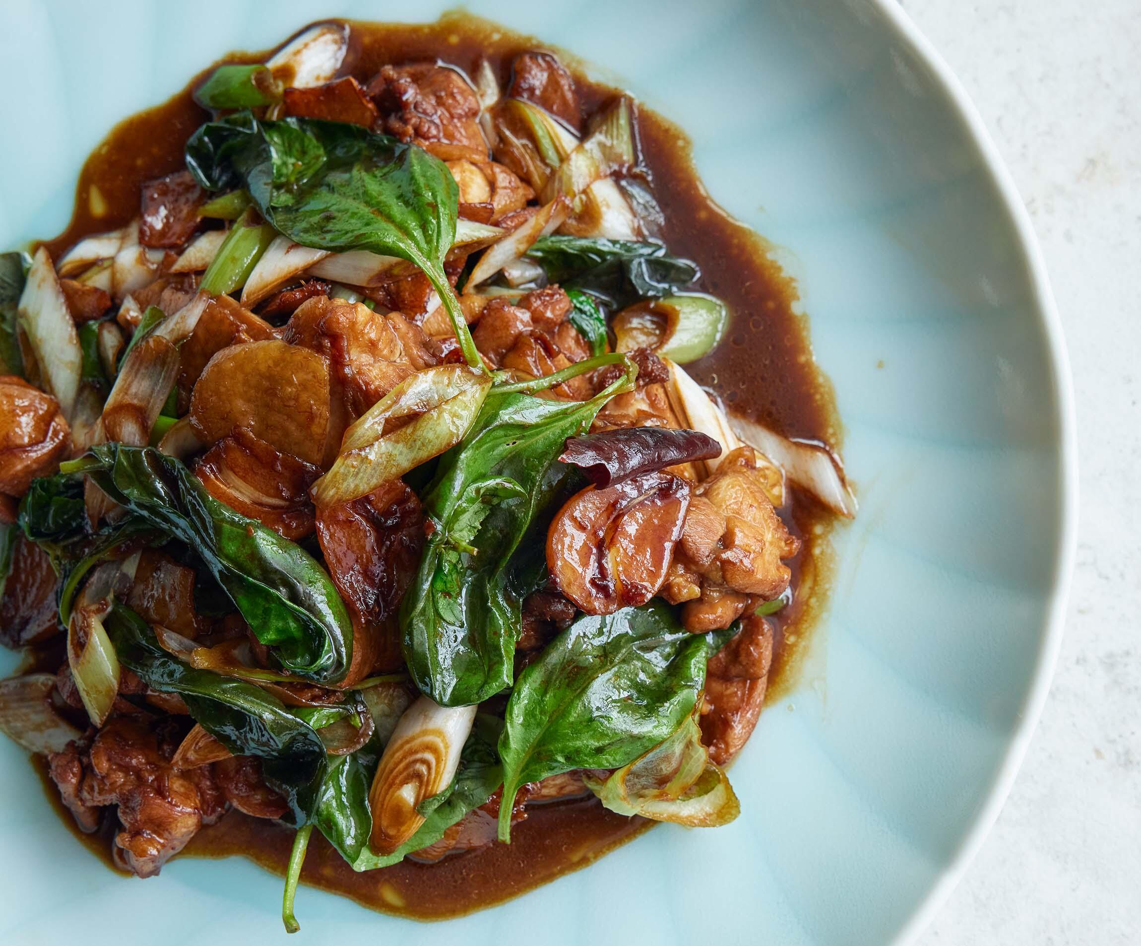 鶏肉を、多めのにんにくと生姜、赤唐辛子とともに、醤油味で炒め煮にした料理。