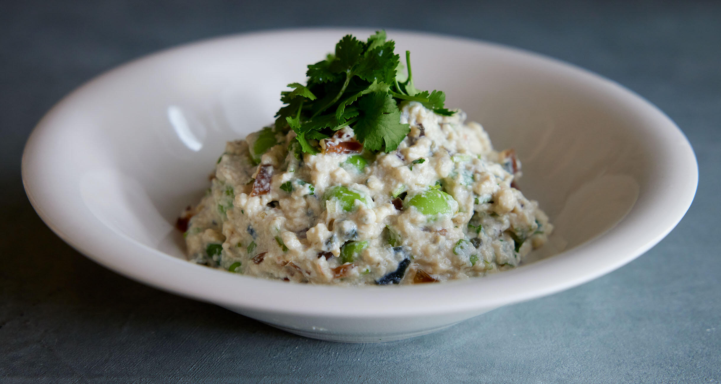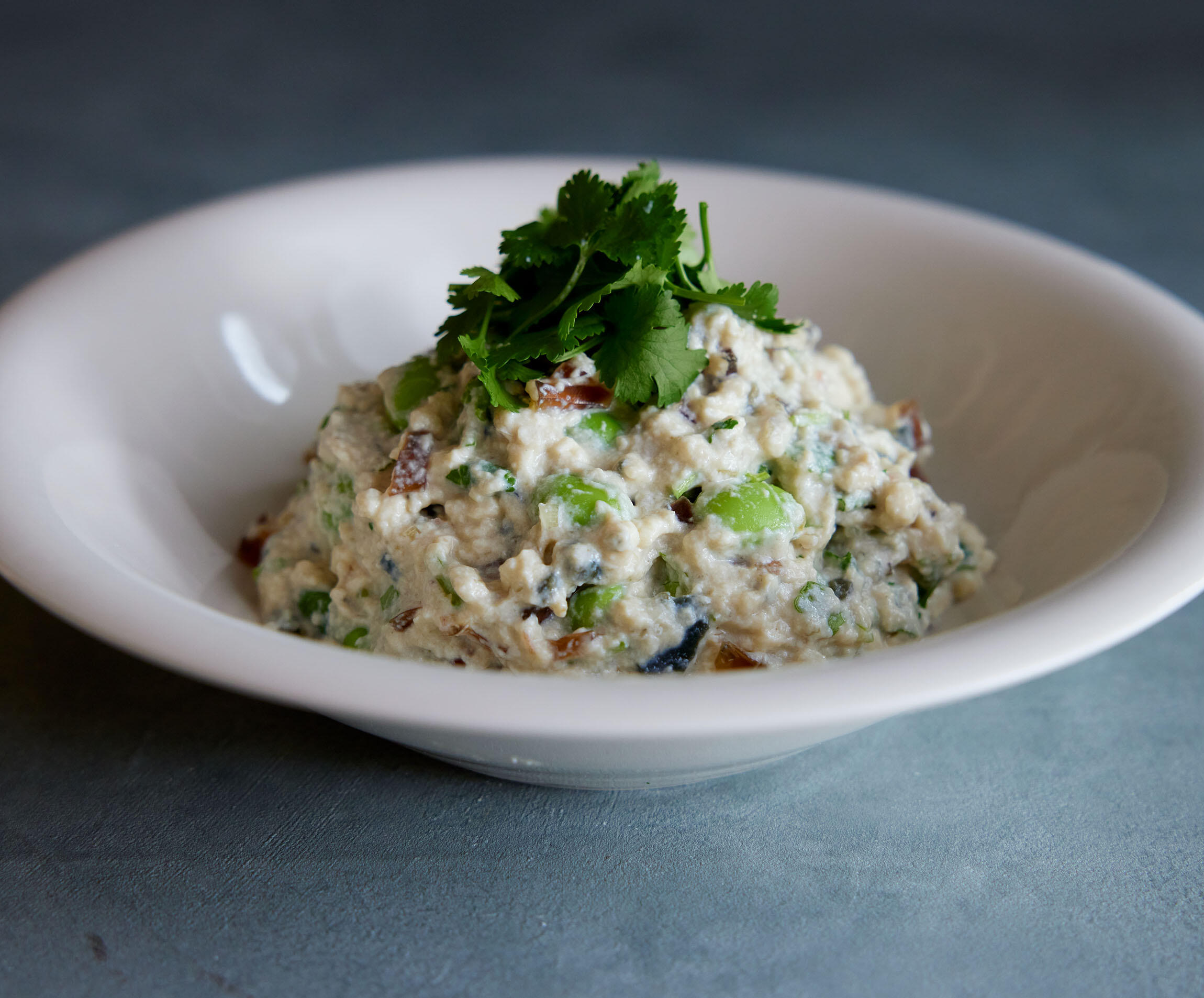 ボウルに豆腐を入れて粗くつぶし、ピータンの黄身、醤油、胡麻油、黒酢、塩を混ぜる。枝豆、みょうが、香菜、生姜、ピータンの白身を加えて和え、香菜の葉を飾る。