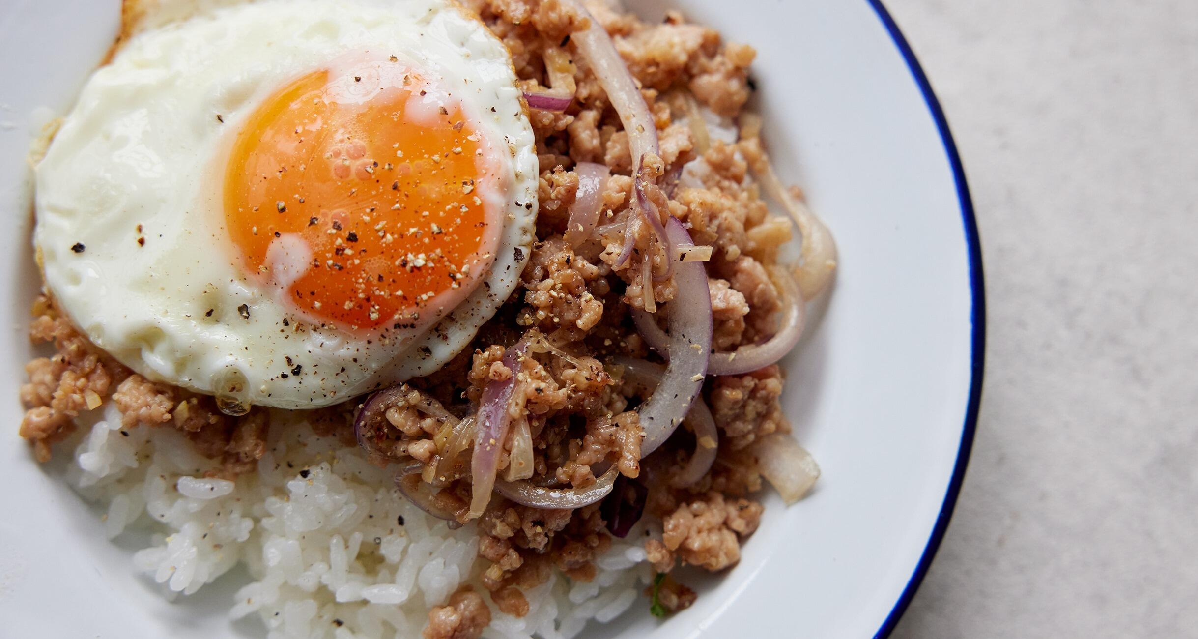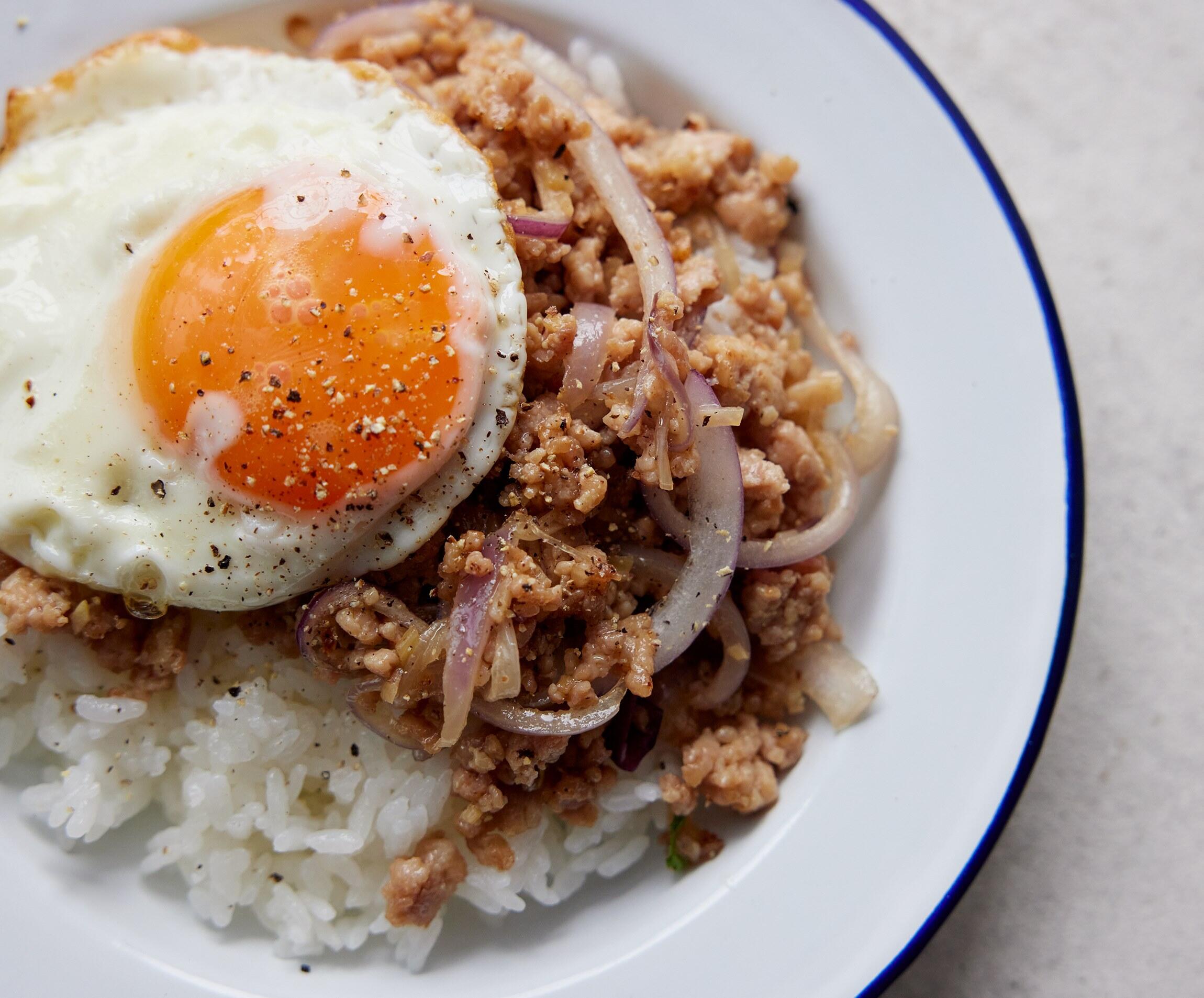 器にご飯とエスニックそぼろを盛り、目玉焼きをのせて胡椒をふる。