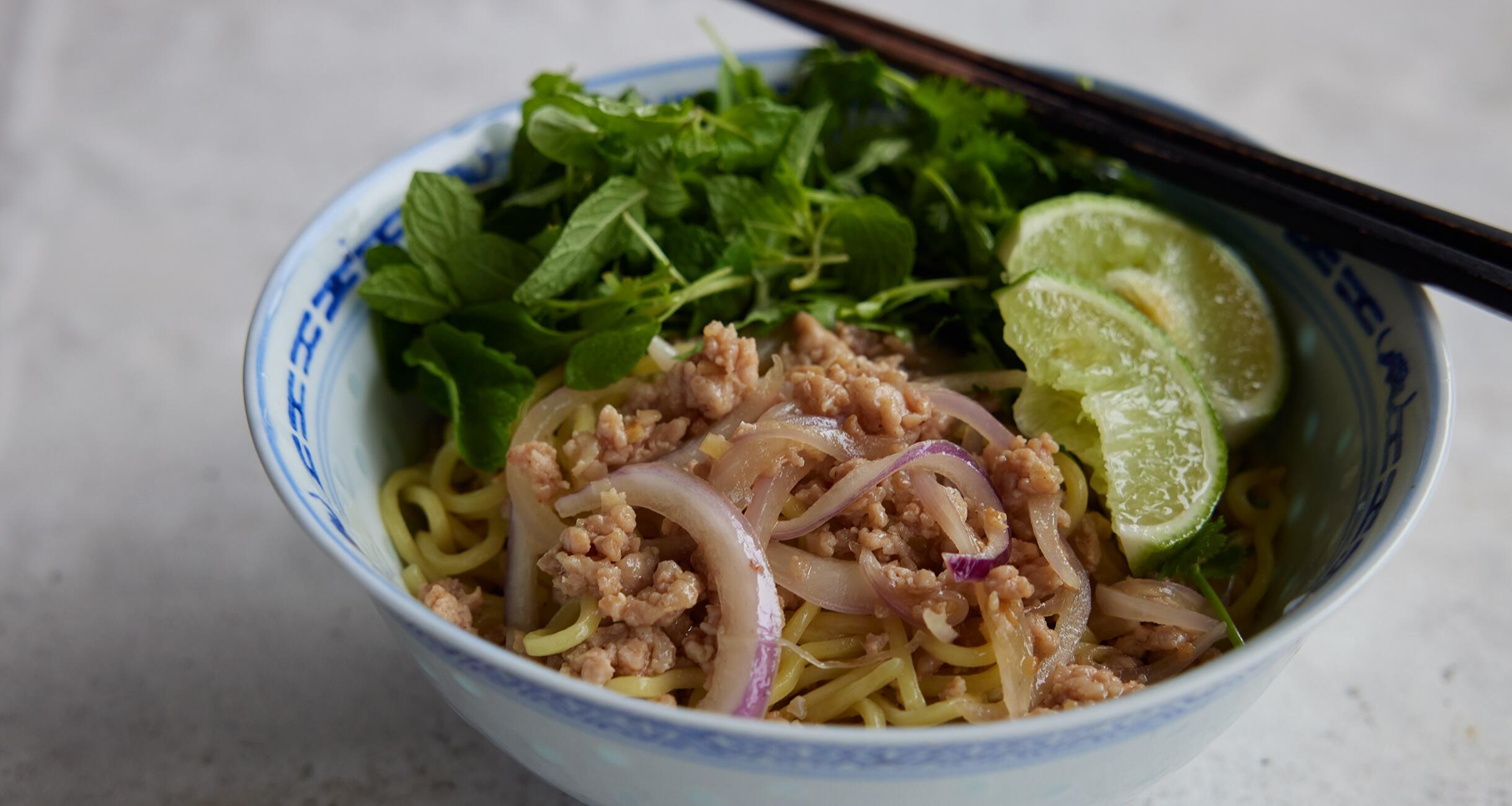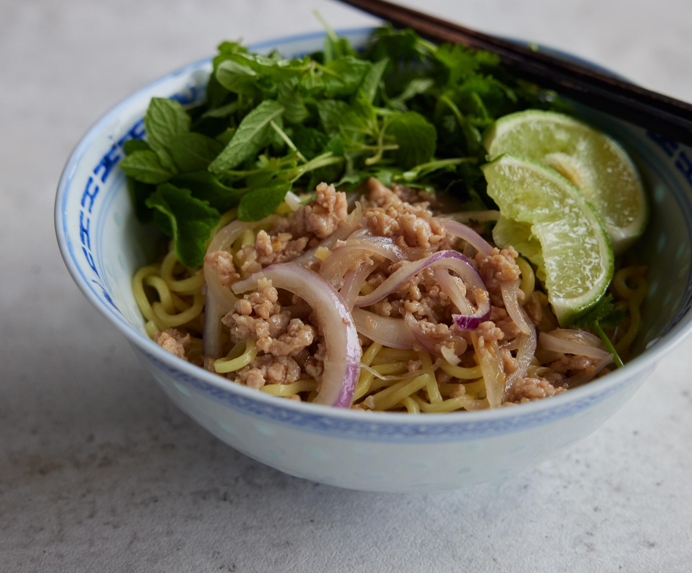 器に②を盛り、香菜、ミント、ライムを添える。香菜とミントを麺に混ぜ、ライムを搾って食べる。