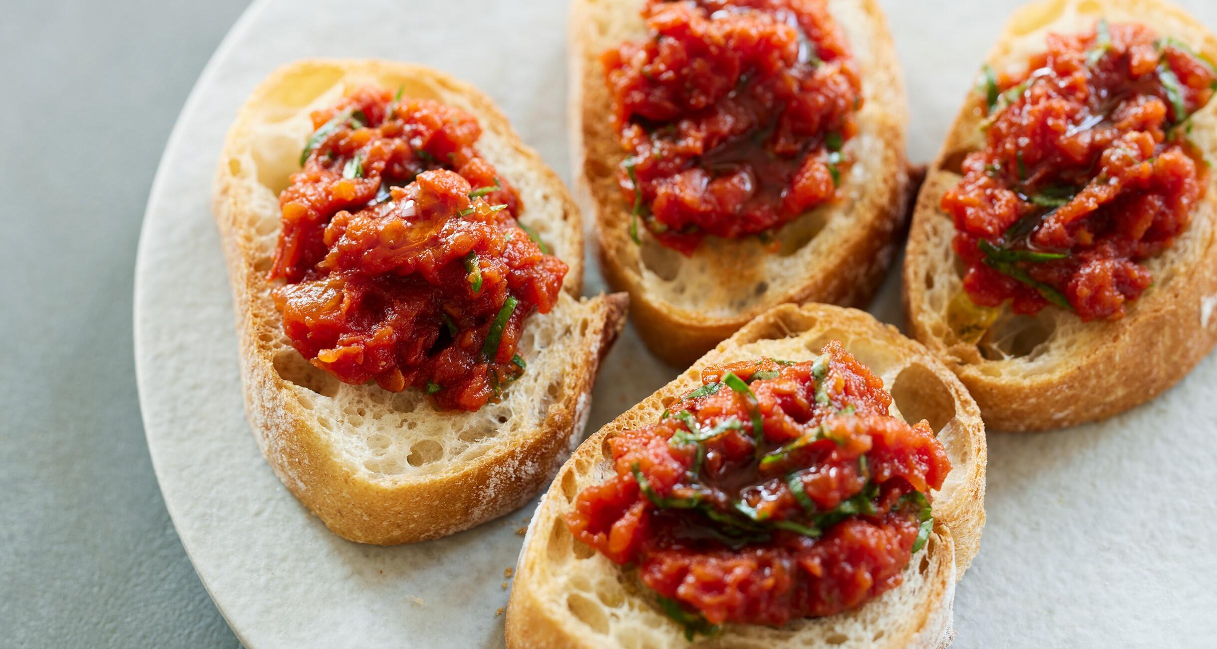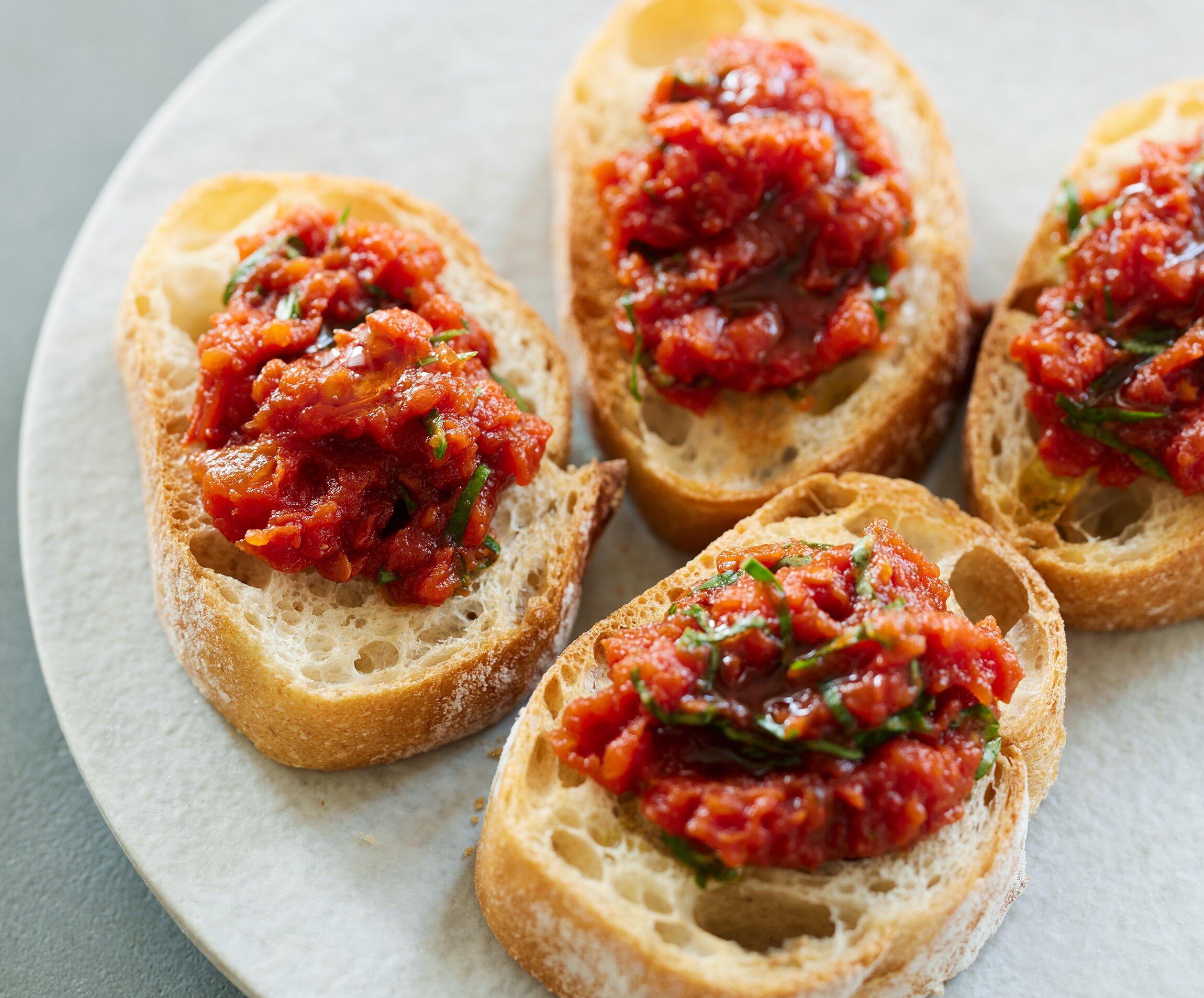 発酵トマトペーストのサルチャがあれば、ブルスケッタも簡単につくれます。バジルとサルチャを混ぜると、どことなく梅干しのような味わいが生まれるのが不思議。キリッと冷えたビールかスパークリングが欲しくなる一品です!体がホッとする発酵食品を取り入れたレシピを、料理研究家の真藤舞衣子さんに教えてもらいました。