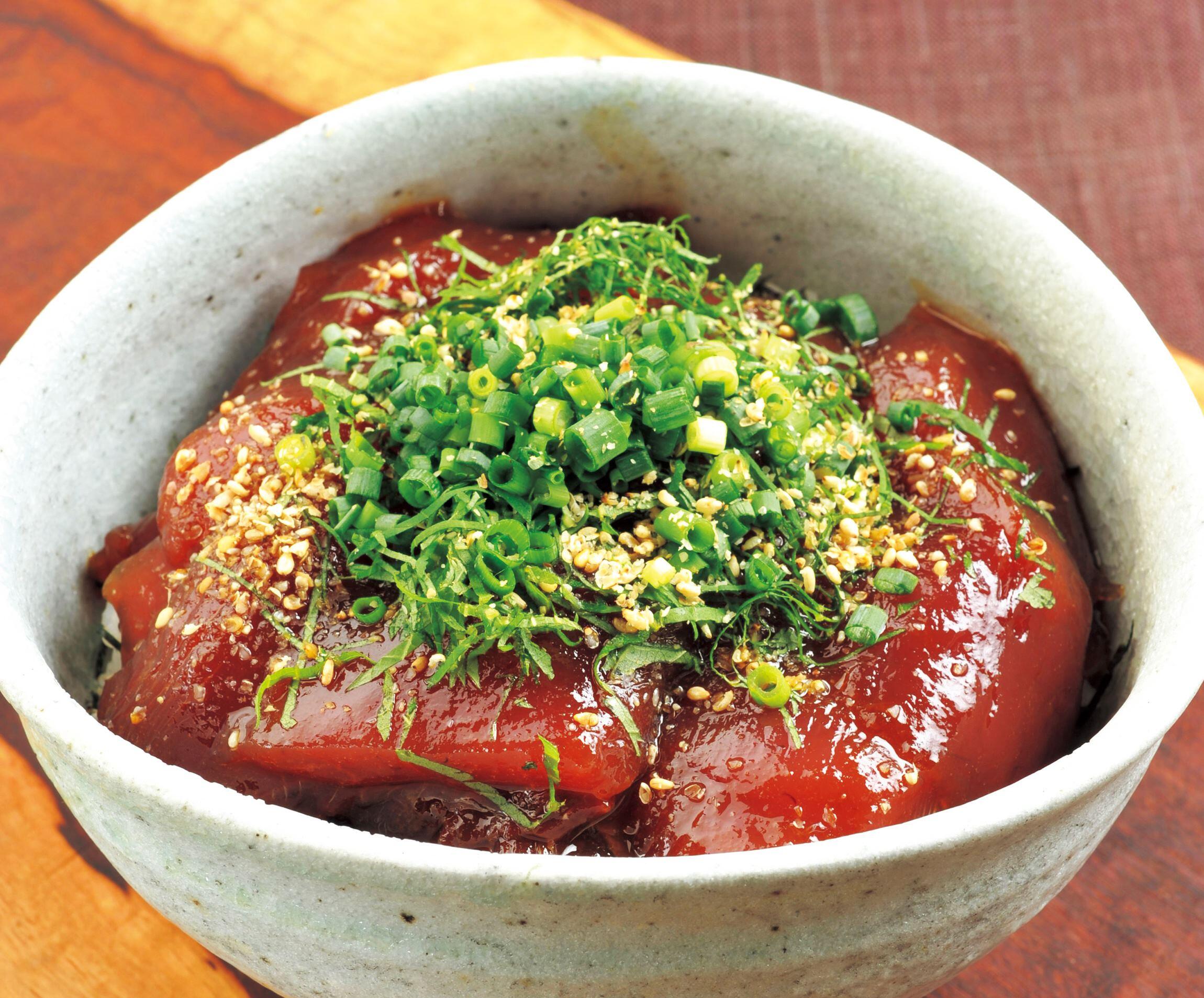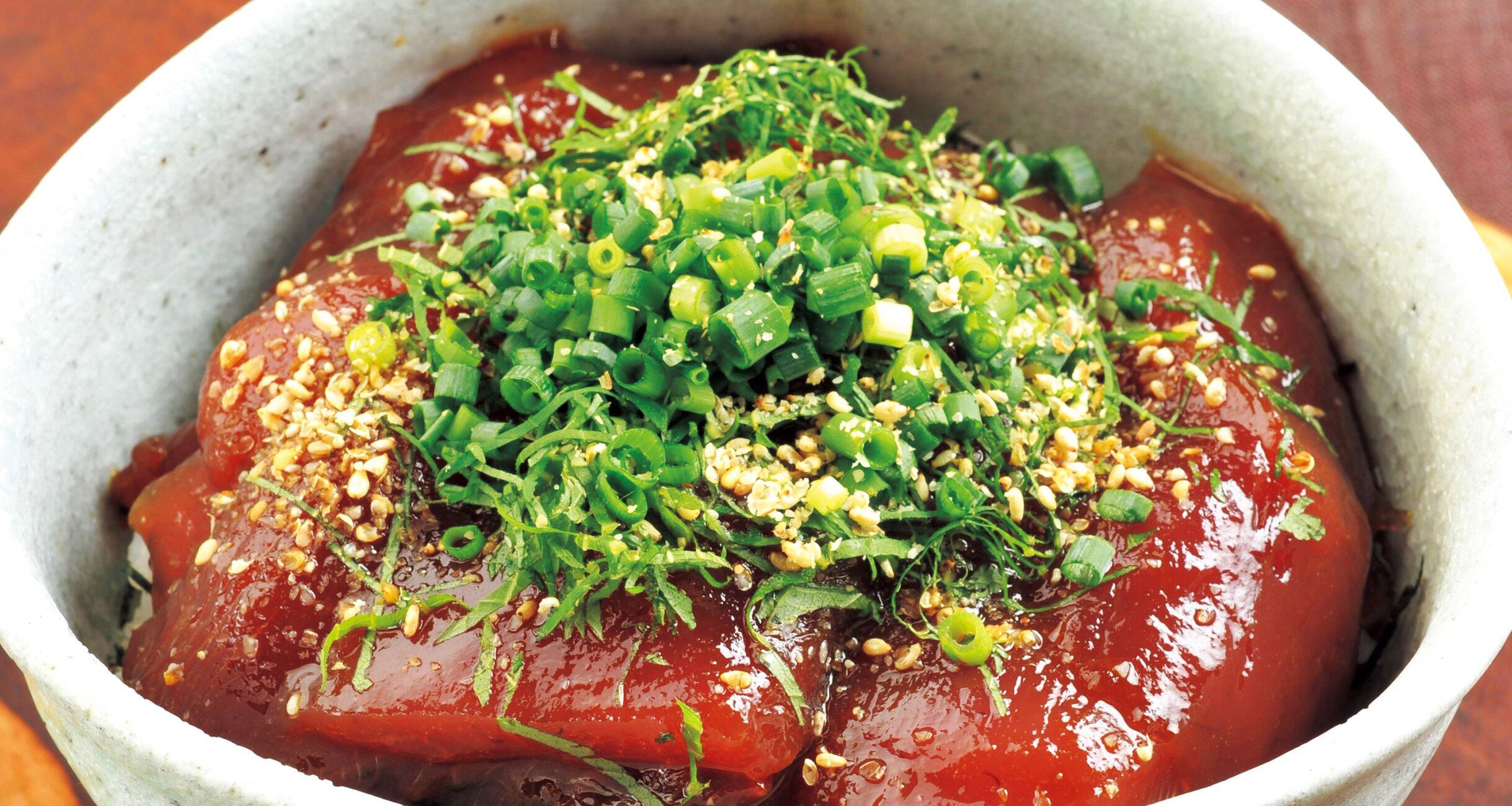 艶やかなカツオに食欲倍増!卵黄辛子醤油に漬け込むことで、濃厚な旨味とコクがプラスされます。酒が進む海鮮丼レシピを「赤坂まるしげ」店主の小久保茂紀さんに教わりました。