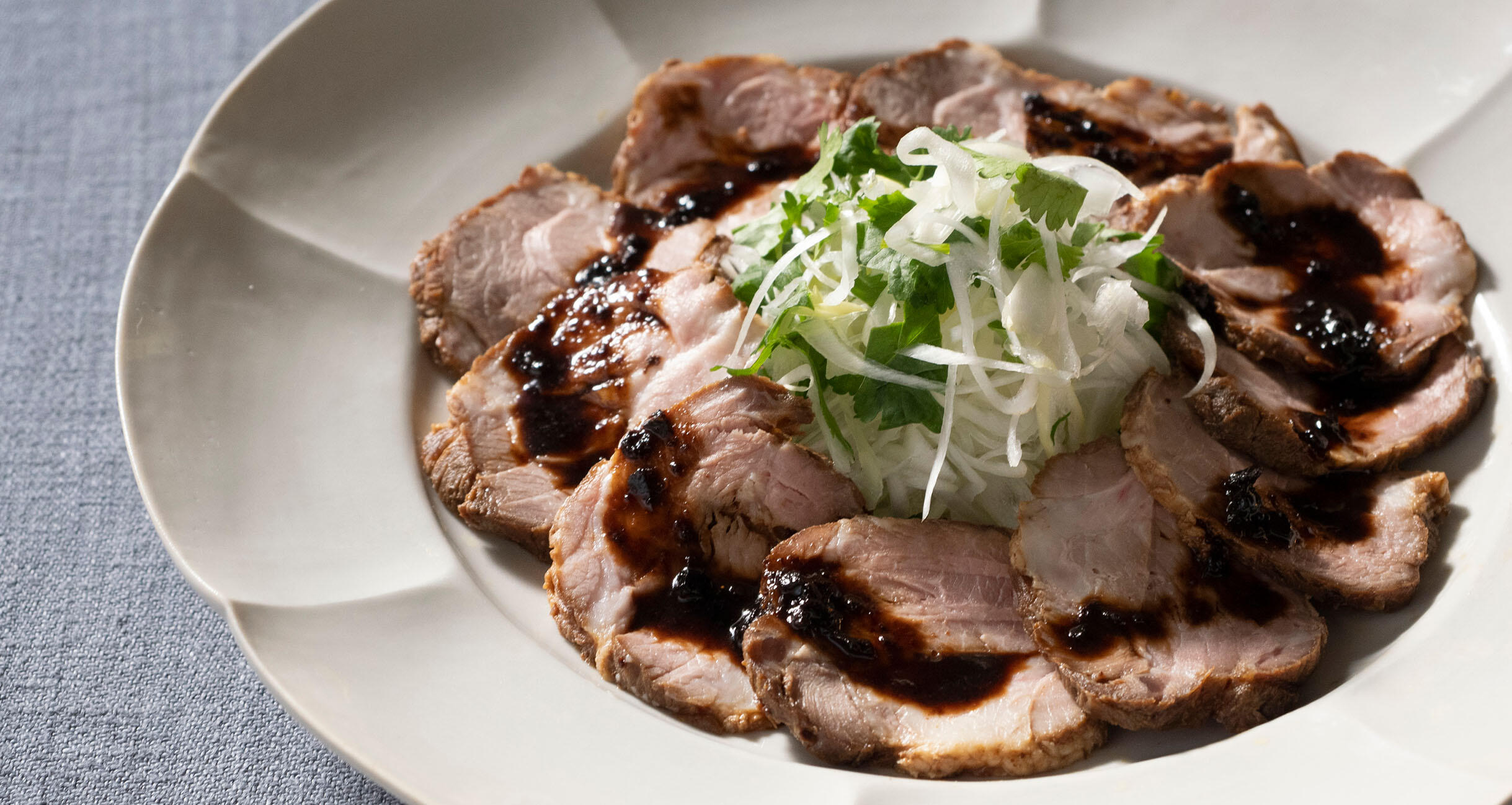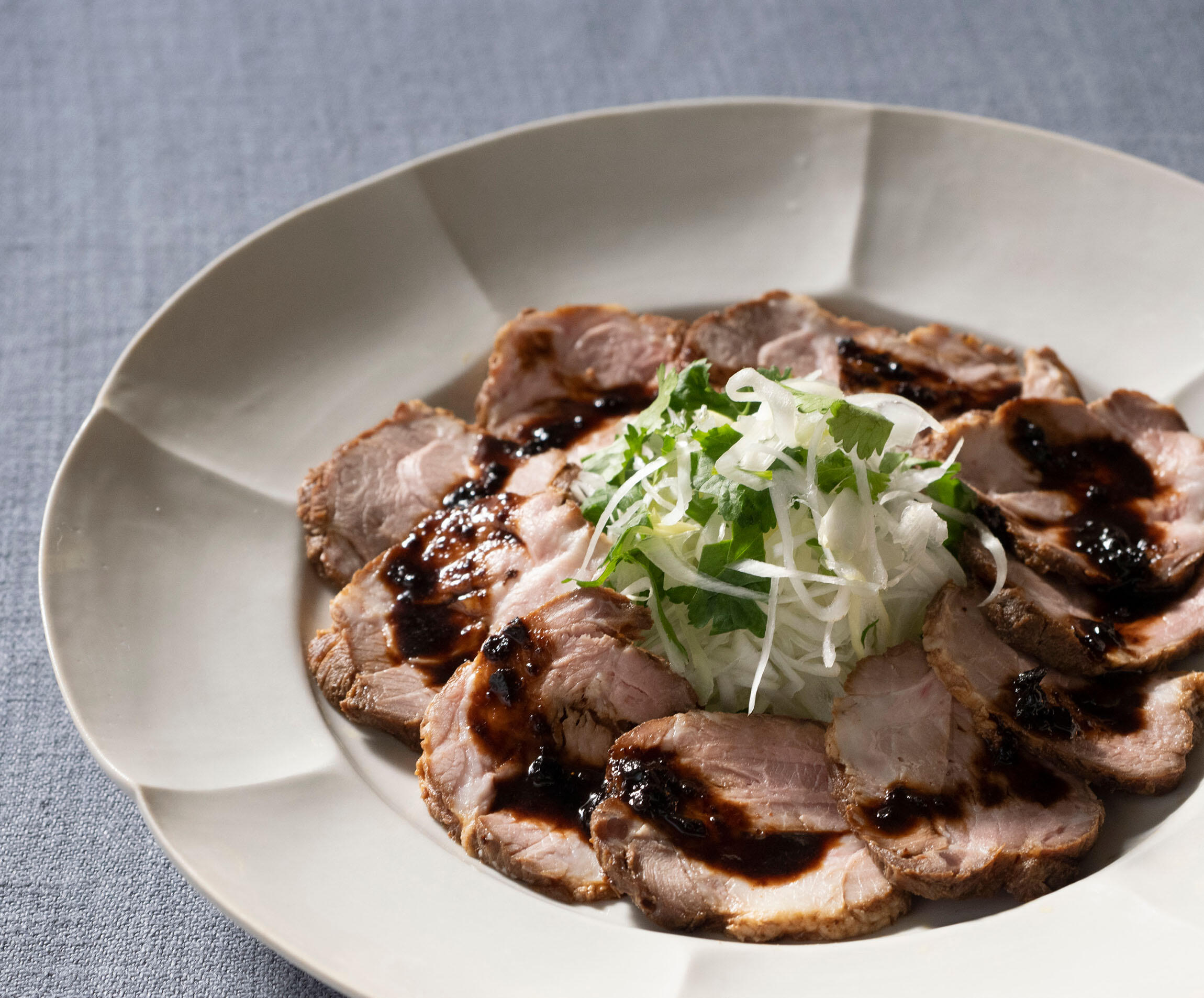 ②の豚肉は幅7~8mmの薄切りにして皿に並べる。袋に残った漬け汁はフライパンに入れて中火で煮詰め、肉にかける。