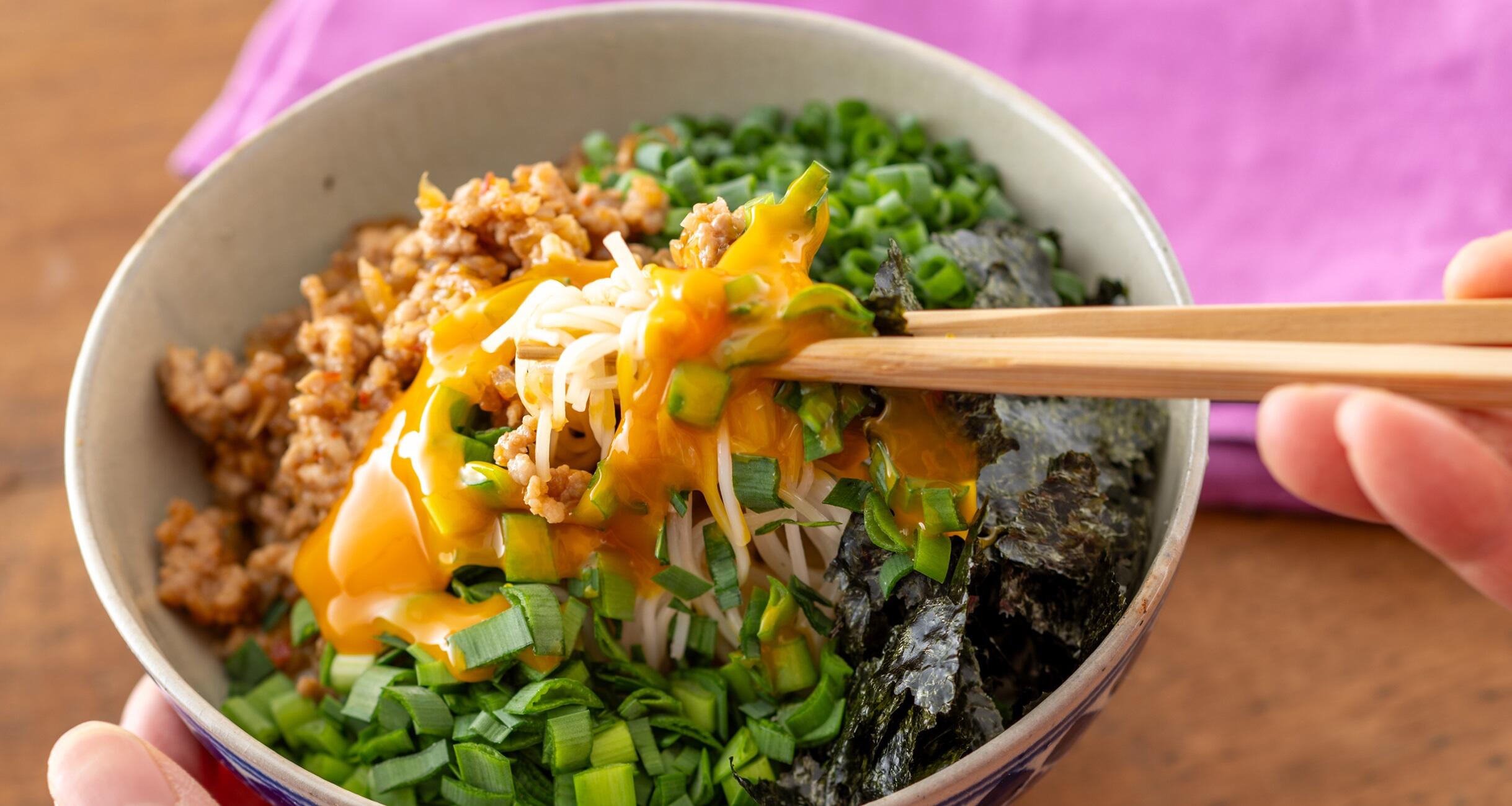 丼にそうめんを守分、肉みそ、小ねぎ、にら、海苔をのせる。真ん中には卵黄をのせたら出来上がり。混ぜながら食べる。