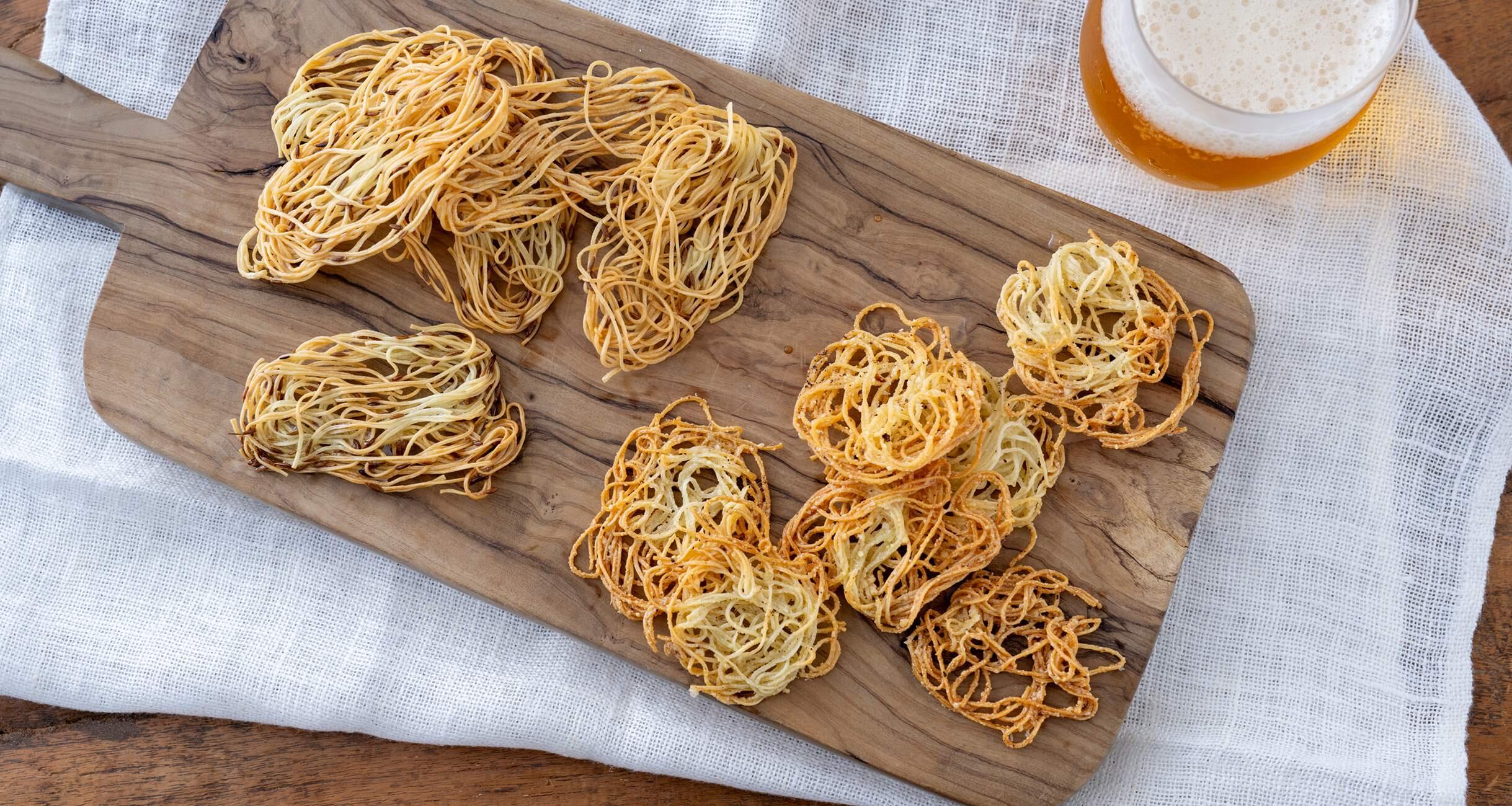 「パリッとした歯ざわりになるように焼き上げるには、成形がポイントです。天板の上で形づくるときに、麺が厚ぼったくならないように、薄く広げるようにしてくださいね。