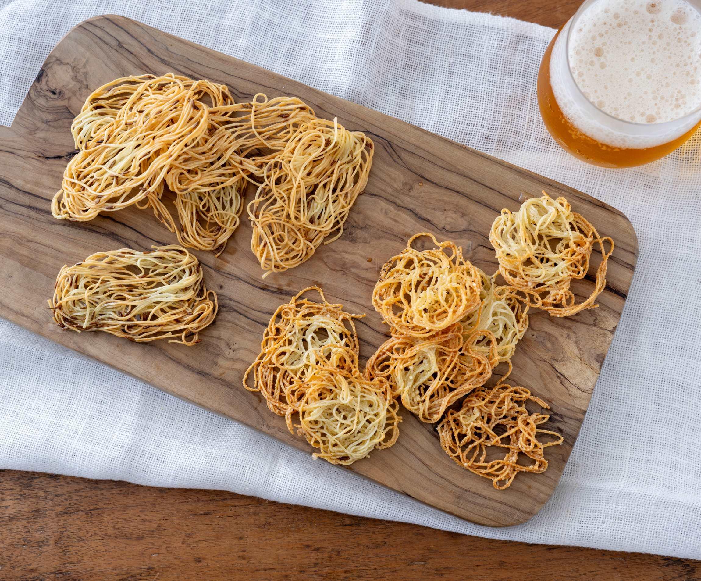 今回、尾身さんがつくってくれた“そうめんスナック”は“ペッパーチーズ味”と“クミンバター味”の2種類。パリッと焼かれてオーブンから出てきた姿は、こんがりいい色!