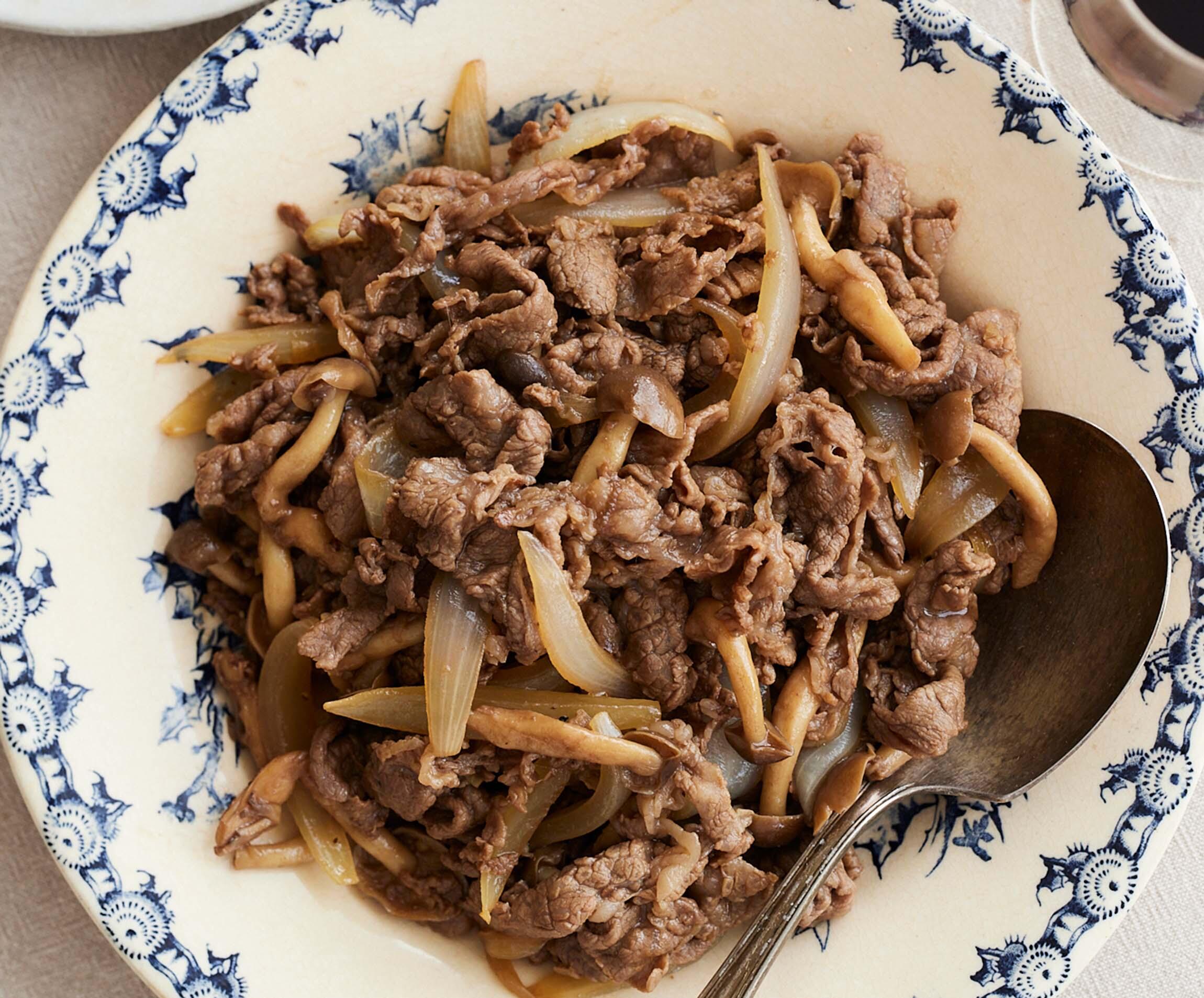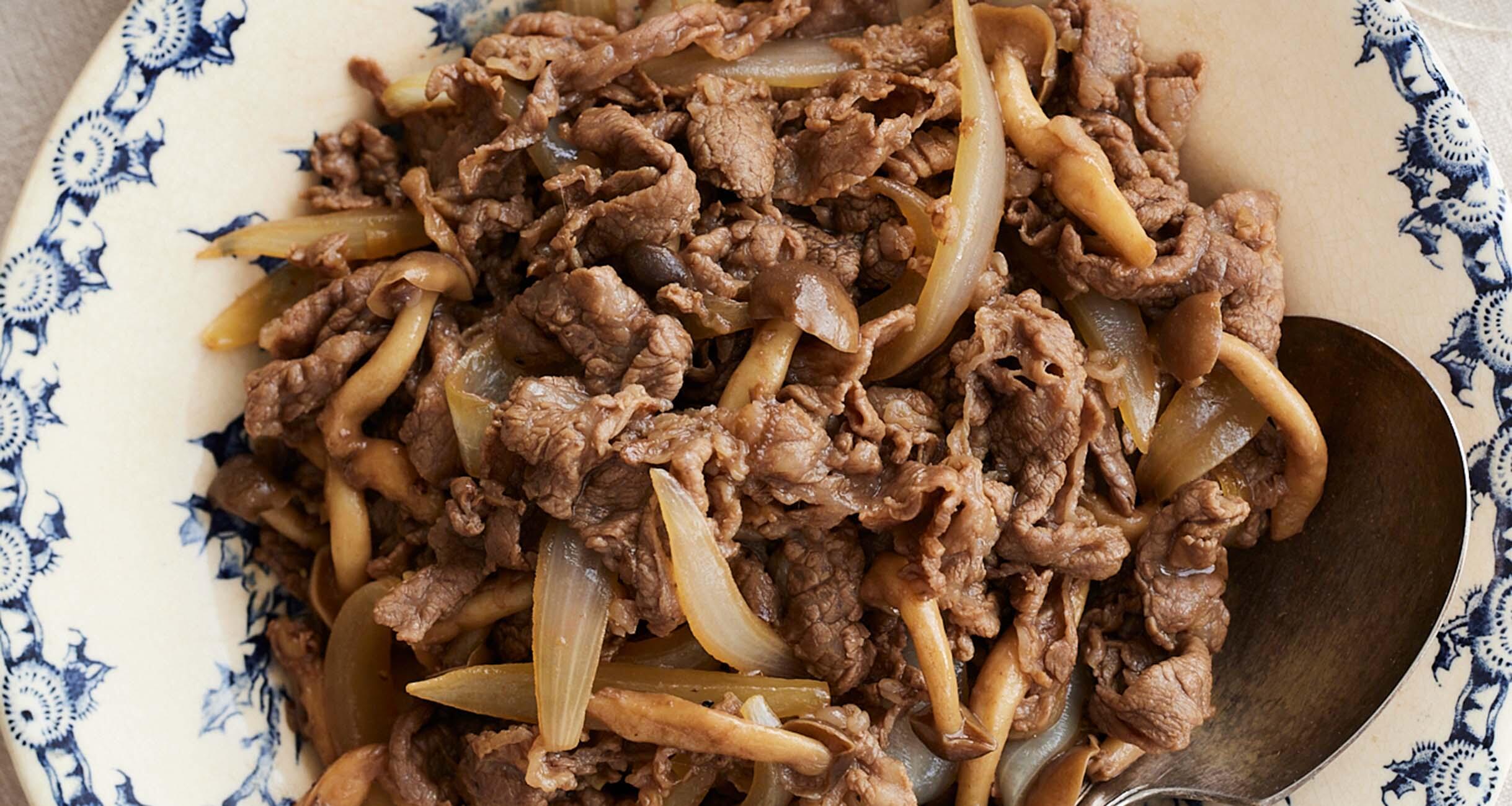 フライパンににんにくとオリーブオイルを入れて中火にかける。香りが立ったら牛肉と玉ねぎ、しめじを加えて、牛肉の色が変わる程度まで炒める。