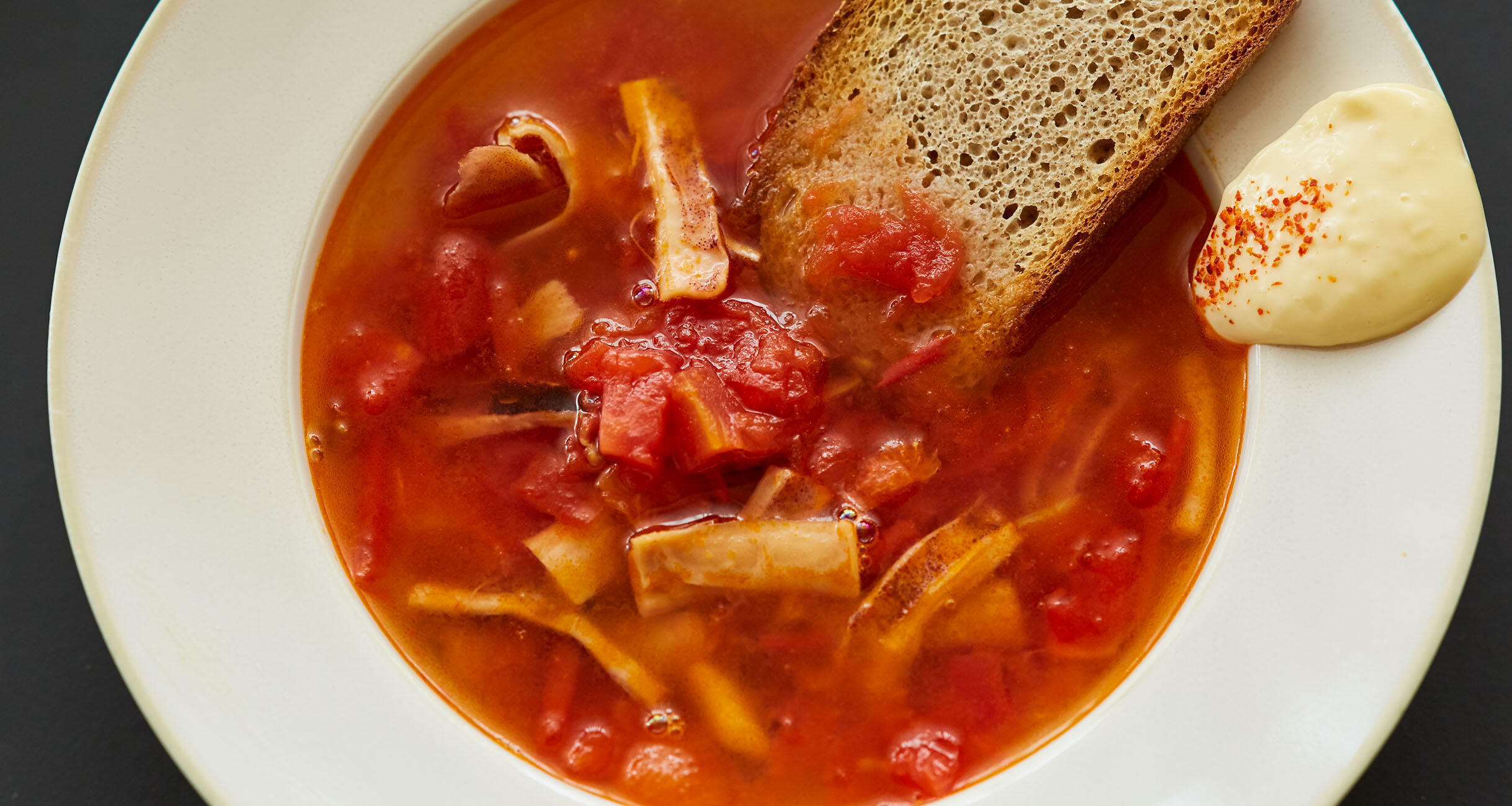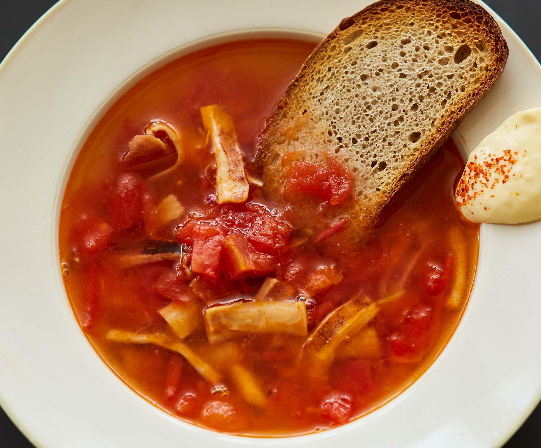 スルメのもどし汁とトマトだけなのになんとも奥行きのある深い味わい。マヨネーズとにんにく、一味唐辛子でつくった簡単ソースを添えると、まるでスープ・ド・ポワソンのルイユソース! スープを味わった後に加えるとあら不思議。炙ったスルメにマヨネーズをつけているみたい!