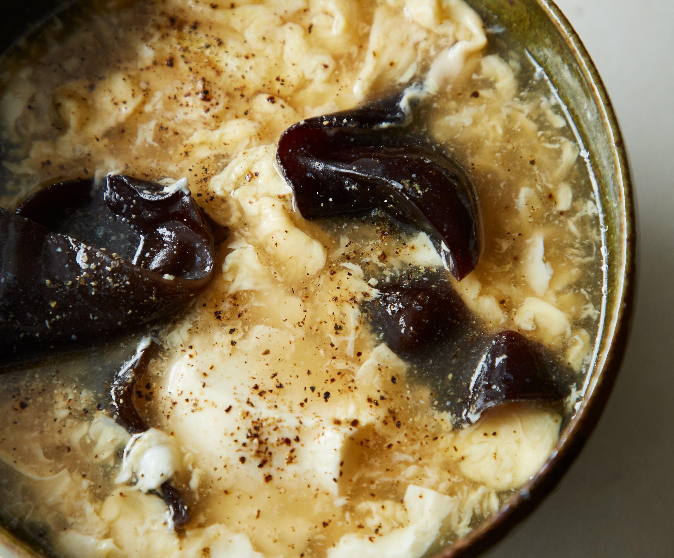煮立ったら酢を加え、同量の水で溶いた片栗粉をゆっくり混ぜながら少しずつ加える。溶き卵を回し入れ、浮かび上がってきたら、黒胡椒をふる。