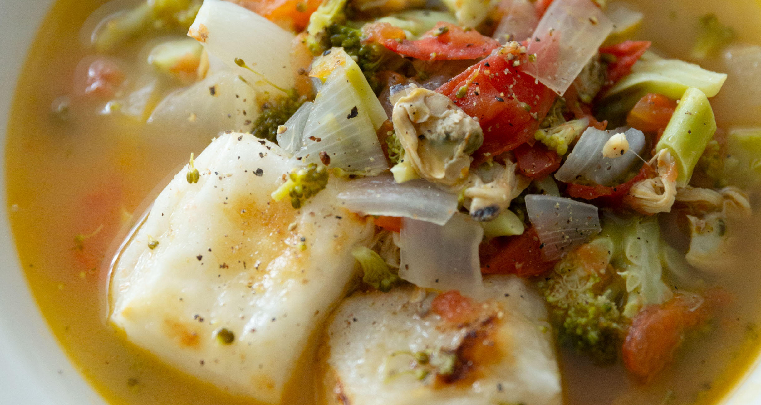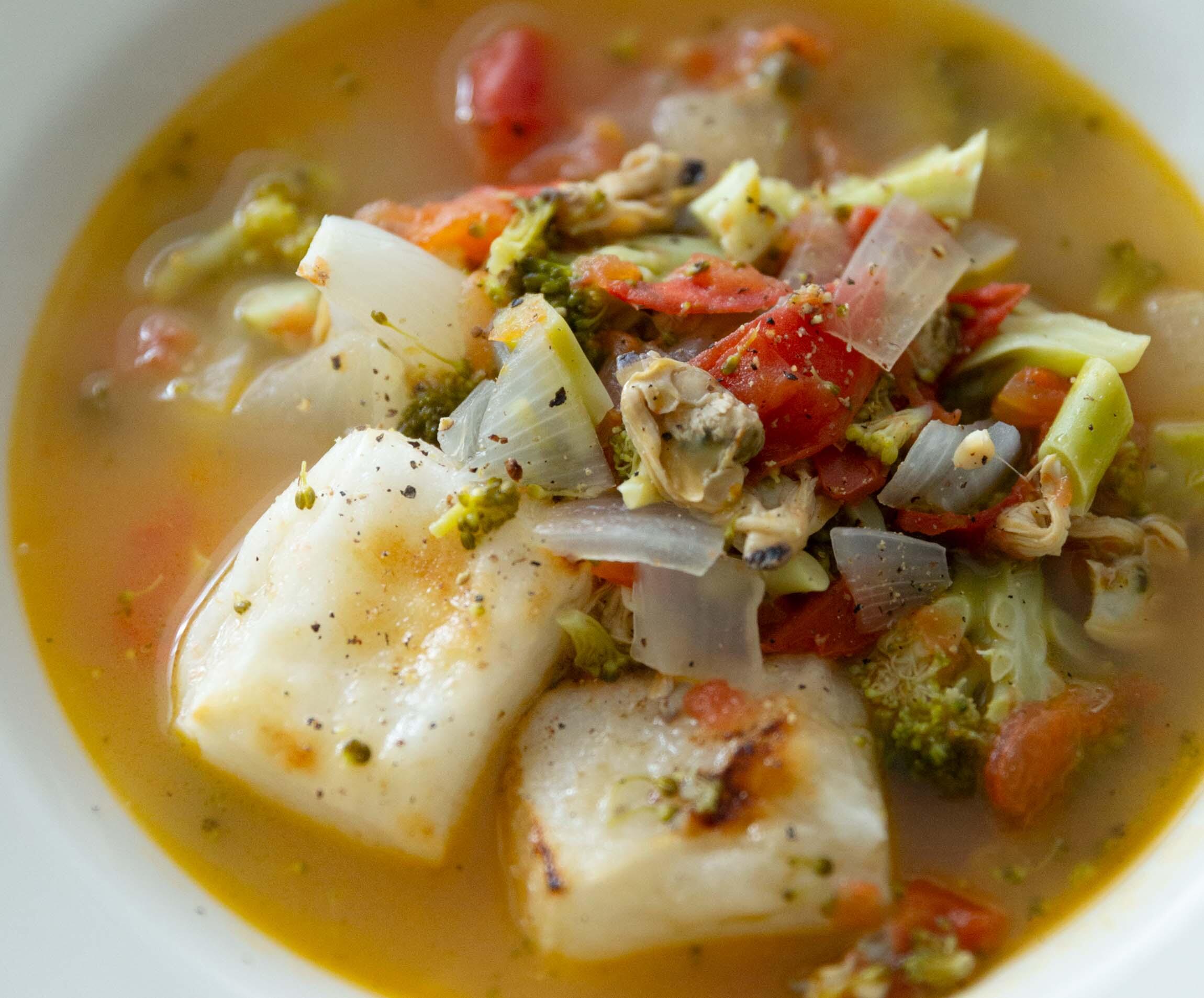 鍋にオリーブオイルを中火で熱し、ブロッコリーと玉ねぎを炒める。玉ねぎが透き通ってきたらあさり水煮を汁ごと加え、トマト、白ワイン、水を加える。ひと煮立ちしたらアクを除き、塩、胡椒で味を調える。