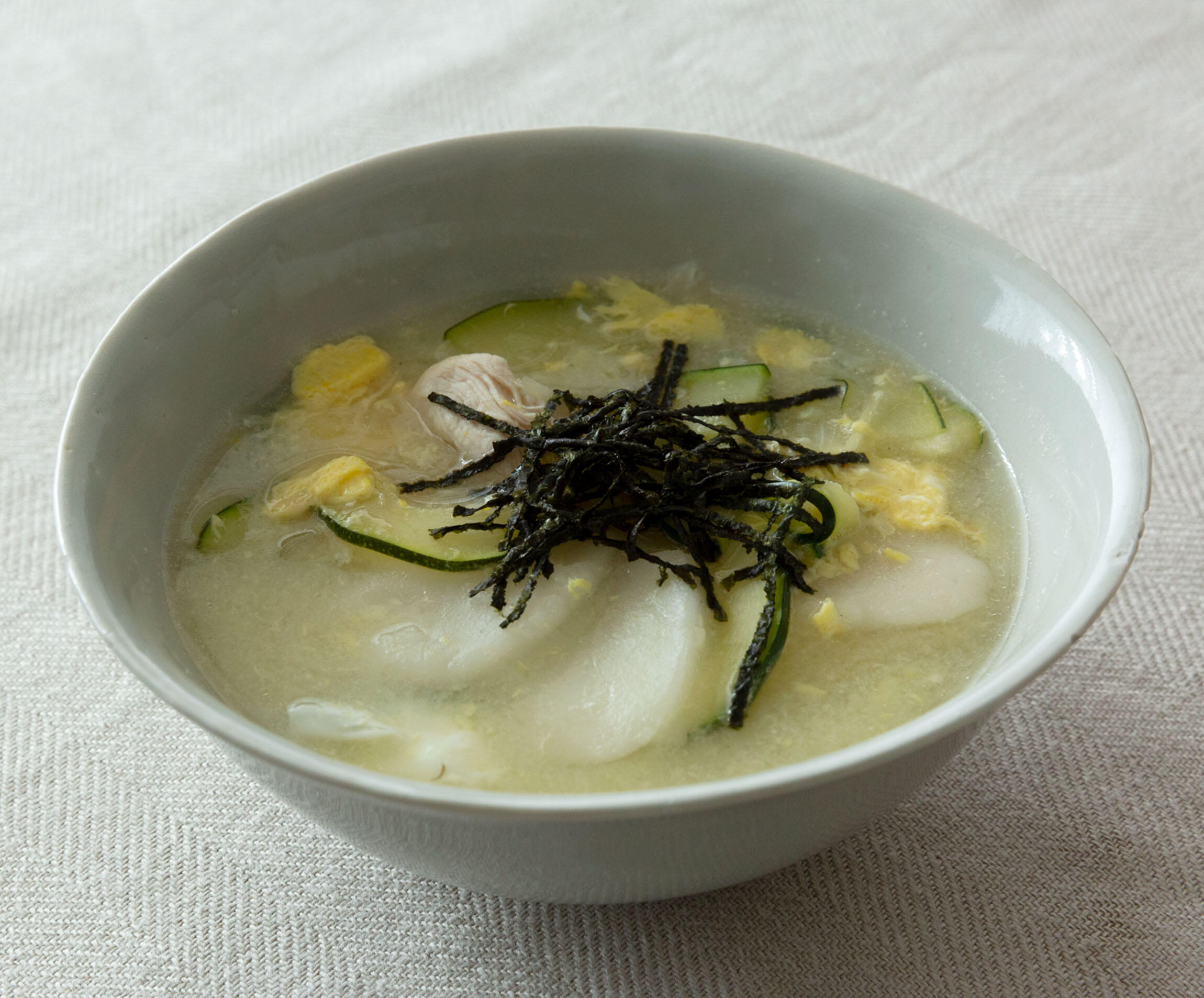 鍋に煮干しだし、酒を入れて中火にかける。煮立ったらトック、玉ねぎ、ズッキーニを加える。ひと煮立ちしたら弱火にしてささみを加え、蓋をして2分煮る。