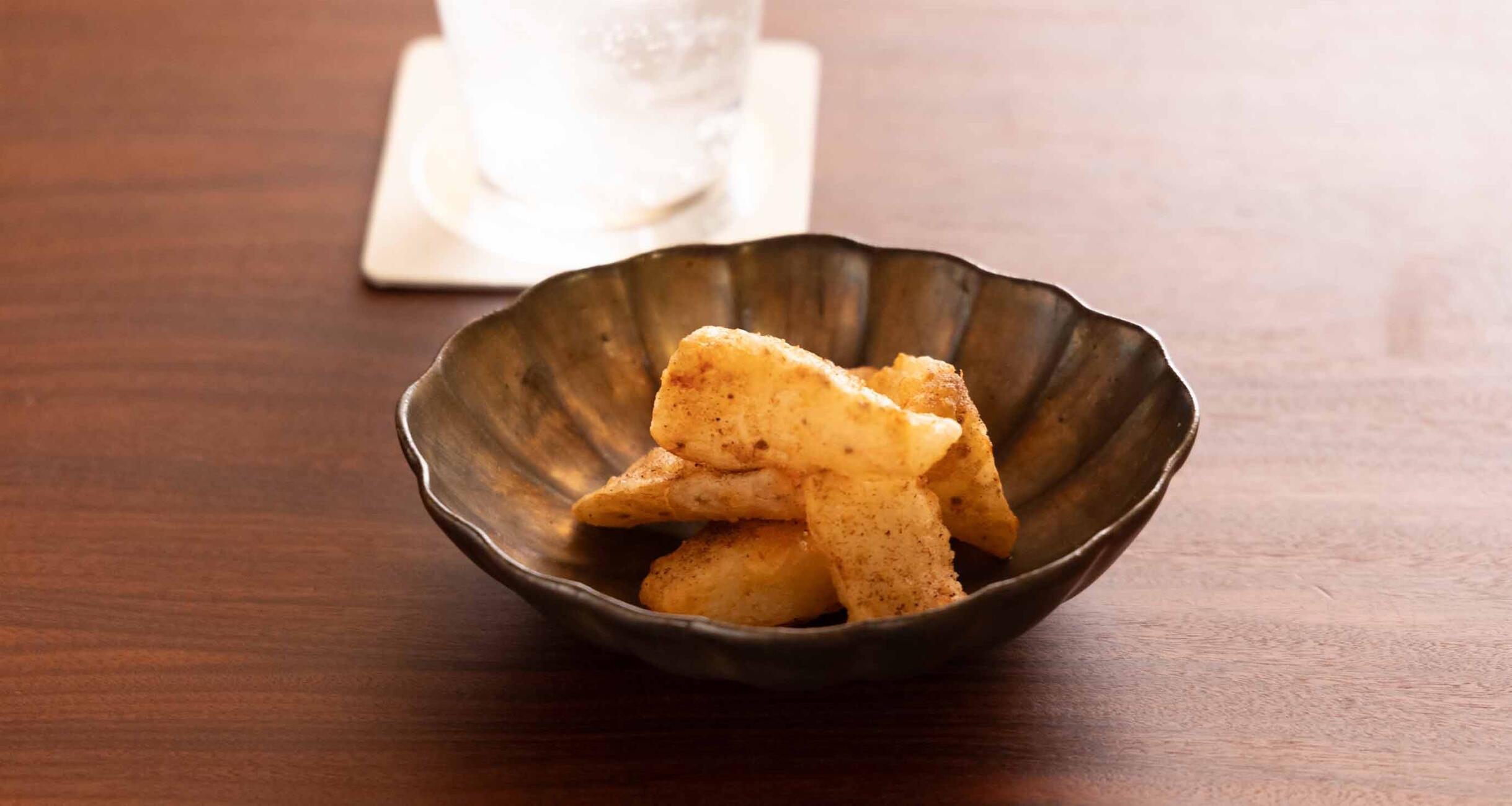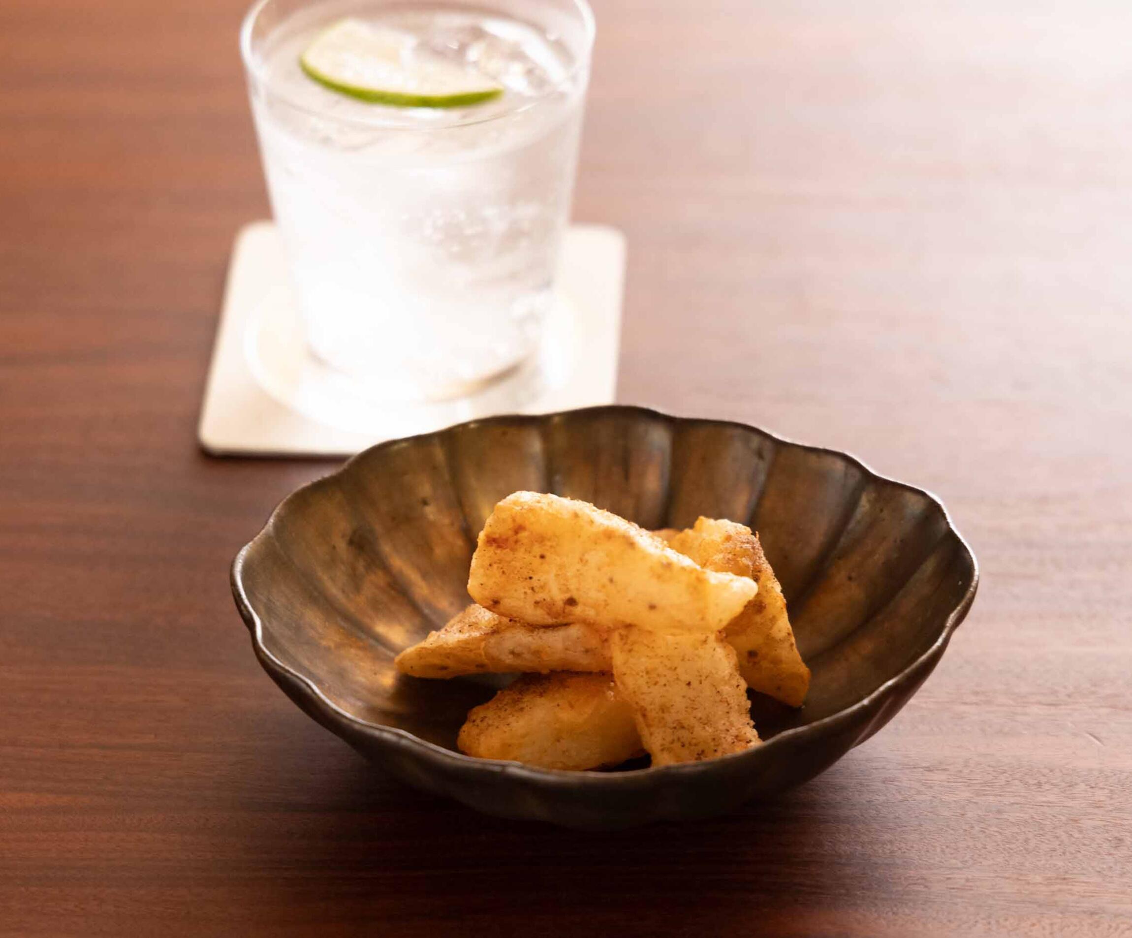 にんにくの風味がホクホクの長芋にしみて、ちょっとポップなお味。ライムを効かせた爽やかなジンソーダと合わせると油やにんにくの味がリセットされ、長芋にのびる箸が止まりません。