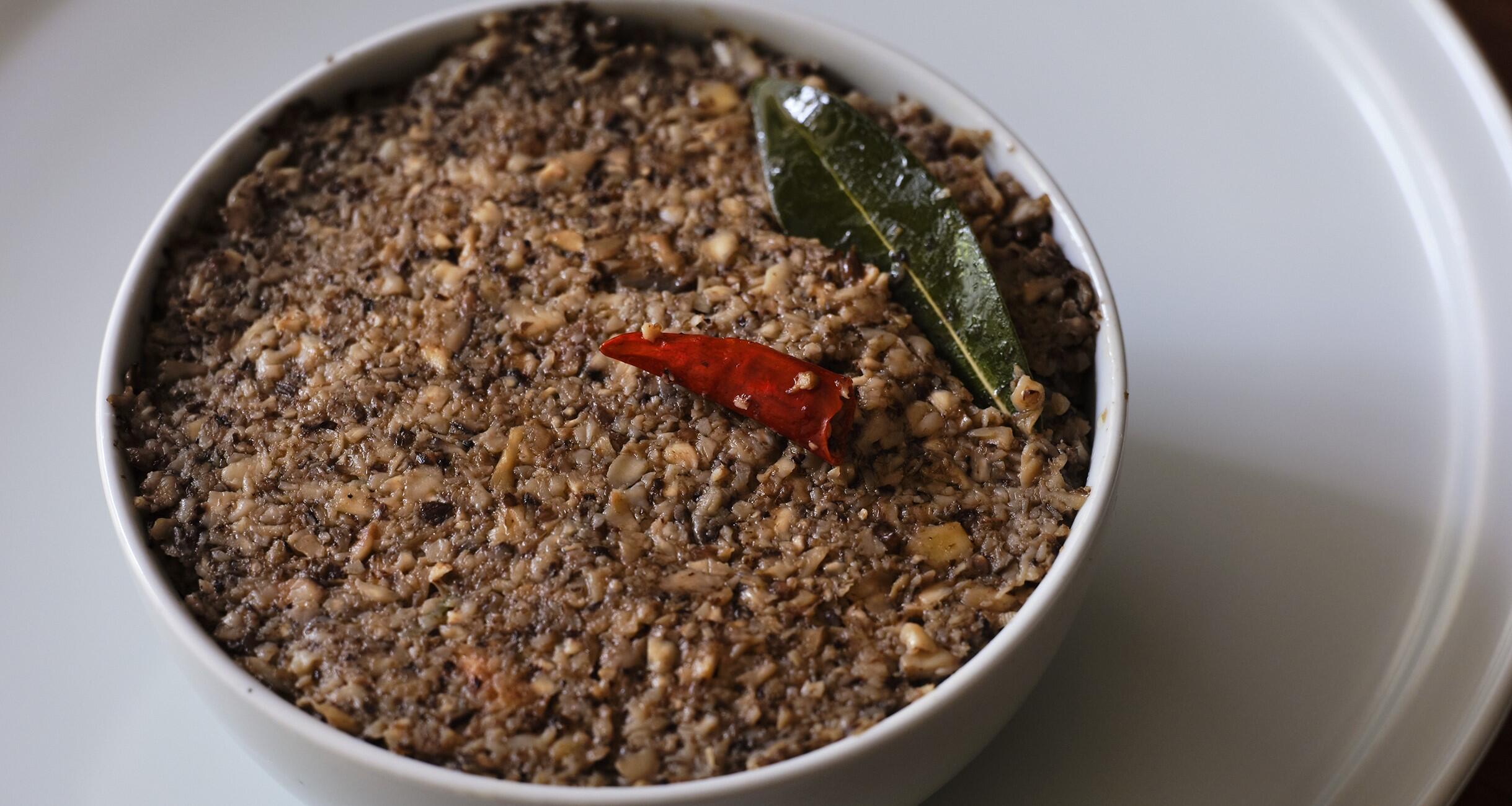 深めのフライパンに唐辛子とオリーブオイル、ローリエを入れて火にかけ、②を加えて焦がさないように混ぜながら弱めの中火でじっくりと炒める。鍋が薄手だったり、きのこの水分が少なかったりすると焦げやすいので、水を少々加えましょう。